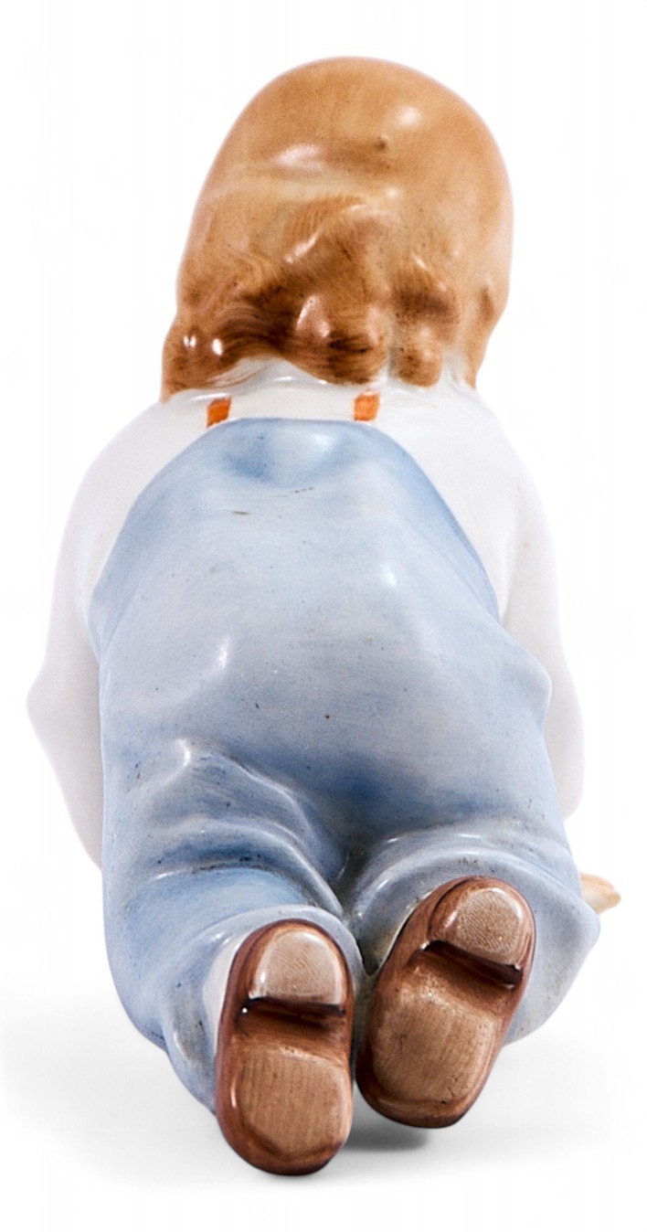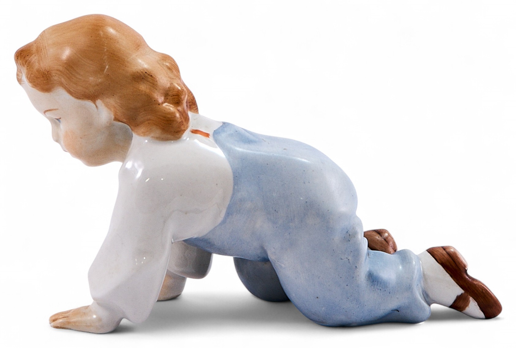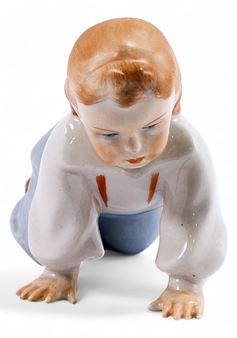 Скульптура маленького мальчика ползущего на четвереньках. На основании надпись синей краской: 25. Данная фигура была изготовлена на фарфоровой фабрике Акуинкум (Aquincum) в последней четверти XX в. Фарфоровая фабрика Акуинкум (Будапешт, Венгрия). Существовала на протяжении XX в. Изготавливала наиболее популярные венские копии фарфоровых изделий, чайные и кофейные сервизы, тарелки и кубки, декоративный фарфор, фарфоровые статуэтки, вазы, сувенирную продукцию. Наиболее интересны и популярны скульптуры в национальных костюмах, обнаженные модели и жанровая скульптура детской тематики в духе советского наива.