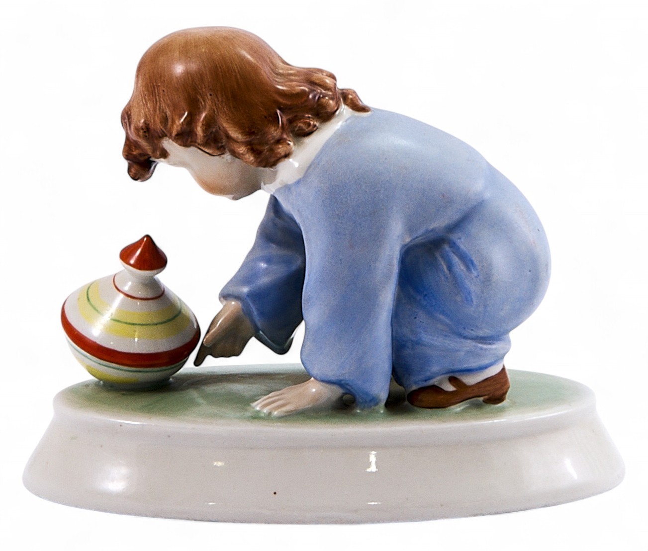 Скульптура маленького ребенка в голубом комбинезоне, присевшего рядом с полосатым волчком. Скульптура, вероятнее всего, была изготовлена на фарфорово-фаянсовой фабрике Жолнаи в 1970-х гг. Фарфорово-фаянсовая мануфактура Жолнаи была создана Миклошом Жолнаи (1800 - 1880) в Псч (Венгрия) для производства фаянса в 1853г. В 1863 году, его сын,