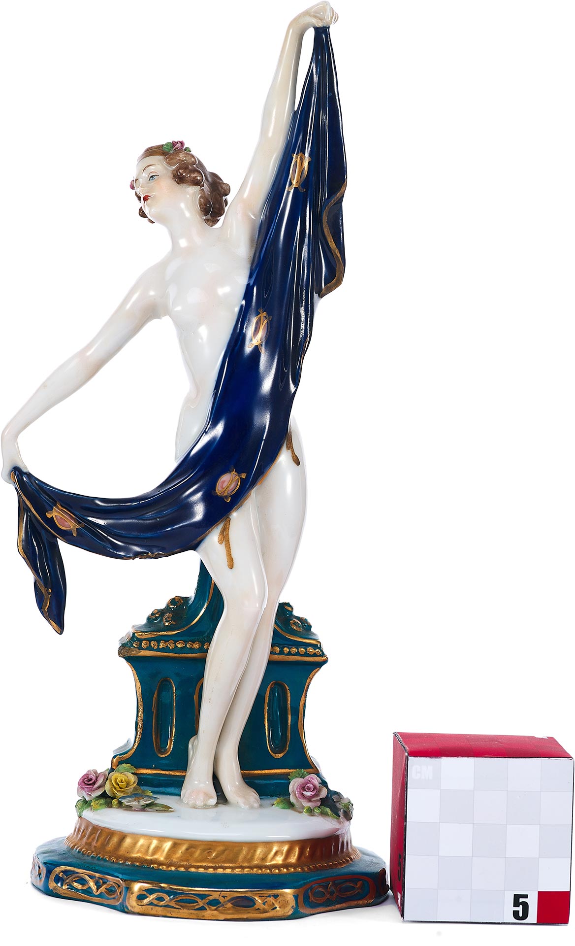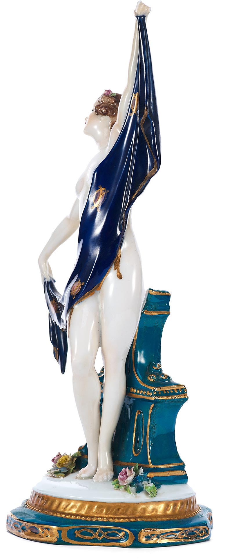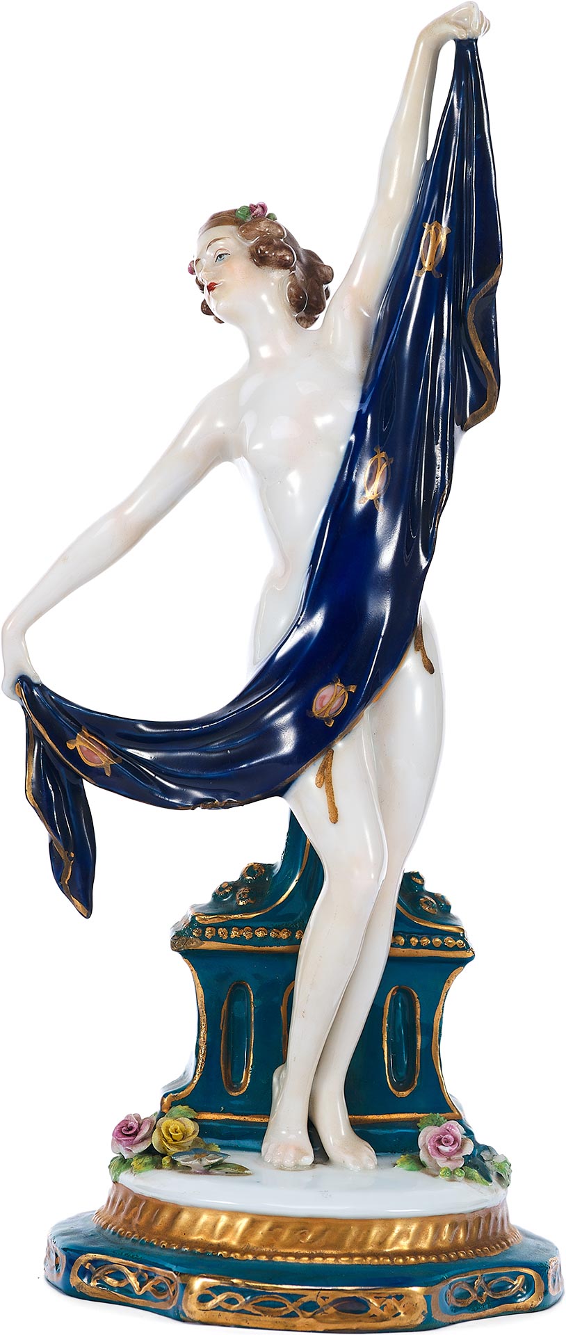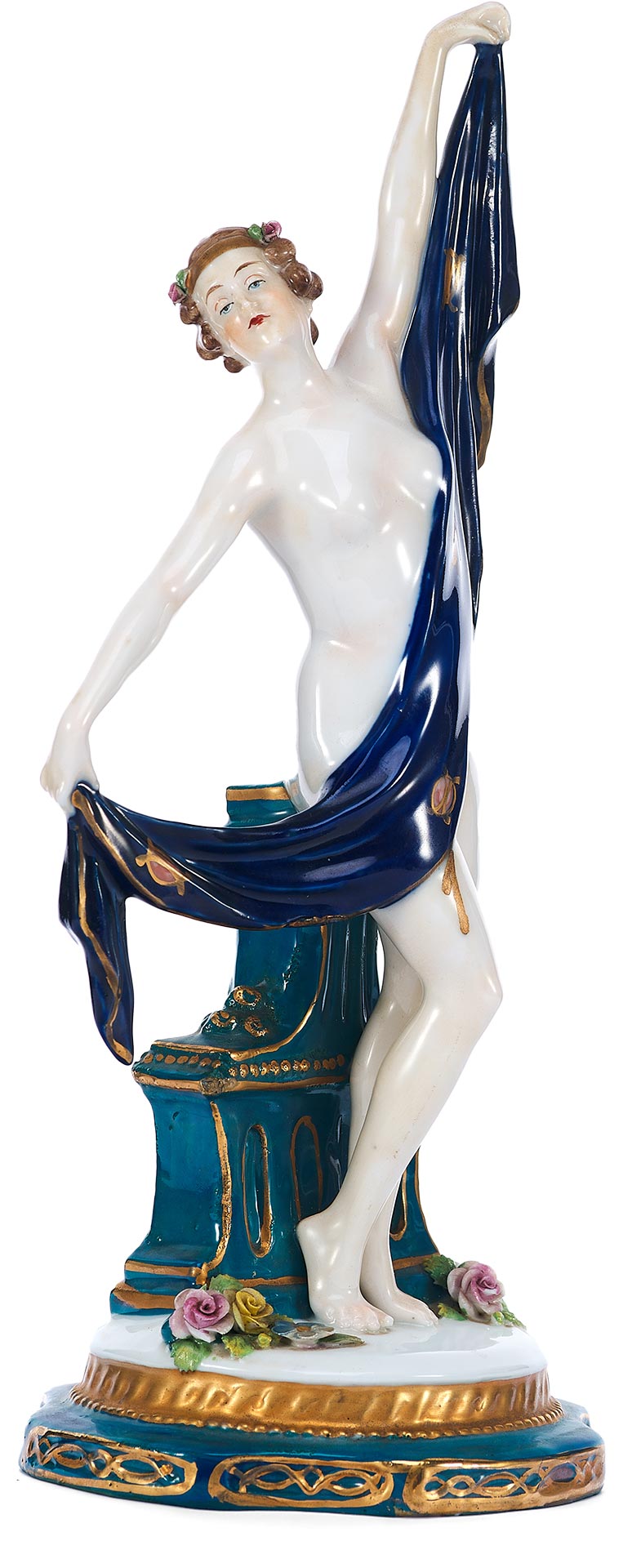 Перед нами декоративная фарфоровая скульптура «Обнажённая», выполненная на рубеже XIX–XX веков на мануфактуре E. & A. Müller в Рудольштадте (Германия). Фигура представляет собой аллегорический образ обнажённой молодой женщины, изящно удерживающей тёмно-синюю драпировку. Благодаря утончённой пластике и мягкости линий образ приобретает черты идеализированной женственности, типичной для декоративной скульптуры переходного периода от неоклассицизма к модерну.