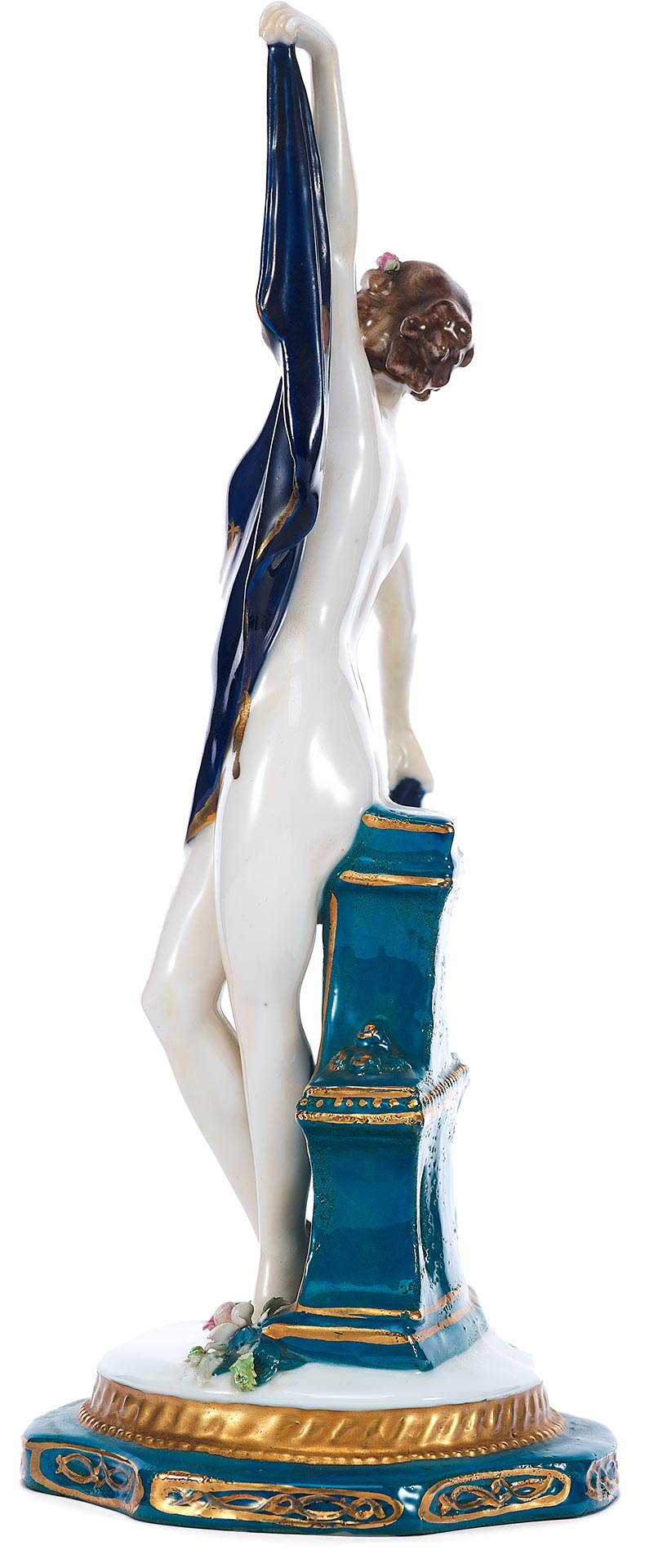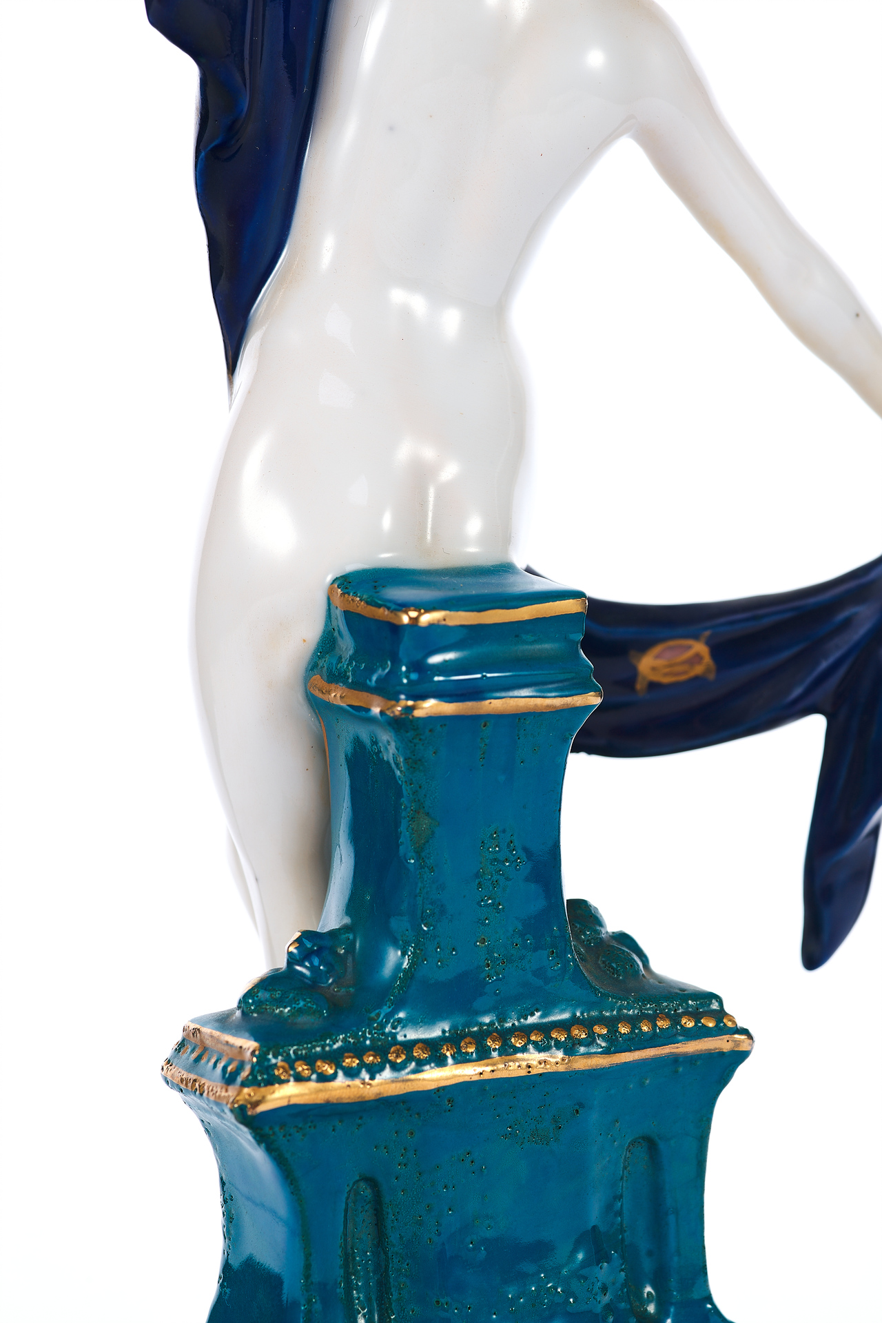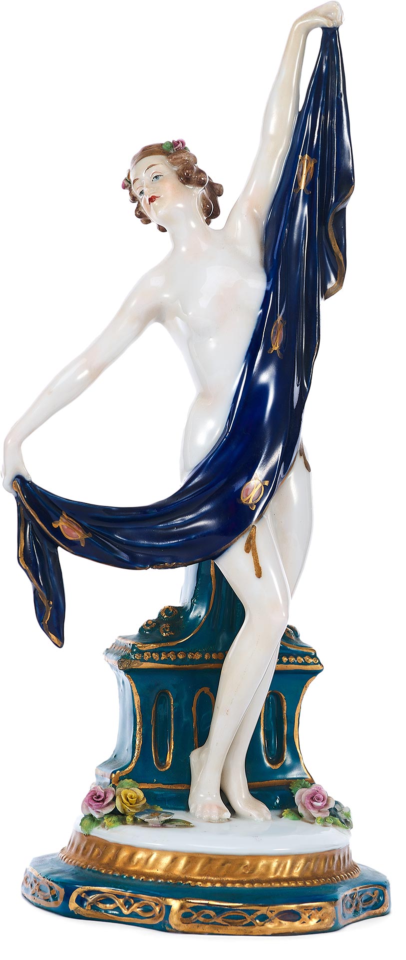 Перед нами декоративная фарфоровая скульптура «Обнажённая», выполненная на рубеже XIX–XX веков на мануфактуре E. & A. Müller в Рудольштадте (Германия). Фигура представляет собой аллегорический образ обнажённой молодой женщины, изящно удерживающей тёмно-синюю драпировку. Благодаря утончённой пластике и мягкости линий образ приобретает черты идеализированной женственности, типичной для декоративной скульптуры переходного периода от неоклассицизма к модерну.