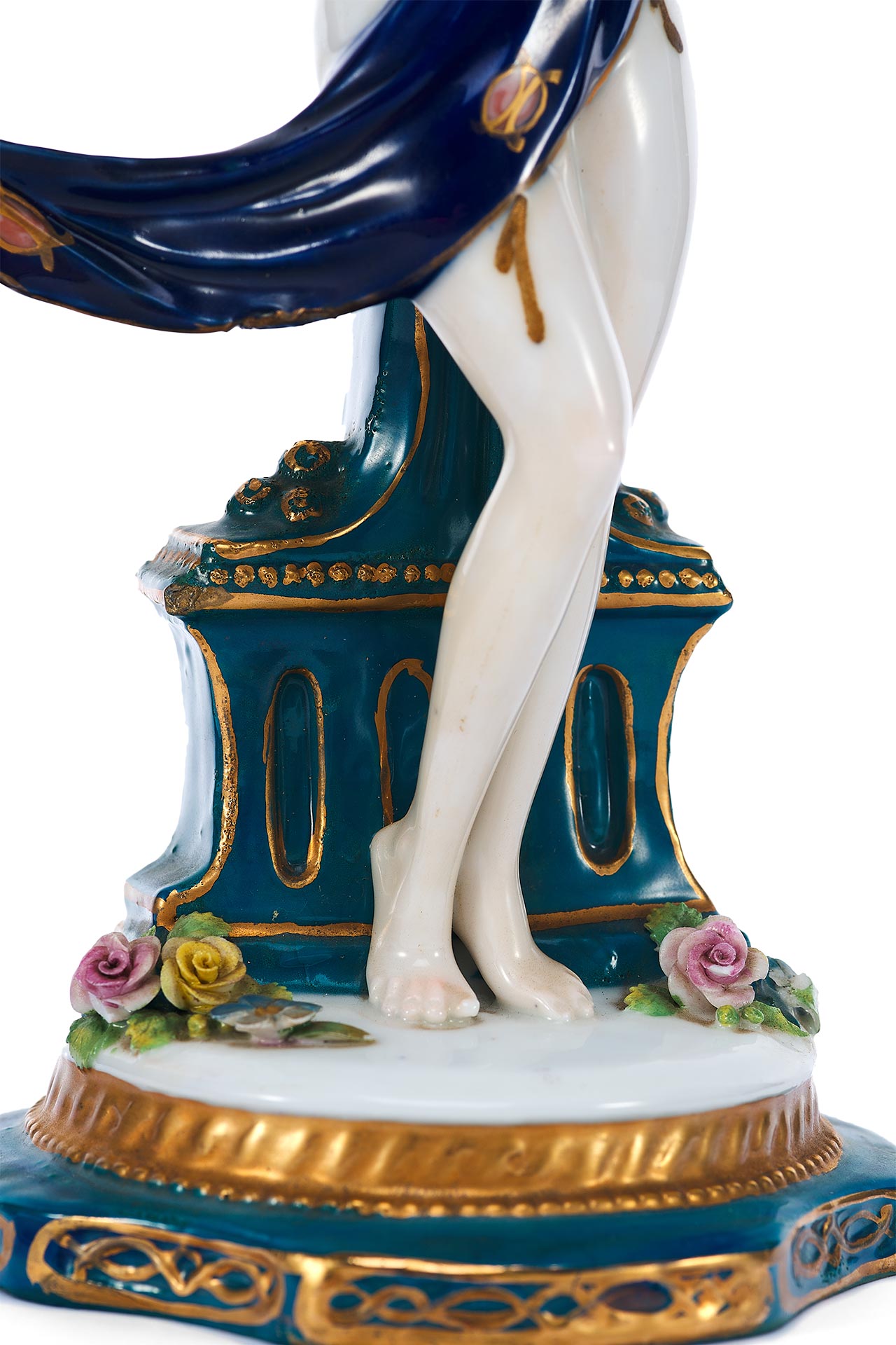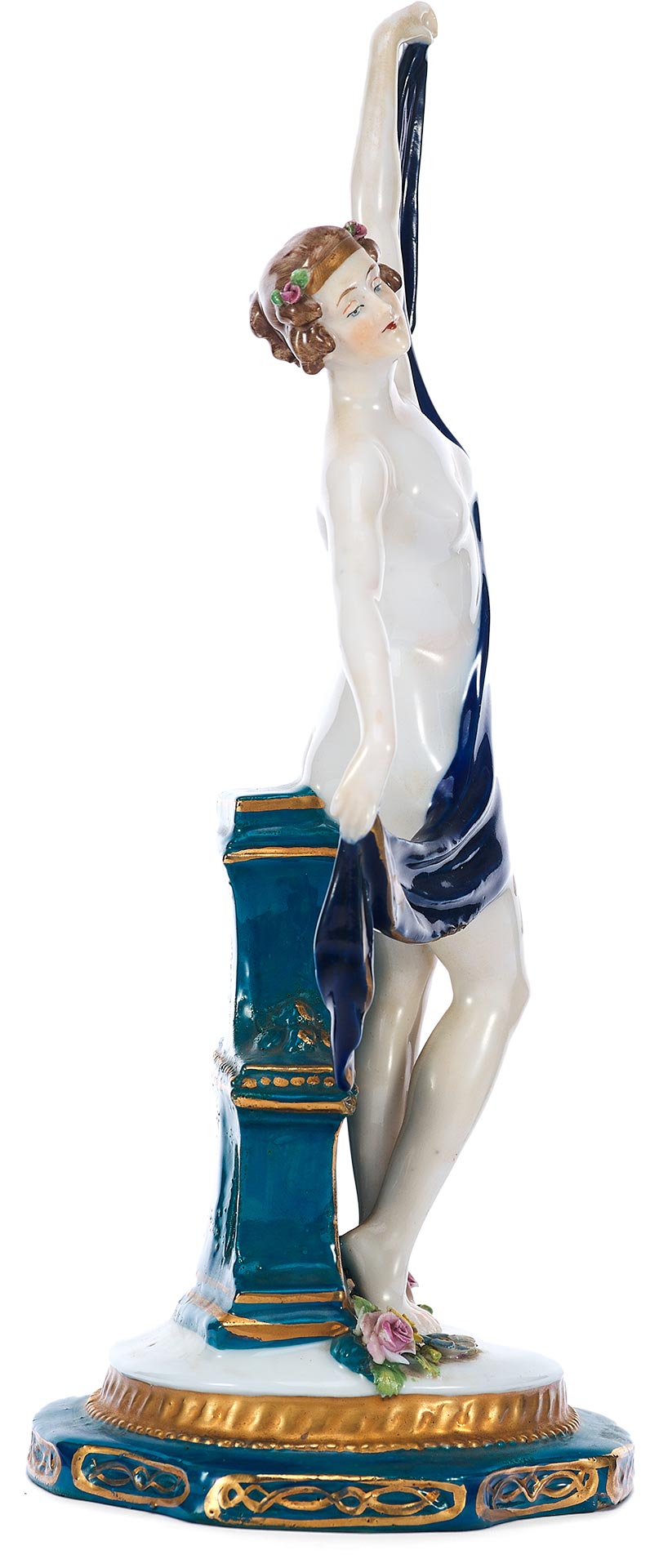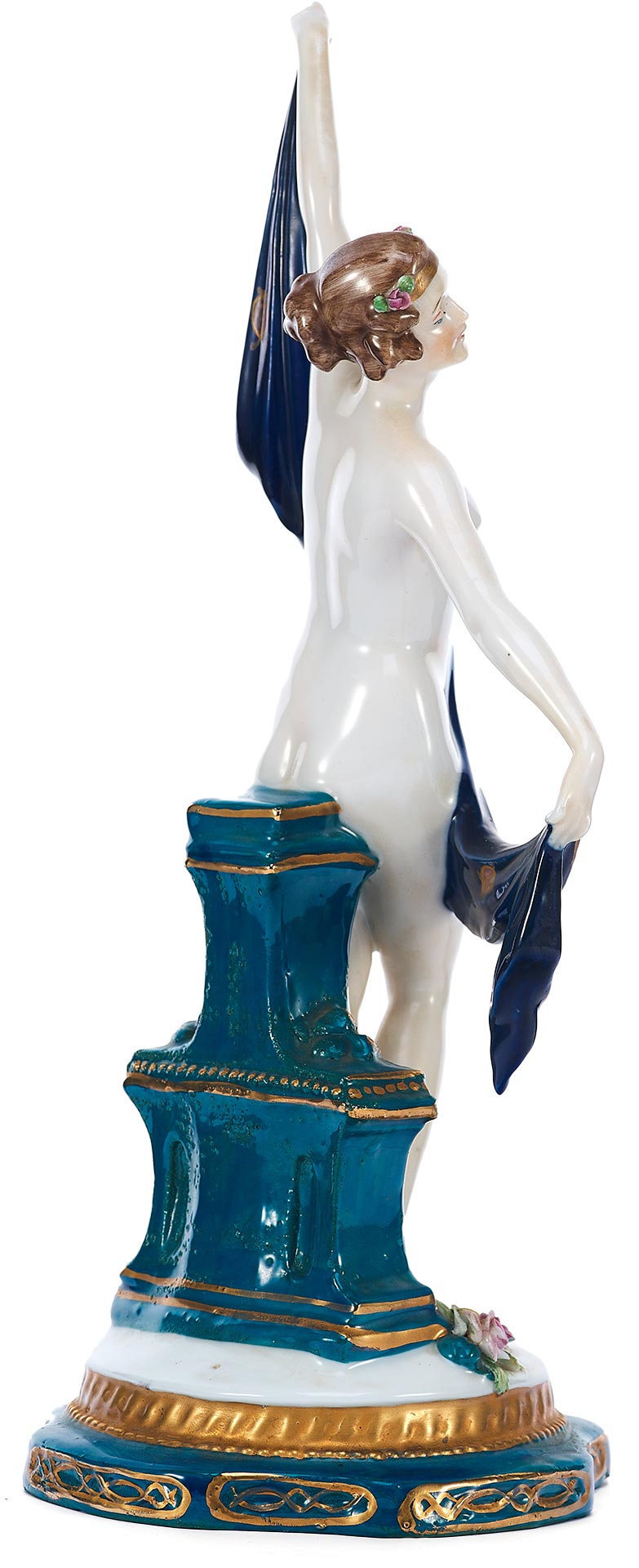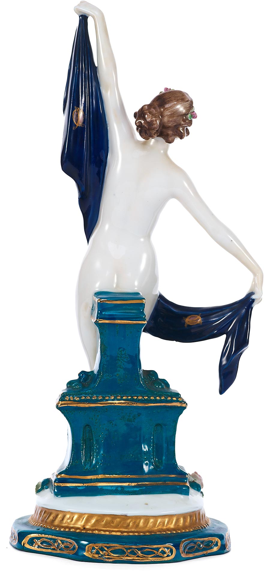 Перед нами декоративная фарфоровая скульптура «Обнажённая», выполненная на рубеже XIX–XX веков на мануфактуре E. & A. Müller в Рудольштадте (Германия). Фигура представляет собой аллегорический образ обнажённой молодой женщины, изящно удерживающей тёмно-синюю драпировку. Благодаря утончённой пластике и мягкости линий образ приобретает черты идеализированной женственности, типичной для декоративной скульптуры переходного периода от неоклассицизма к модерну.