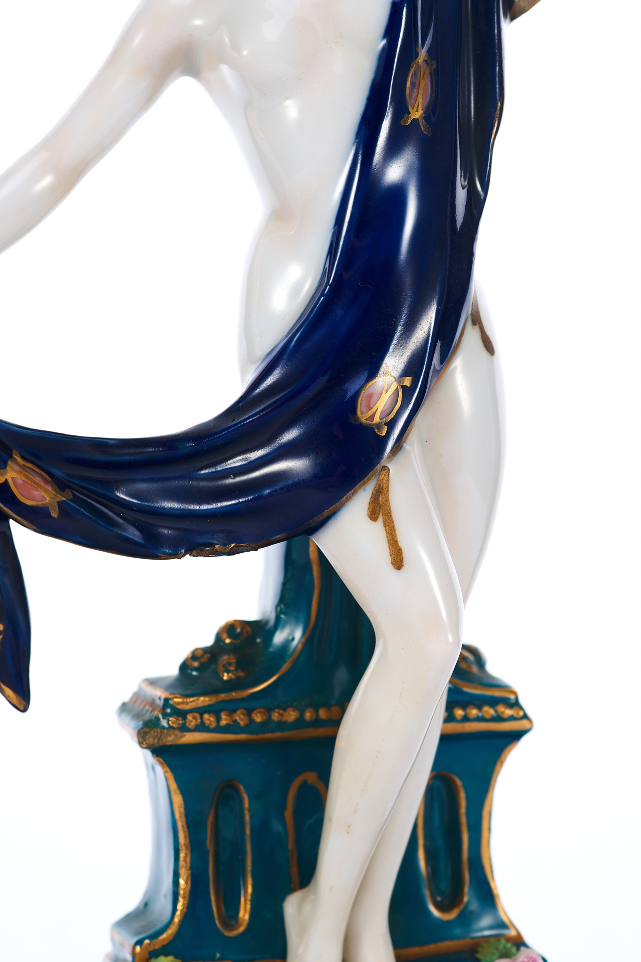 Художественный стиль данной скульптуры представляет собой переход от неоклассики к ар-нуво, что отражается в сочетании строгой анатомической точности с декоративной изощрённостью элементов, таких как текстильная драпировка и цветочные венки. Скульптура имеет гербовую марку фабрики под имперской короной и номер модели, что подтверждает её аутентичность.
