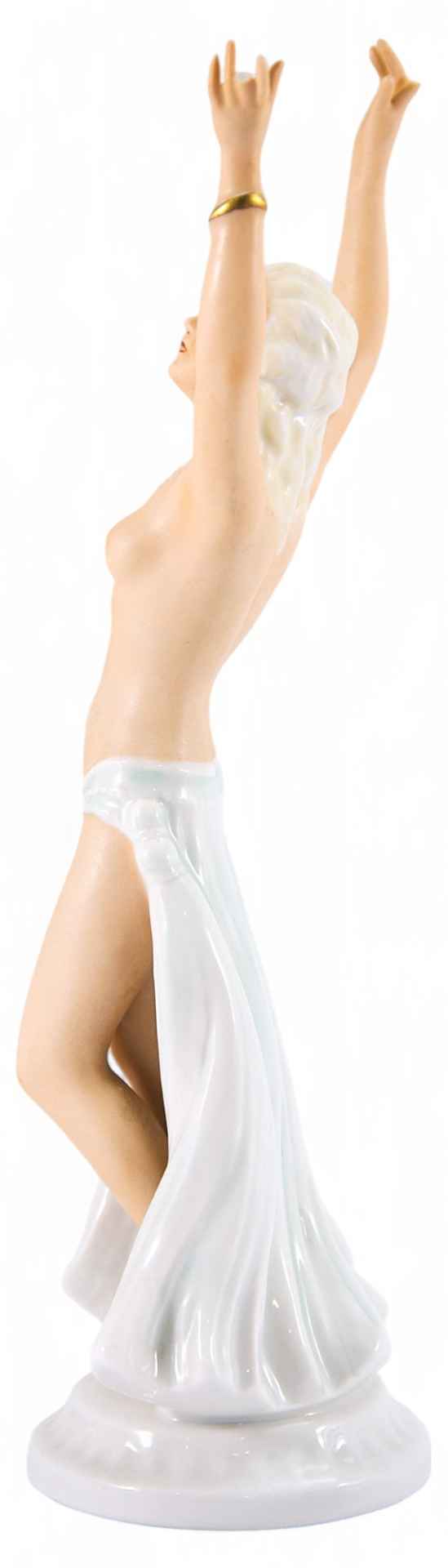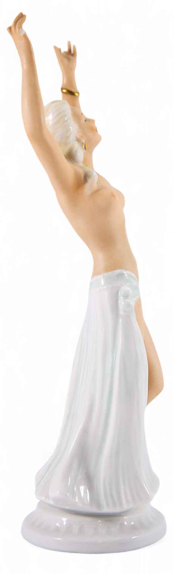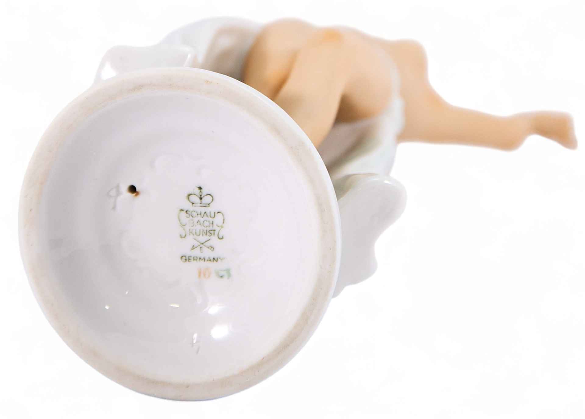 На дне статуэтки присутствует марка: обозначение «SCHAUBACH KUNST» под короной и над надписью «Germany». Такое клеймо ставилось на фабрике «Шаубах-Кунст» в Валлендорфе в период с 1953 по 1958 гг Статуэтка отличается высоким качеством материала, вниманием к проработке деталей и росписи, тонкостью отделки. Очаровательная девушка с белокурыми волосами изображена полуобнаженной; красоту женской фигуры подчеркивает струящийся шлейф; очень