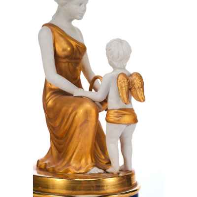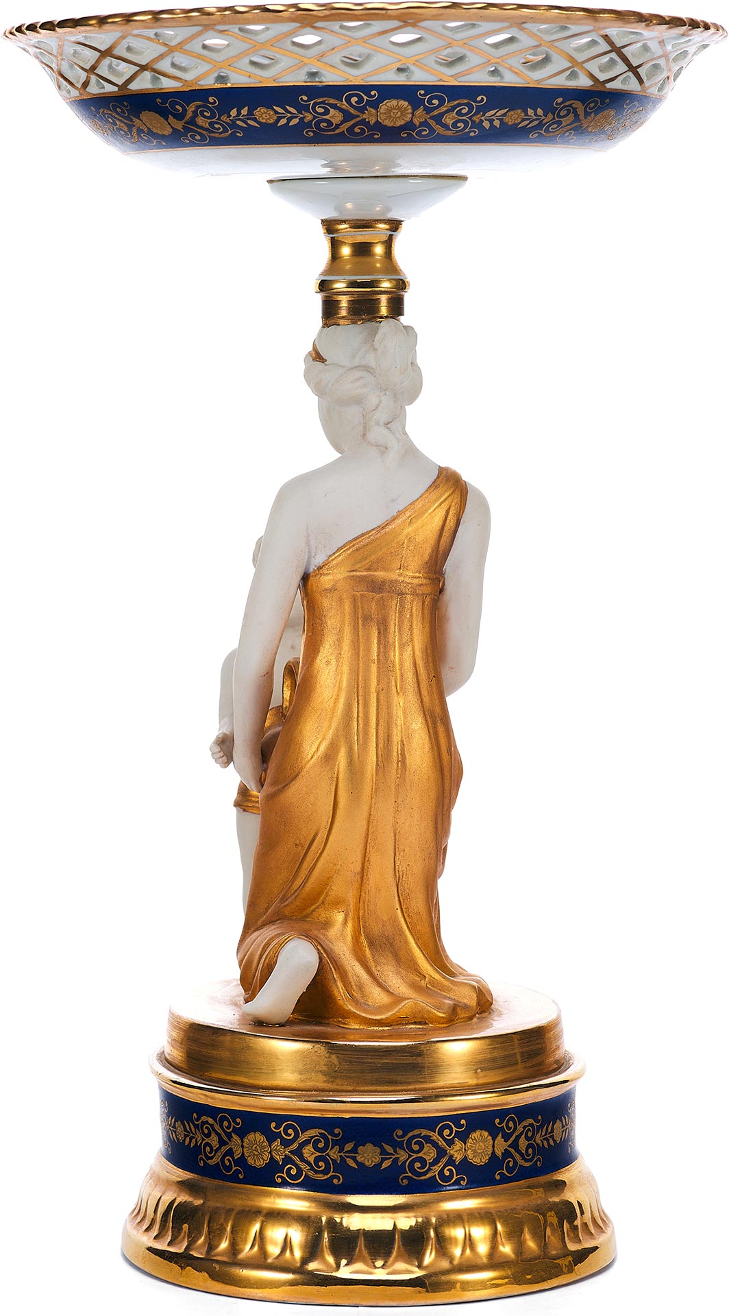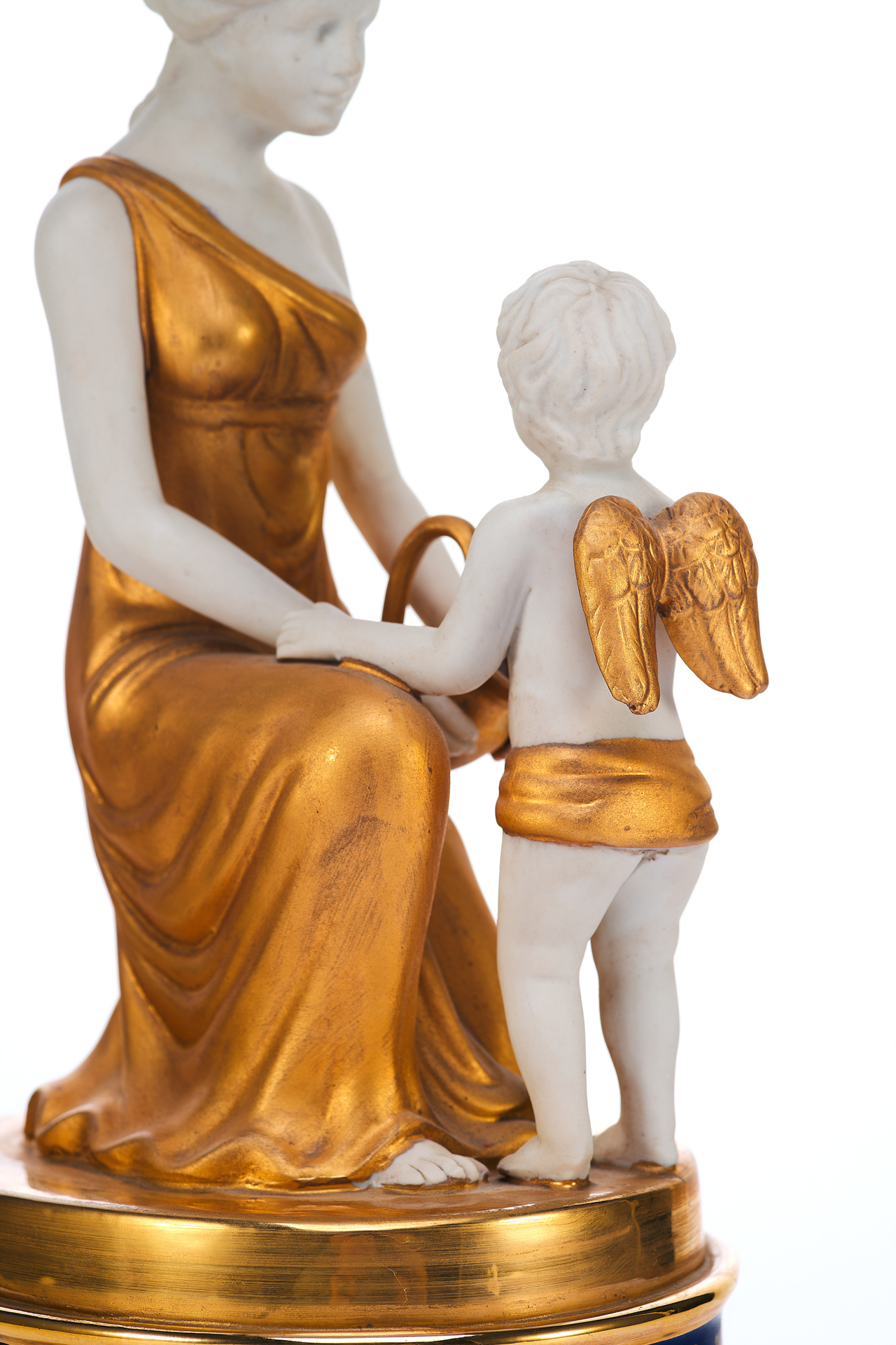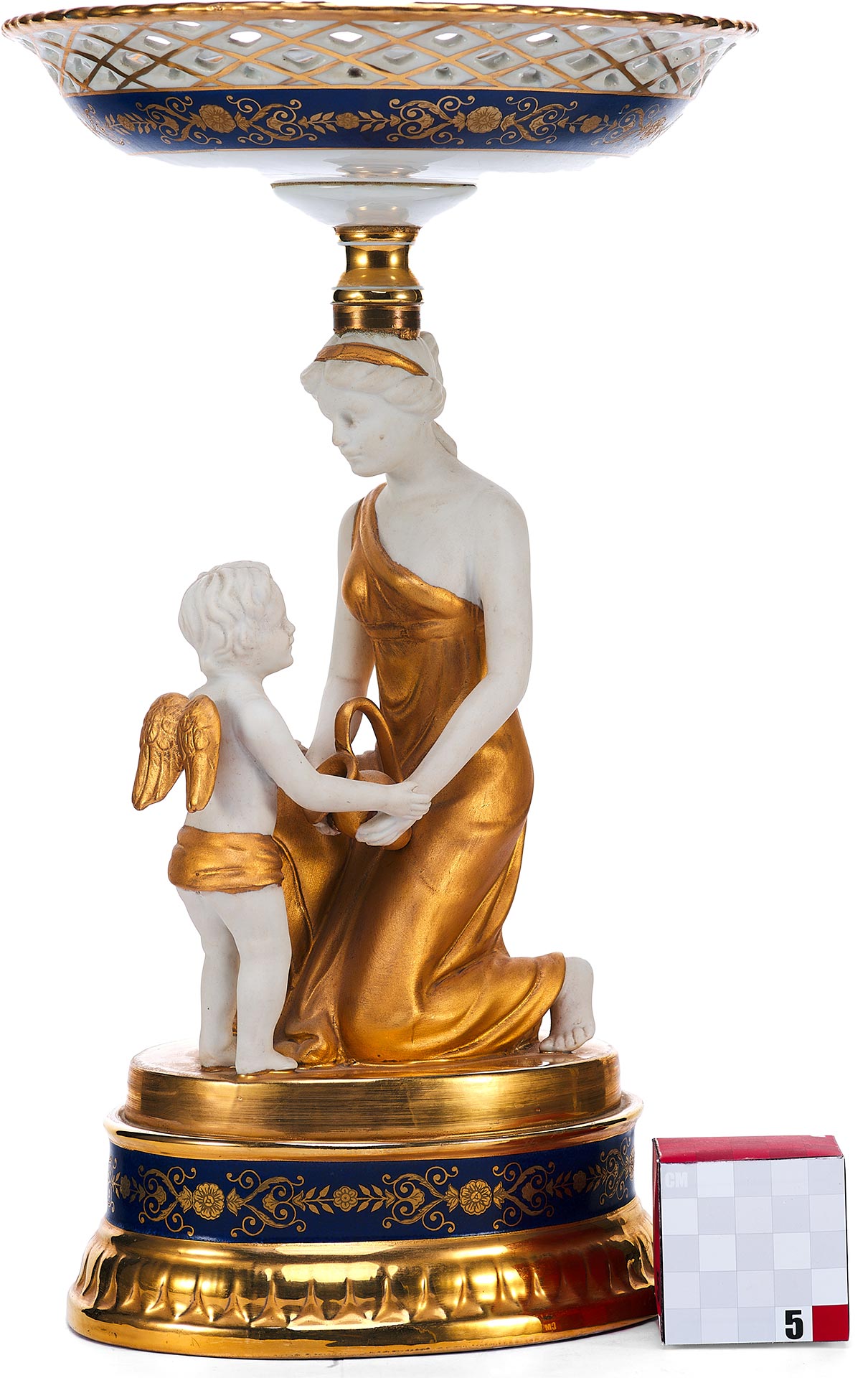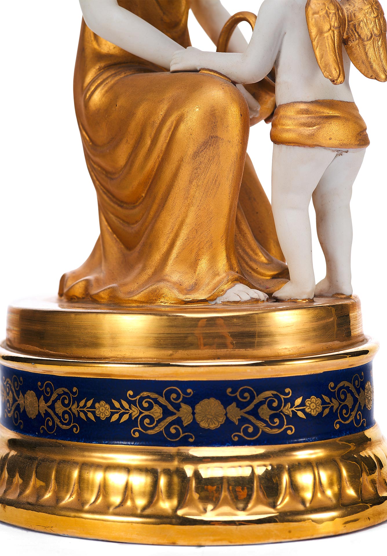 Декоративные особенности включают насыщенное золочение одежд и крыльев фигур, контраст между белым матовым и блестящим фарфором, а также кобальтовую подставку с золотым орнаментом, подчёркивающую парадность изделия. Высота вазы составляет 36,6 см.