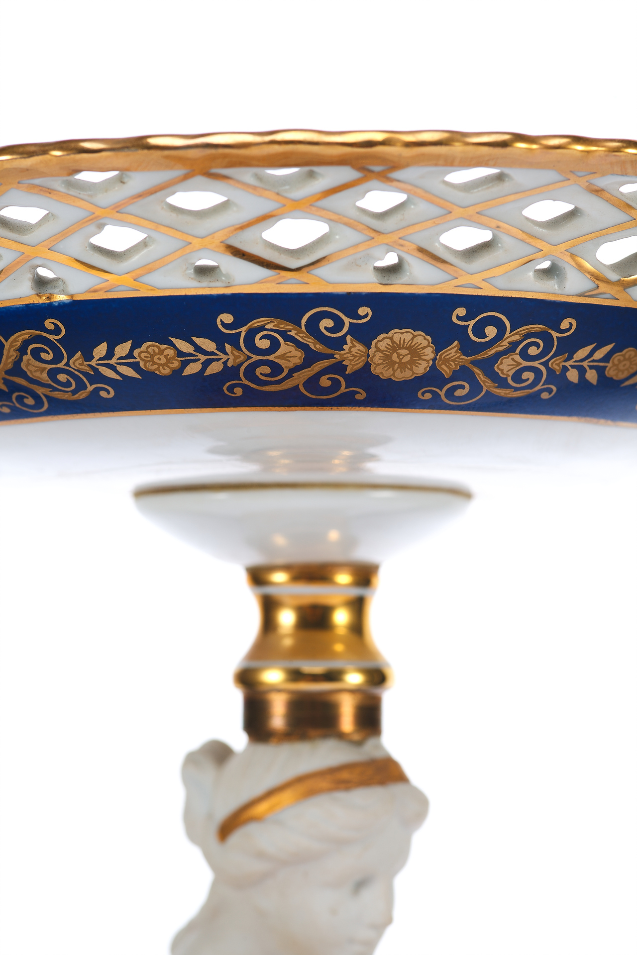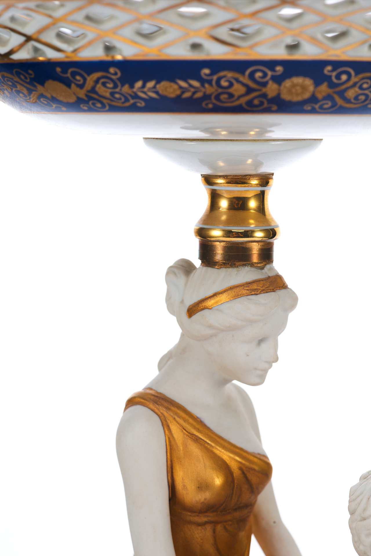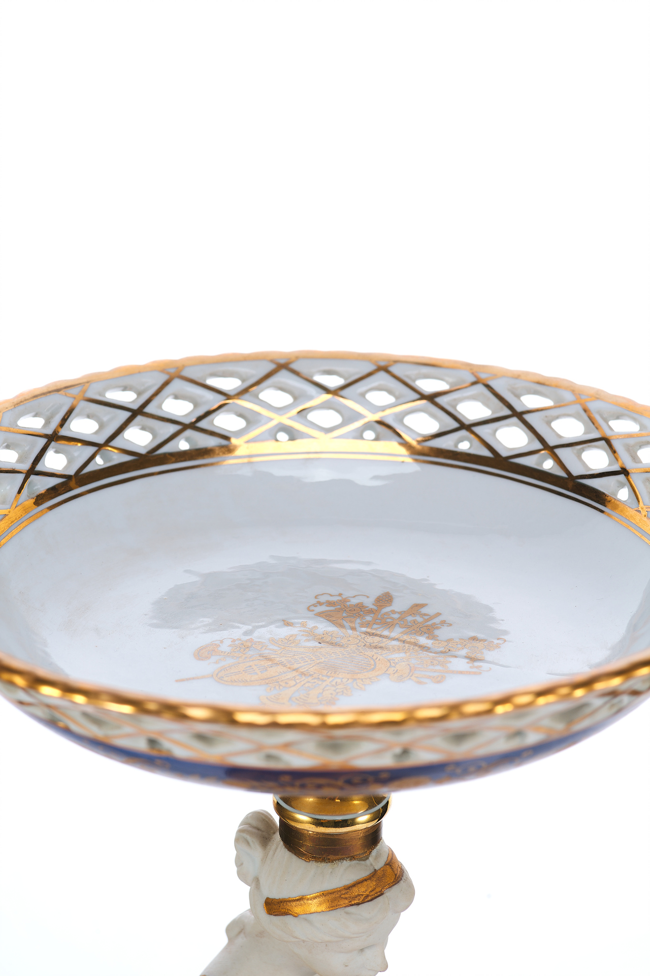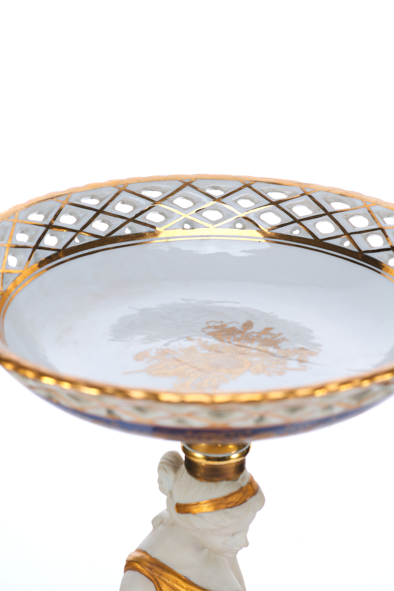 Изделие выполнено из фарфора с использованием деколи и золочения, что типично для декоративных предметов интерьера XX века. Внутренняя чаша вазы, венчающая композицию, оформлена ажурной решёткой и геометрическим узором с золотыми акцентами.