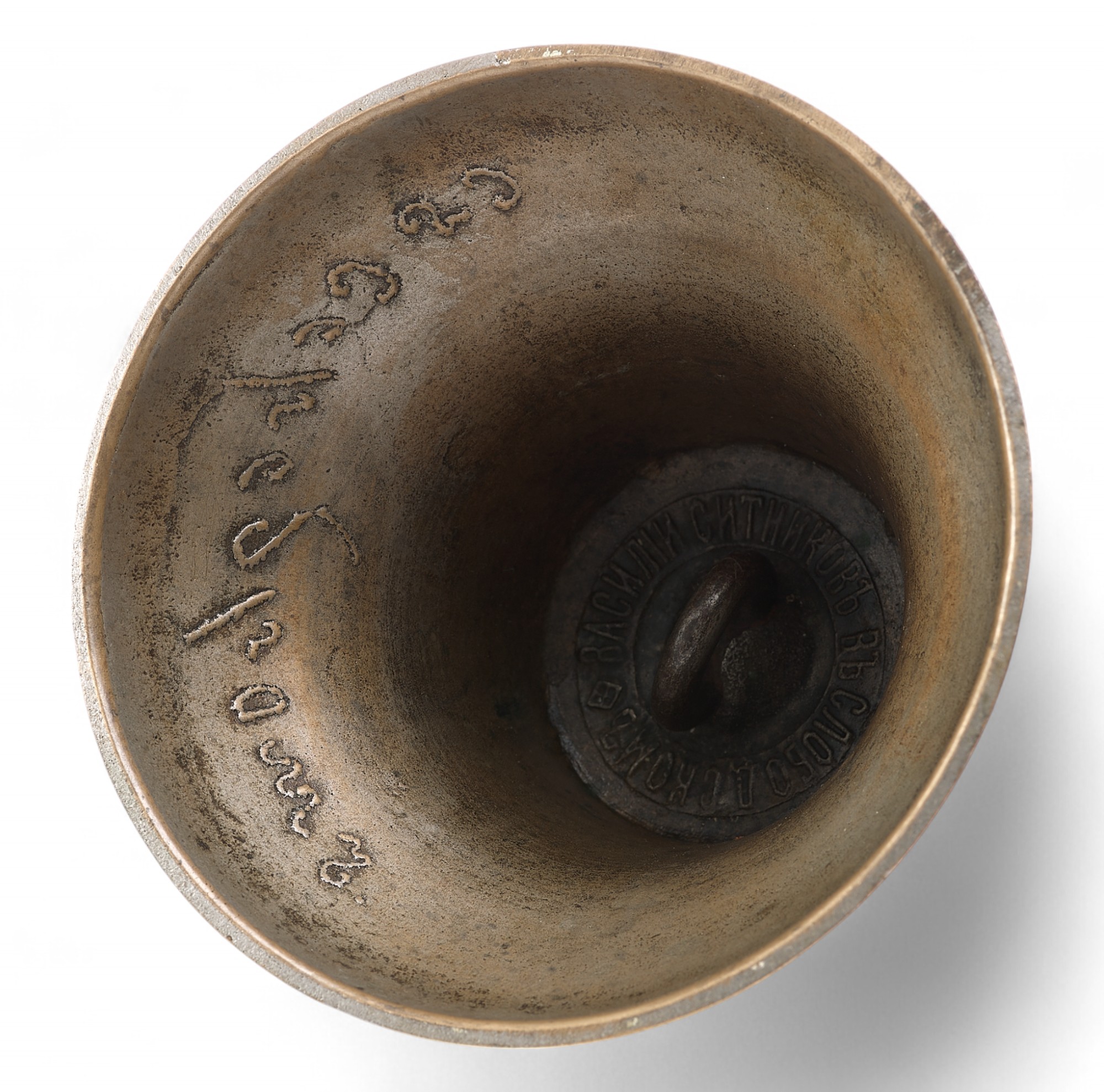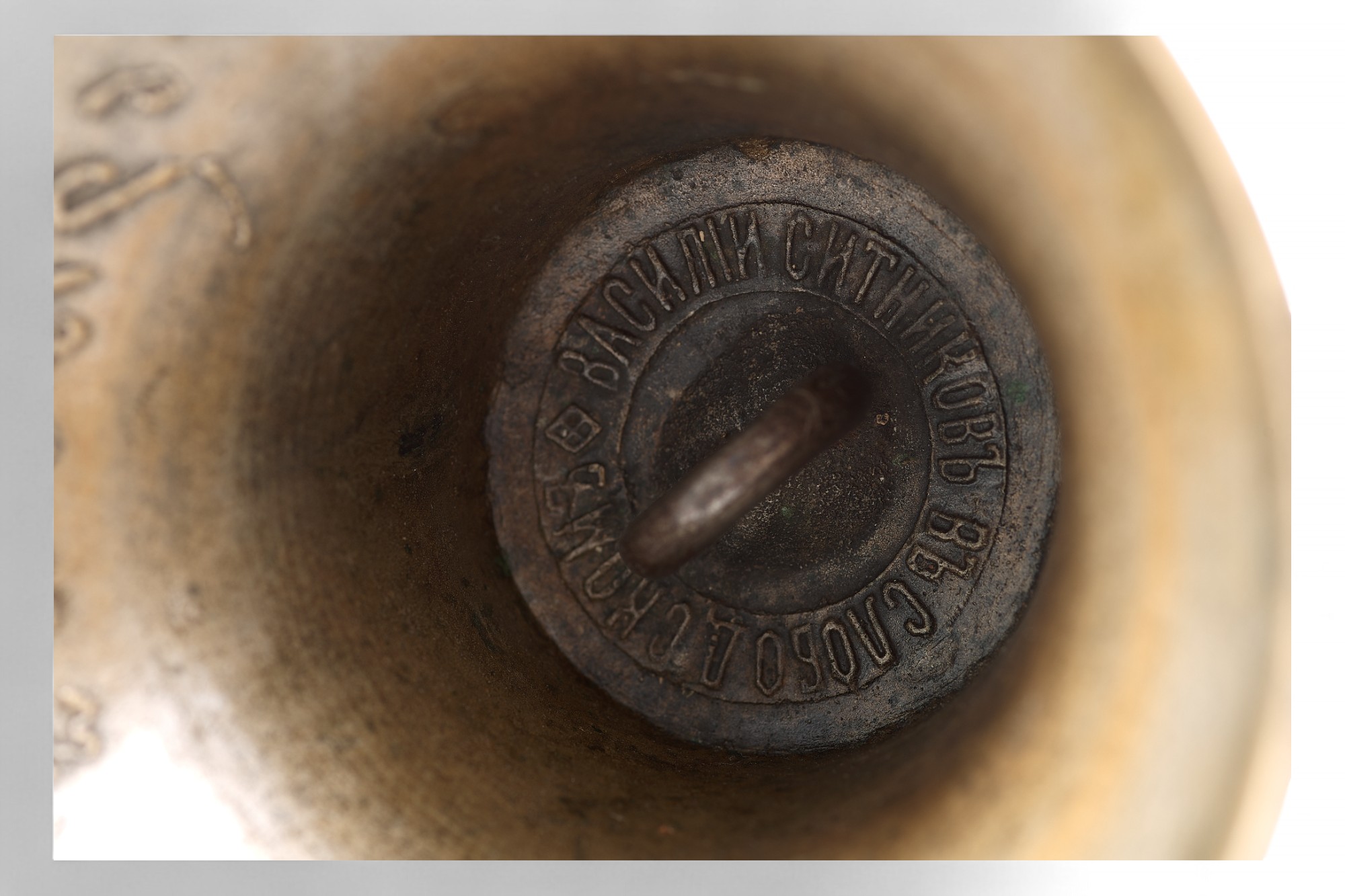 Колокольчик, отлитый мастером Василием Ситниковым второй половины XIX века, является предметом антиквариата и представляет значительную коллекционную ценность. Он был изготовлен в городе Слободском, Вятская губерния, и выполнен из бронзы с добавлением серебра, что подтверждается надписью «съ серебром» на корпусе.
