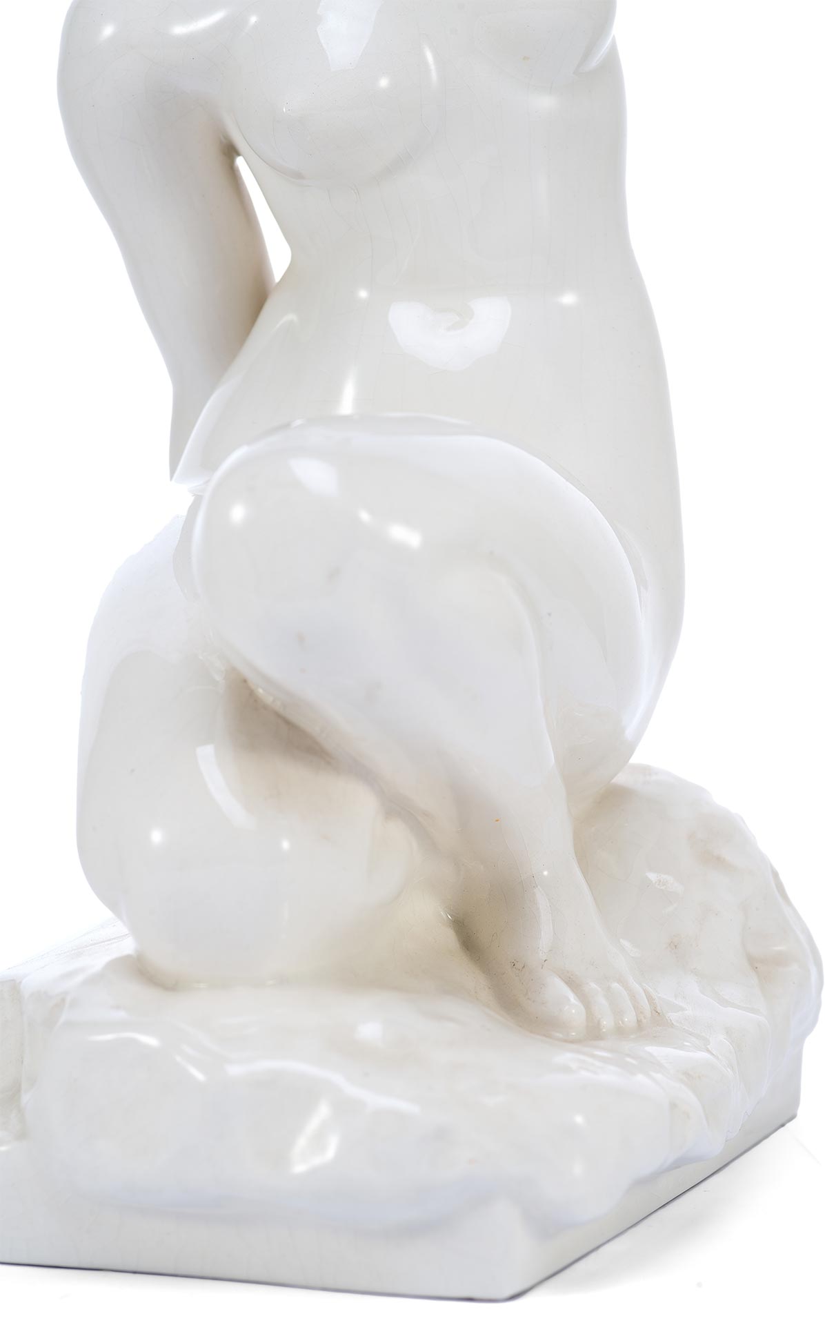 Скульптура выполнена из фаянса, покрытого гладкой прозрачной глазурью, что придаёт поверхности мягкий блеск и подчёркивает пластичность формы. Основная техника изготовления — формовка с последующей ручной доработкой. Скульптура монохромна, благодаря чему акцент сосредоточен на рельефе и анатомической точности.