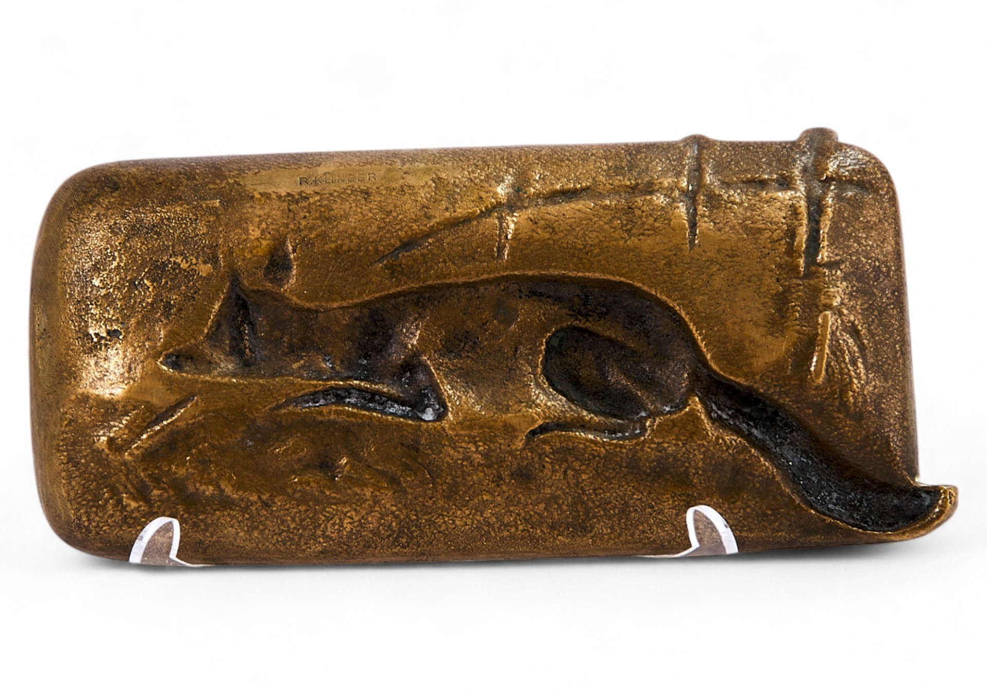Изделие было создано в Вене, Австрия, что подтверждает клеймо «R. KLINGER» на оборотной стороне. Венская бронза, к которой относится эта работа, известна своими детализированными миниатюрами и жанровыми сценами. В данной композиции изображена лиса, прижавшаяся к земле и выслеживающая добычу на фоне изгороди. Этот сюжет соответствует традиции анималистической скульптуры, развитой в австрийском и французском искусстве XIX – начала XX века.