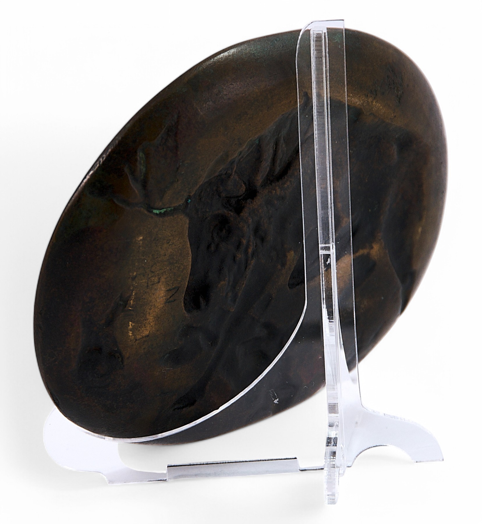 На оборотной стороне присутствует клеймо Берндорфской фабрики металлических изделий — «Berndorf N.». Эта фабрика, основанная в XIX веке, была известна своими изделиями из цветных металлов и принадлежала промышленной династии Круппов. Во второй половине XIX века предприятие активно развивалось под руководством Германа Круппа и Александра Шелера, а позже – Артура Круппа, что обеспечило фабрике мировую известность в производстве художественной бронзы и столовых приборов.