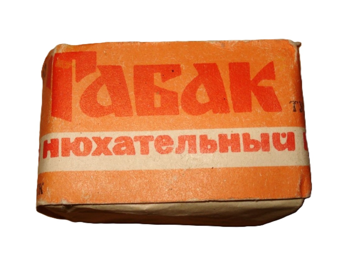 Упаковка нюхательного табака, произведенного на Моршанской табачной фабрике. Надпись на упаковке: МПП РСФСР «Ростабакпром» Табачная фабрика г. Моршанска, цена 10 коп., ТУ 18-РСФСР-662-81.
