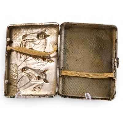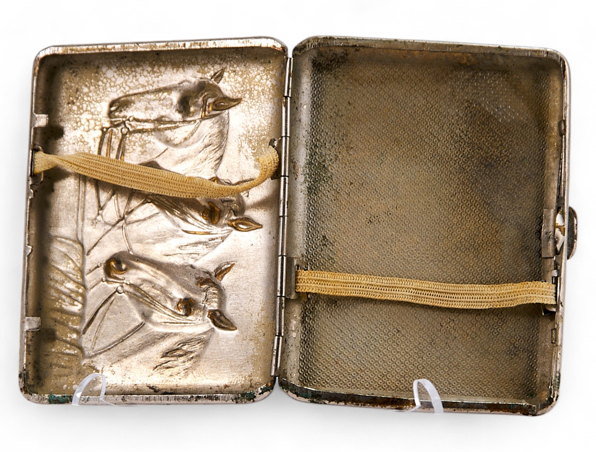 Портсигар с рельефным рисунком изображающим трех коней. Портсигар из серебра с таким рисунком начали изготавливать в