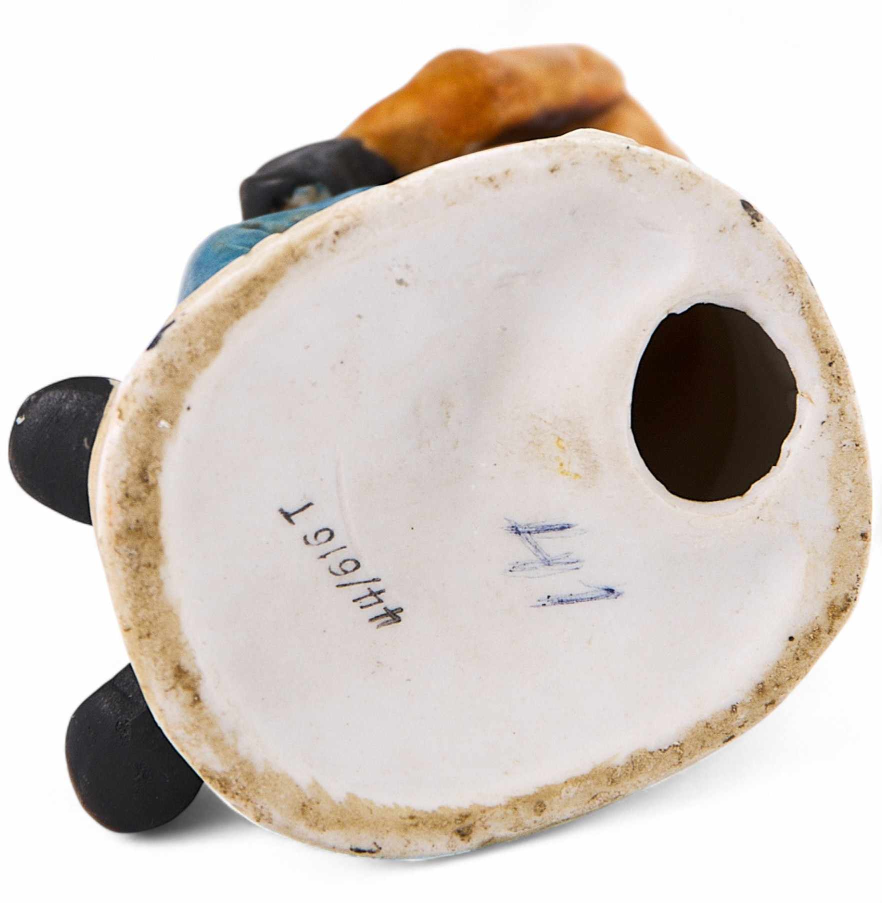 На донышке основания скульптуры серийный номер: 44/616 Т. Производство таких сувенирных фигурок людей и животных из раскрашенного бисквита (неглазурованный фарфор) довольно широко было распространено в немецком фарфоровом