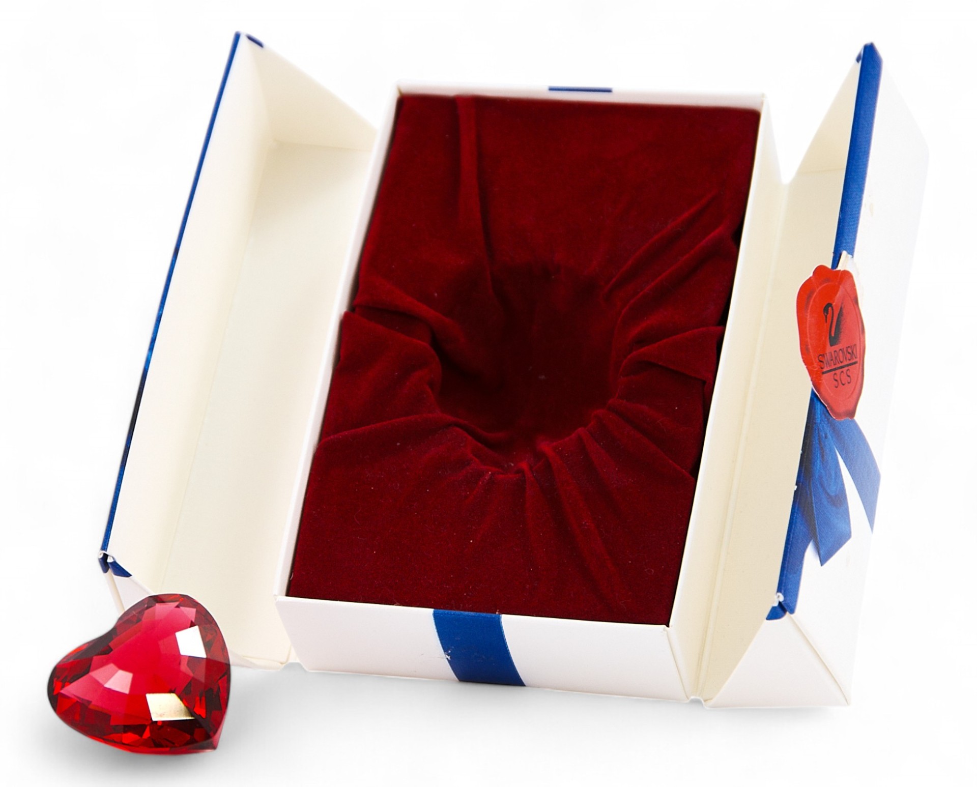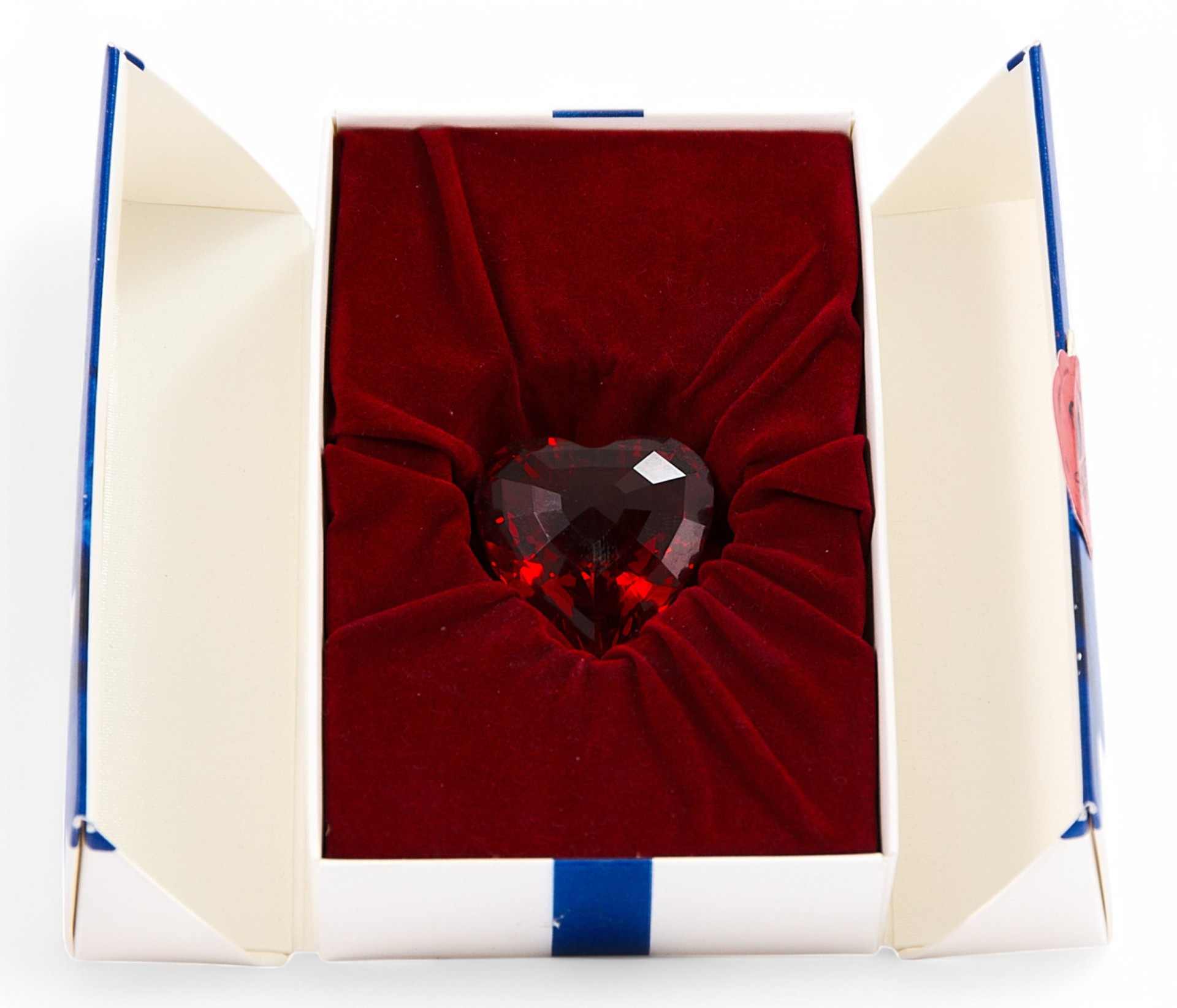 Этот алый кристалл в форме сердца из хрусталя Swarovski словно заключает в себе тепло и свет. Его идеально огранённые грани переливаются на свету, создавая игру бликов, которая притягивает взгляд. Упакованный в изящную коробку с бархатной подушечкой глубокого красного оттенка, он выглядит одновременно утончённо и трогательно.