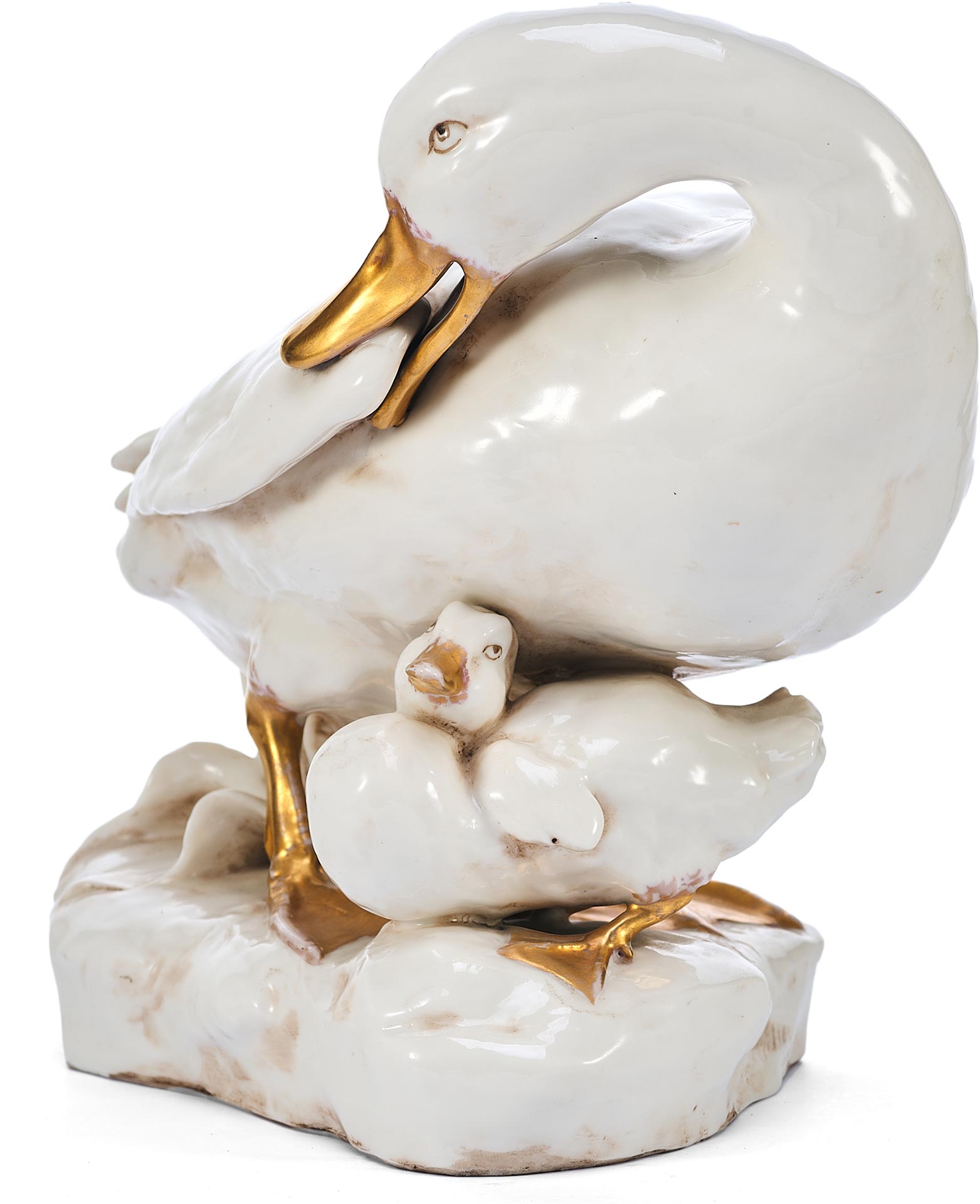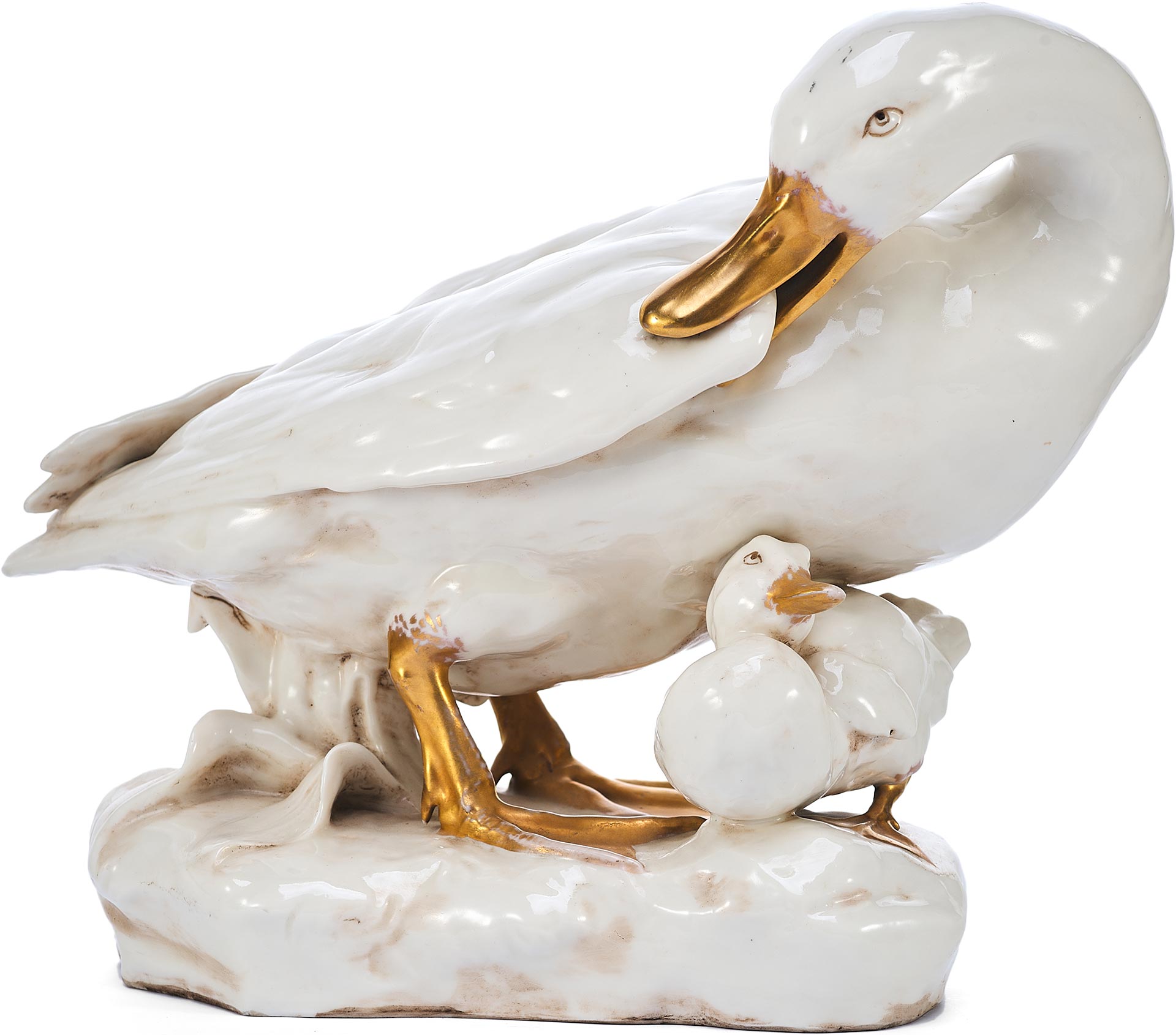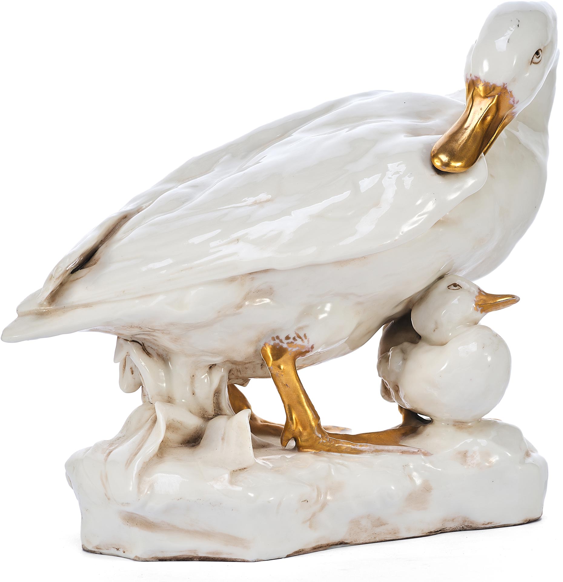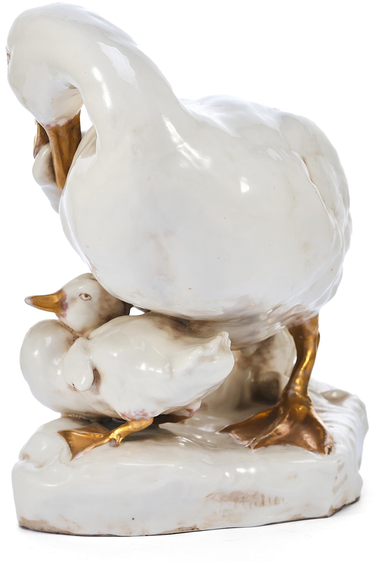 Утка укрывающей собою утенка. На основании фигуры клеймо изготовителя - фабрики Дрессель, Кистер и К (Германия), периода 1905-1922 гг. Пассау, Бавария ( Германия) Фабрика твердого фарфора, принадлежавшая фирме «Дрессель, Кистер