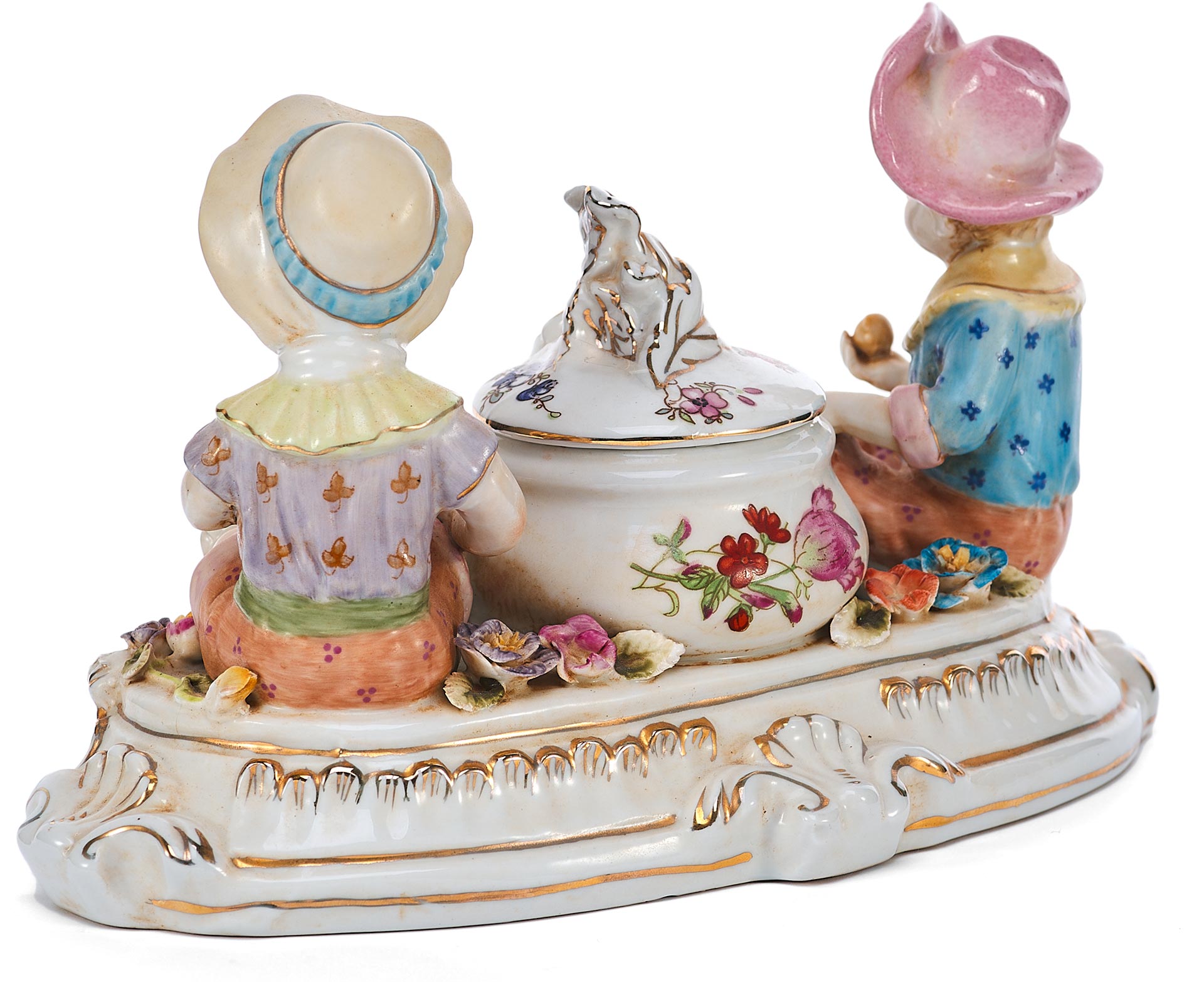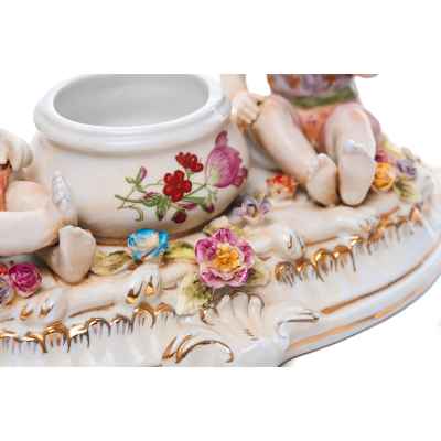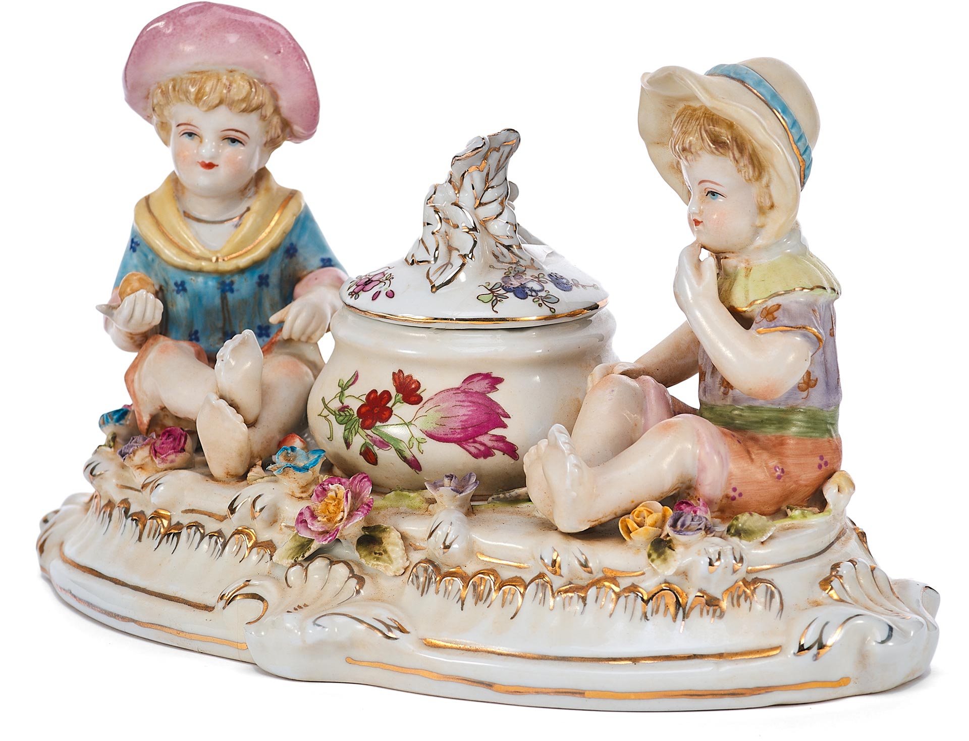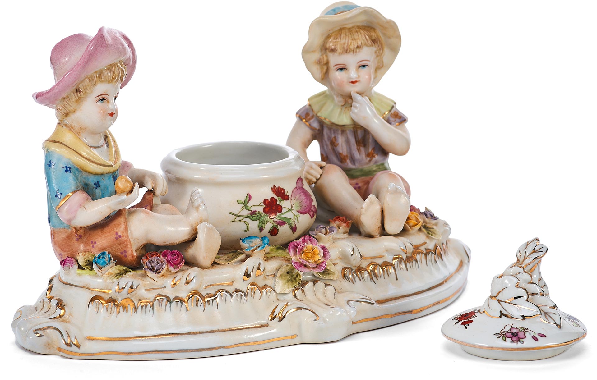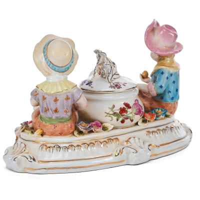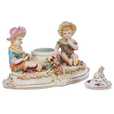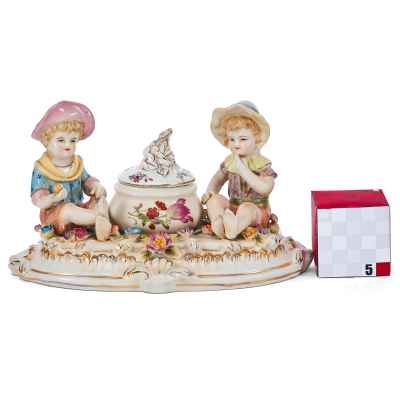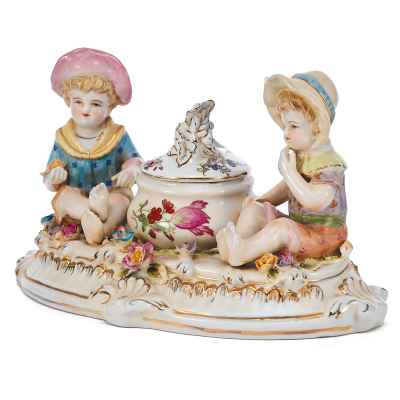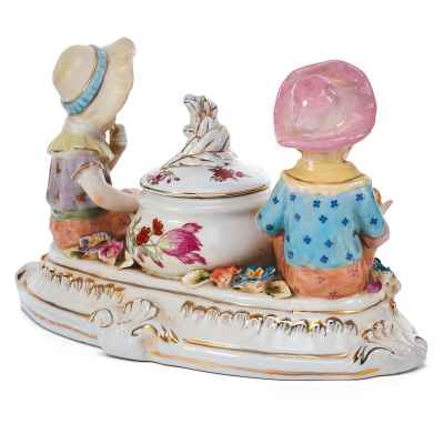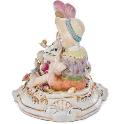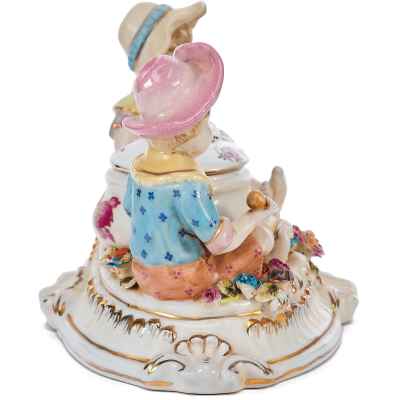 Скульптурная композиция представляющая сидящих детей, одетых в костюмы по моде ХVIII в. Между ними находится фигурный горшок (корзина?) с крышкой. Скульптура являет собой один из типичных образцов прикладного искусства