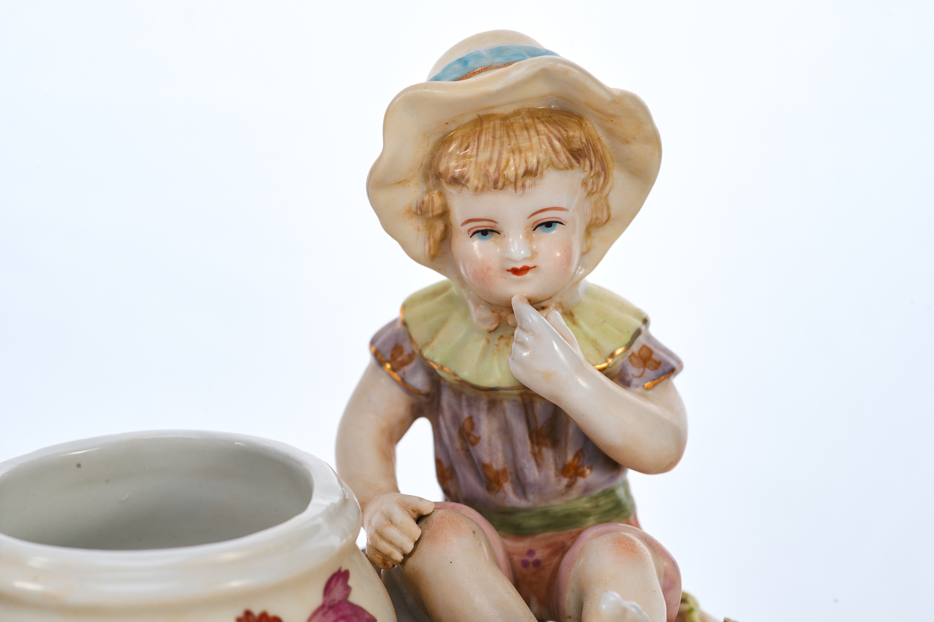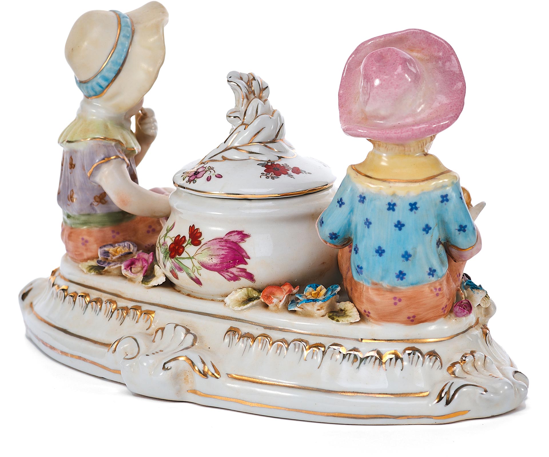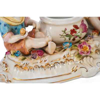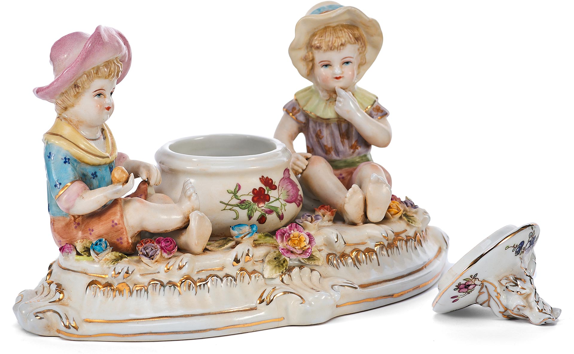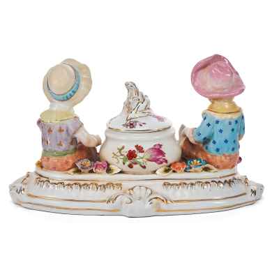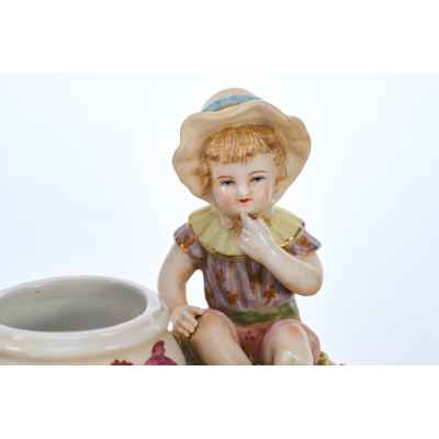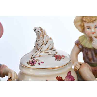 Скульптурная композиция представляющая сидящих детей, одетых в костюмы по моде ХVIII в. Между ними находится фигурный горшок (корзина?) с крышкой. Скульптура являет собой один из типичных образцов прикладного искусства