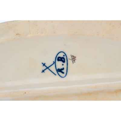 имитирующей художественную продукцию эпохи конца XIX — начала ХХ вв. Судя по клейму предмет можно отнести к имитации изделий фабрики «Фридрих Кристиан Грайнер и сыновья» периода 1860-1900 гг., которая располагалась в Рауэнштайне. Рауэнштайн, Тюрингия (Германия) В 1783 году владелец стекольного производства Иоганн Георг Грайнер, вместе с сыном Кристианом Даниелем Зигмундом и двоюродным братом Иоганном Фридрихом, получил привилегию на производство фарфора в Рауэнштайне. Выпускались кофейные и чайные сервизы, отдельные чашки, изделия повседневного пользования, курительные трубки. В период 1860-1900 гг. фирма называлась «Фридрих Кристиан Грайнер и сыновья». В ассортимент в это времядобавились скульптуры и куклы. Роспись имела преимущественно цветочный характер, часто использовался мейсенский «сухоцвет». Фабрика закрылась в 1936 году.