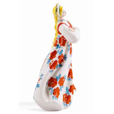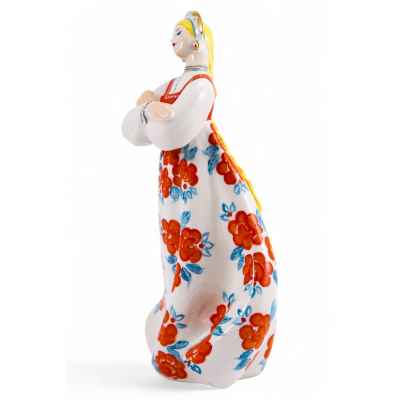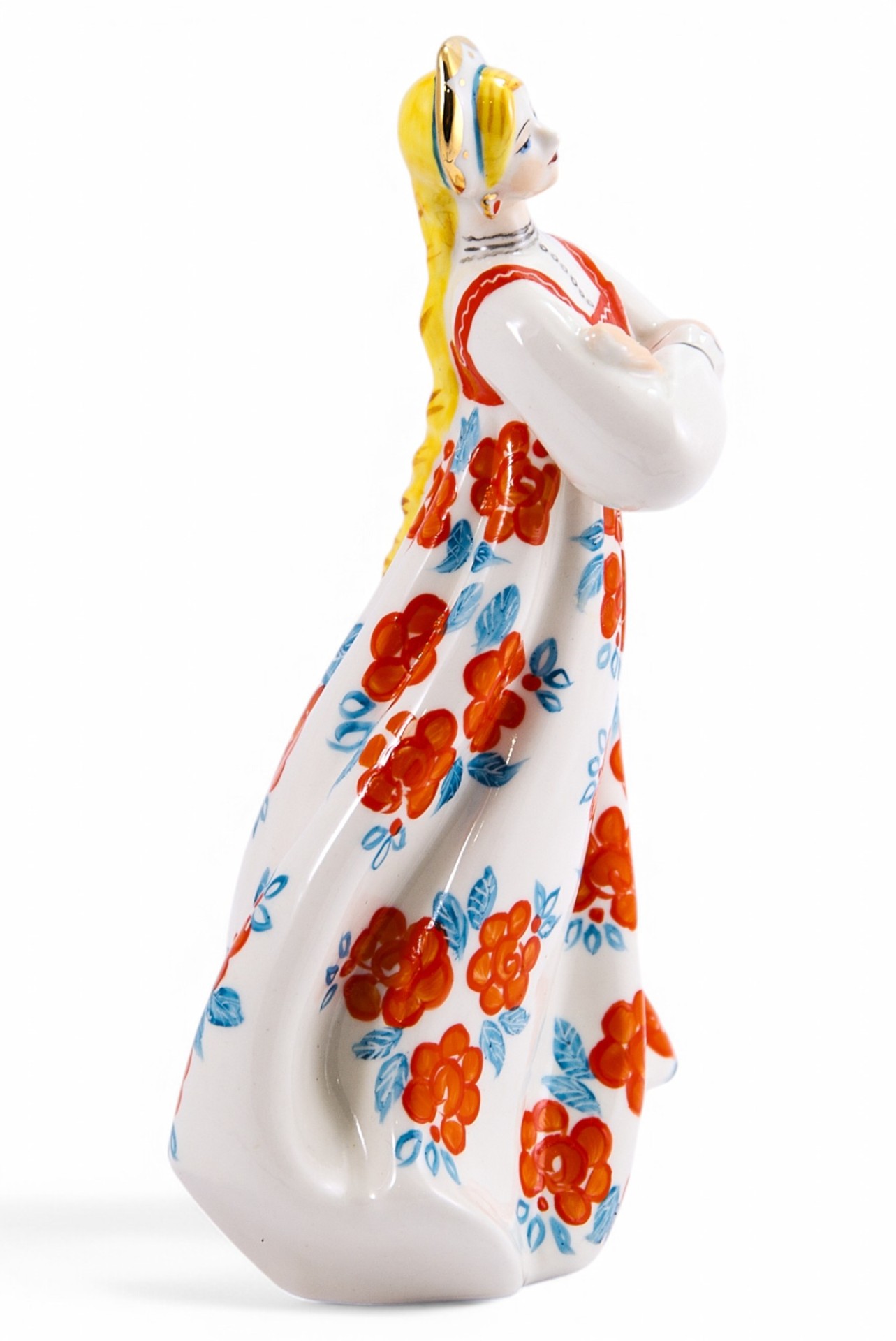 Фарфоровая скульптура танцующей девушки в белом сарафане с оранжевыми цветами. На голове кокошник. Скульптор