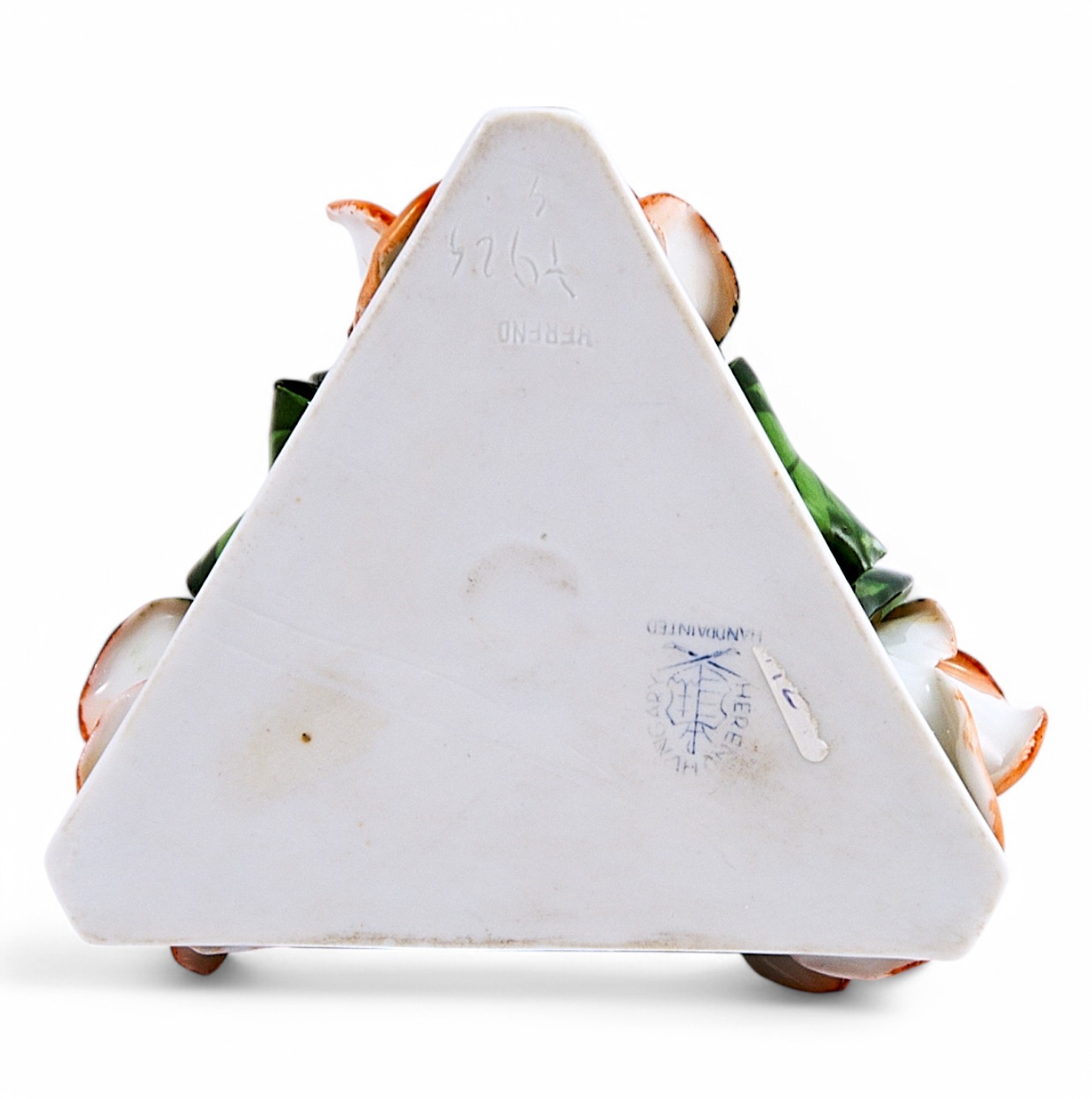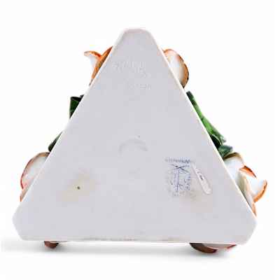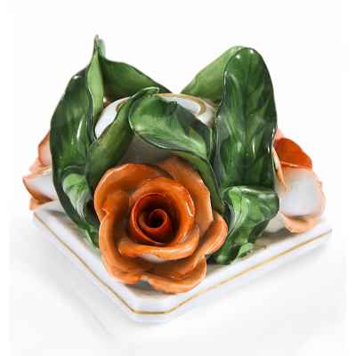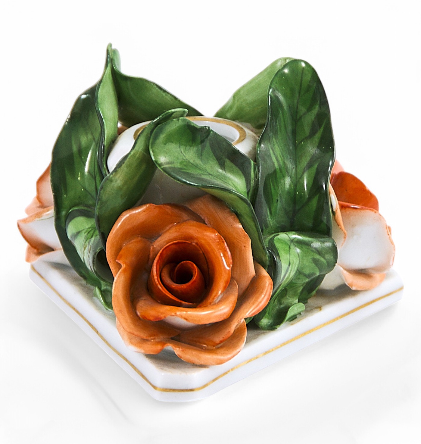 Настольный подсвечник украшенный бутонами роз. На основании клейма (печатное и «в тесте») фарфоровой фабрики Херенд (Herend) ставившееся с 1949 по 1960-е годы. Фарфоровая фабрика Херенд (Венгрия) В 1826 году, в небольшой деревушке Херенд (Herend), расположенной на склоне горы, открылась мастерская, выпускавшая керамические изделия. В 1839 году владельцем мастерской стал Мор Фишер (Mór Fischer), и это стало началом нового периода в развитии будущей фабрики.Фишер взял огромные ссуды на развитие фарфорового производства, первый коммерческий успех пришел довольно быстро. Заказчиками завода "Herend"стали венгерские аристократы, появились заказы на сервизы. В этот момент и формируется оригинальная и неповторимая школа росписи фарфора "Herenď’, ориентированная на изготовление уникального, расписываемого вручную фарфора. Некоторые рисунки, созданные в XIX веке, используются для росписи фарфора до сих пор ("Цветы Индии", "Птицы Ротшильдов", "Малые розы", "Королева Виктория").Прославился "Herend" и росписями в стиле "шинуазри".С1924 года завод стал выпускать фарфоровую скульптуру, как копии, так и оригинальные