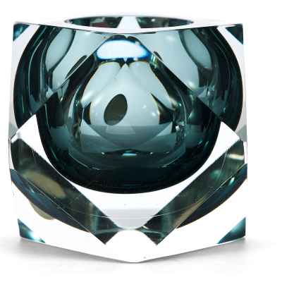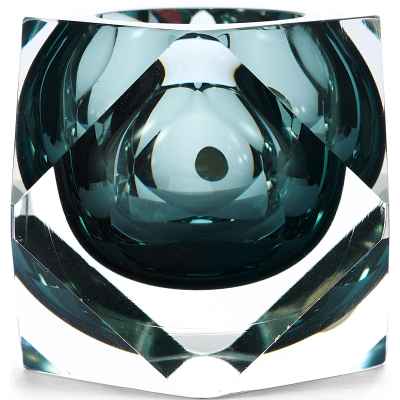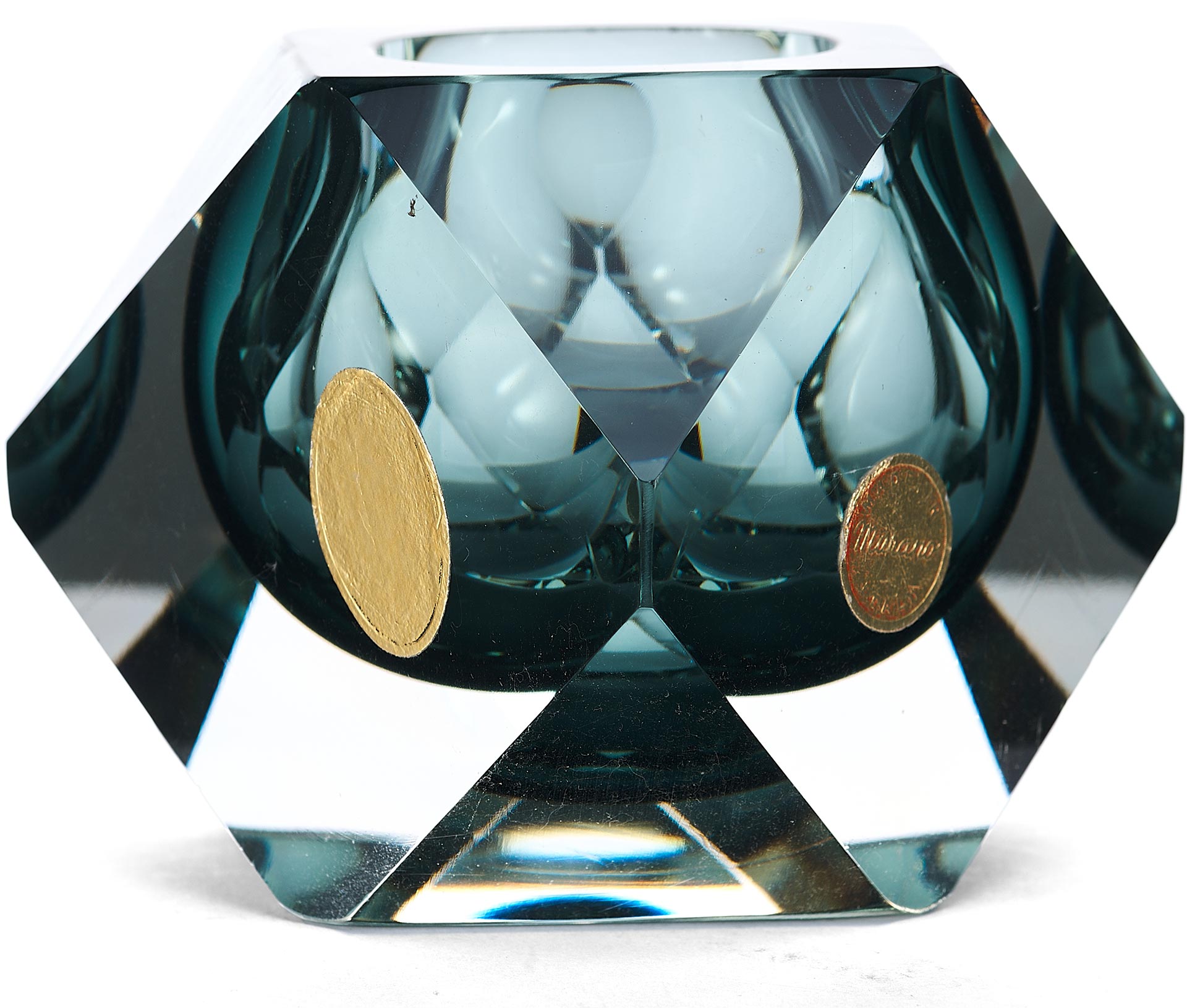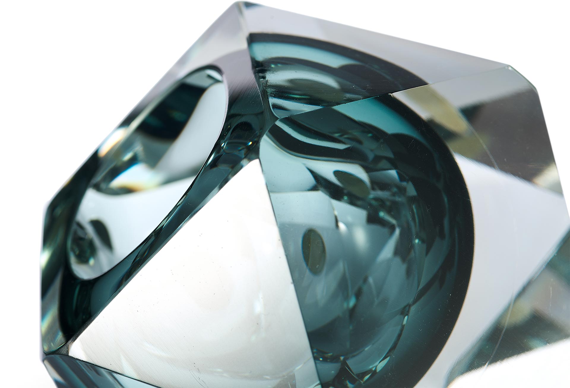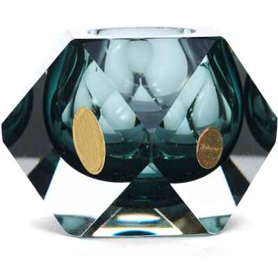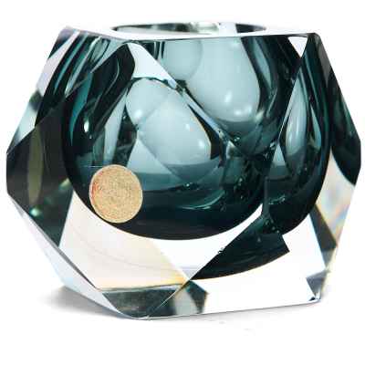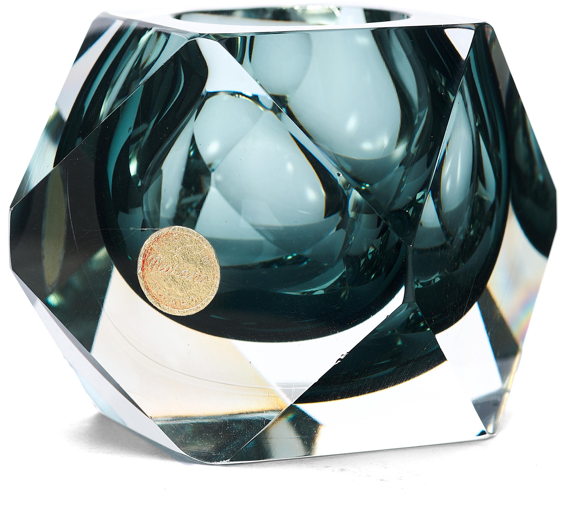 Эта ваза, созданная в 1960-е годы на острове Мурано, представляет собой выдающийся образец муранского стеклоделия. Она изготовлена из сочетания бесцветного и цветного стекла, а её поверхность подвергнута огранке, что придаёт ей исключительный блеск и игру света. Благодаря этому обработка стекла напоминает огранку драгоценных камней, создавая эффект глубины и сияния.