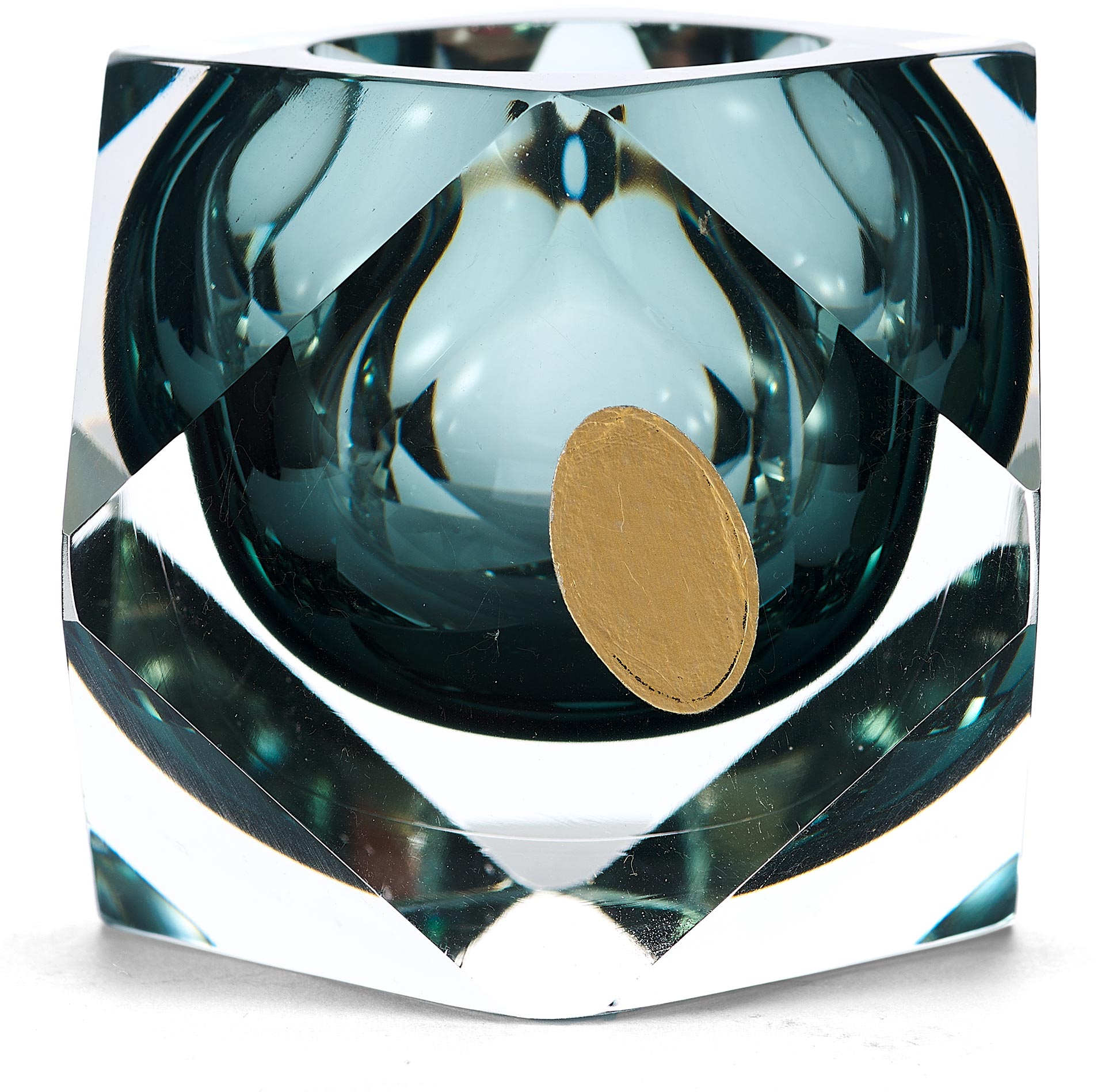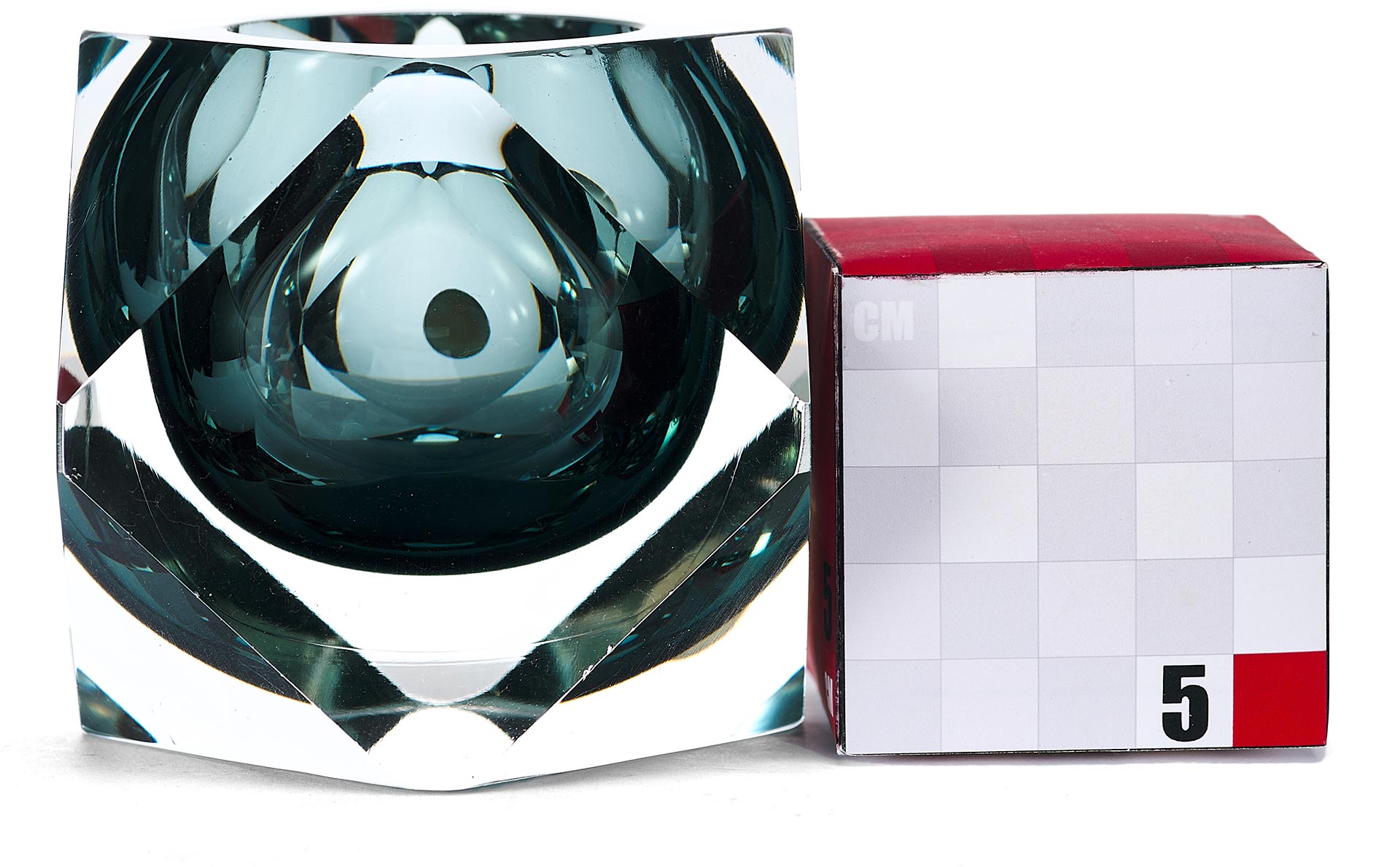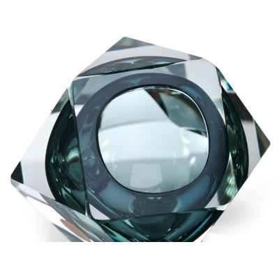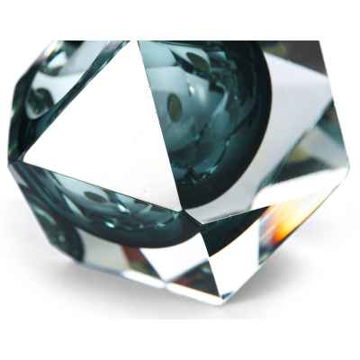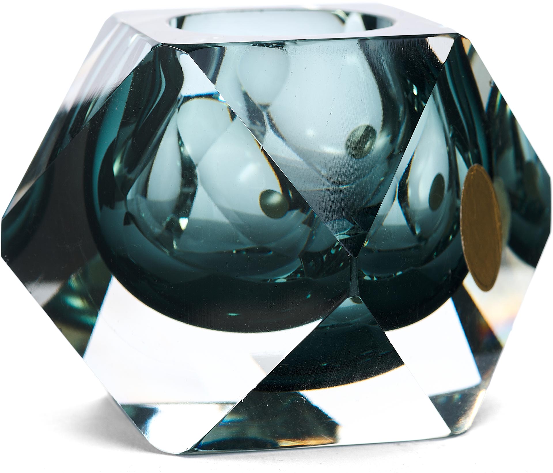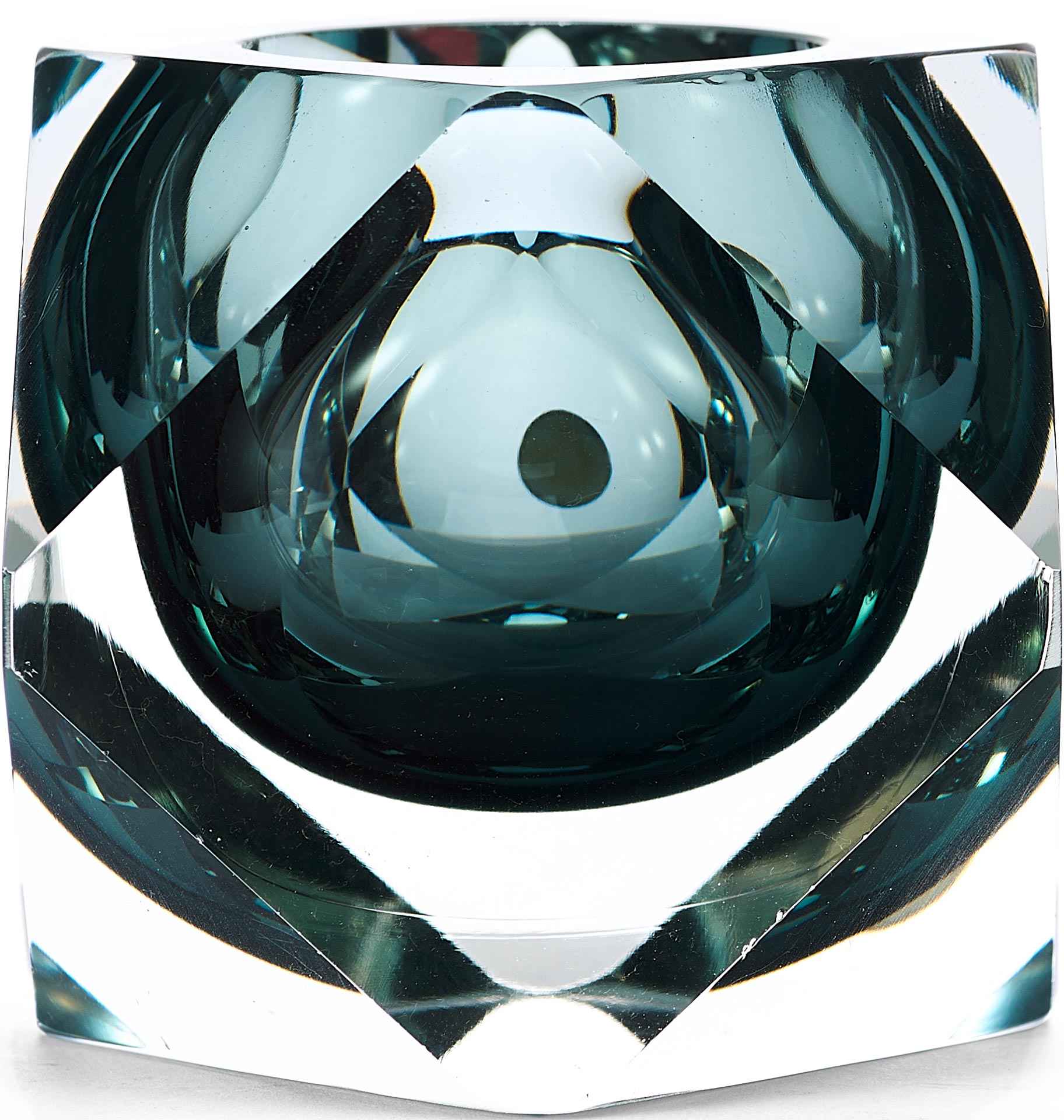 Эта ваза, созданная в 1960-е годы на острове Мурано, представляет собой выдающийся образец муранского стеклоделия. Она изготовлена из сочетания бесцветного и цветного стекла, а её поверхность подвергнута огранке, что придаёт ей исключительный блеск и игру света. Благодаря этому обработка стекла напоминает огранку драгоценных камней, создавая эффект глубины и сияния.