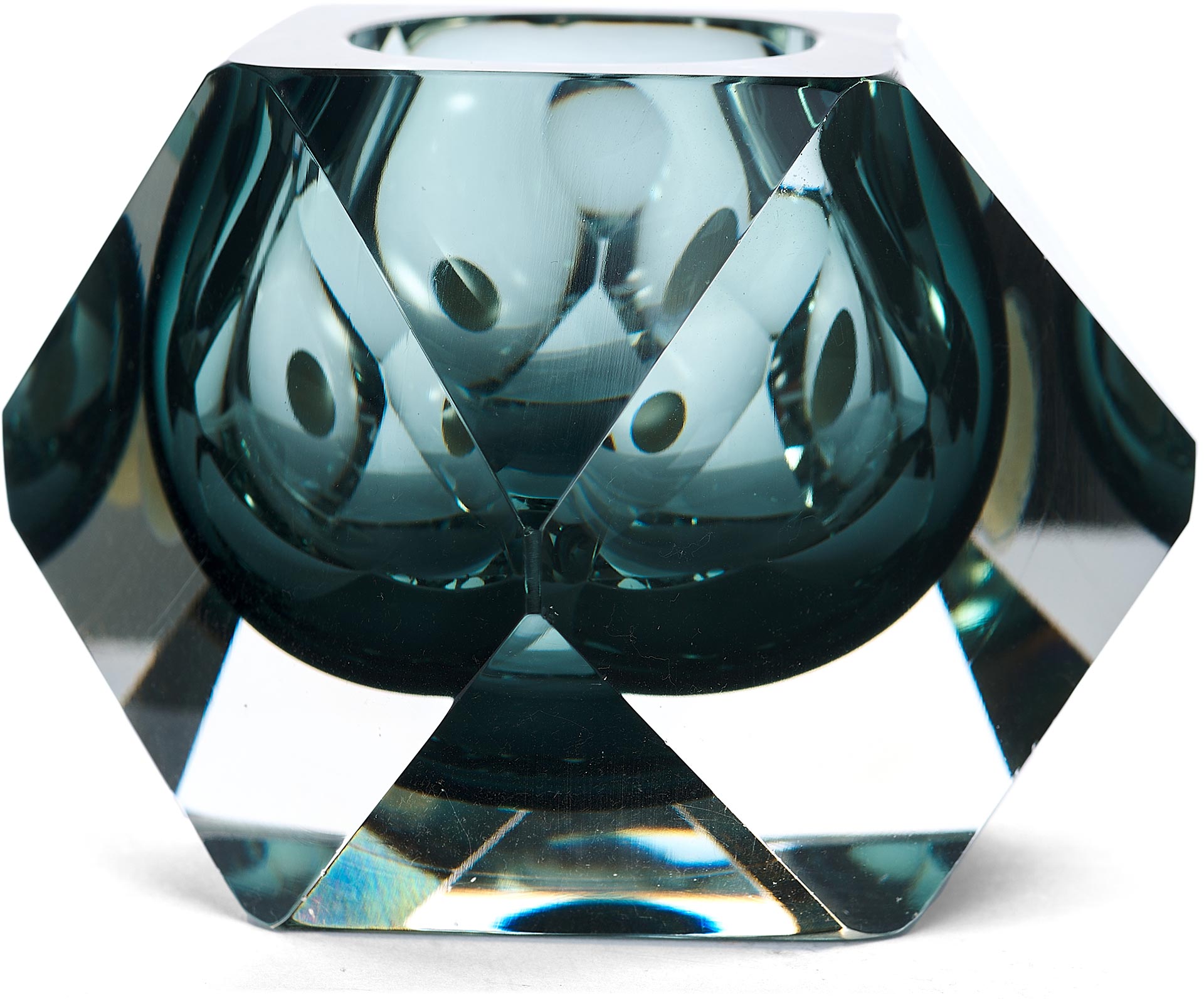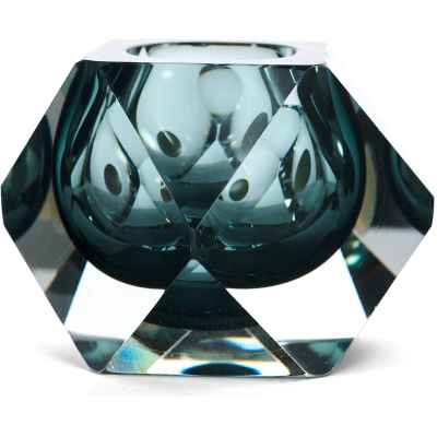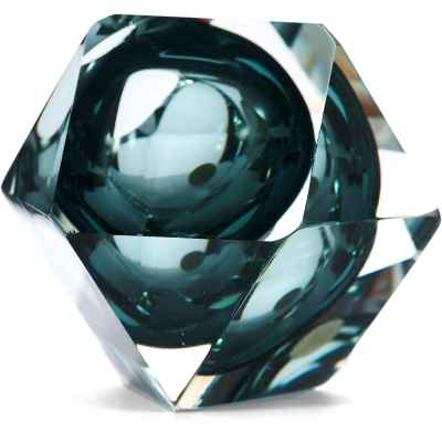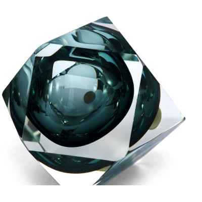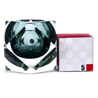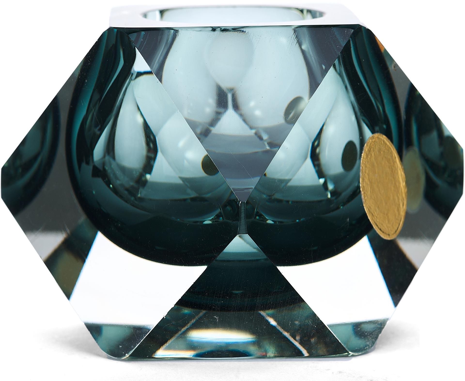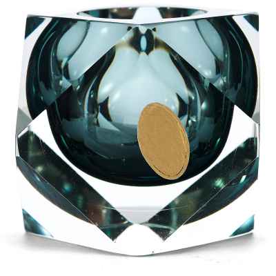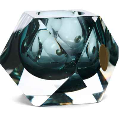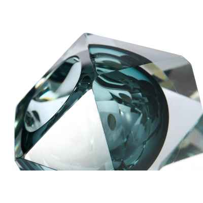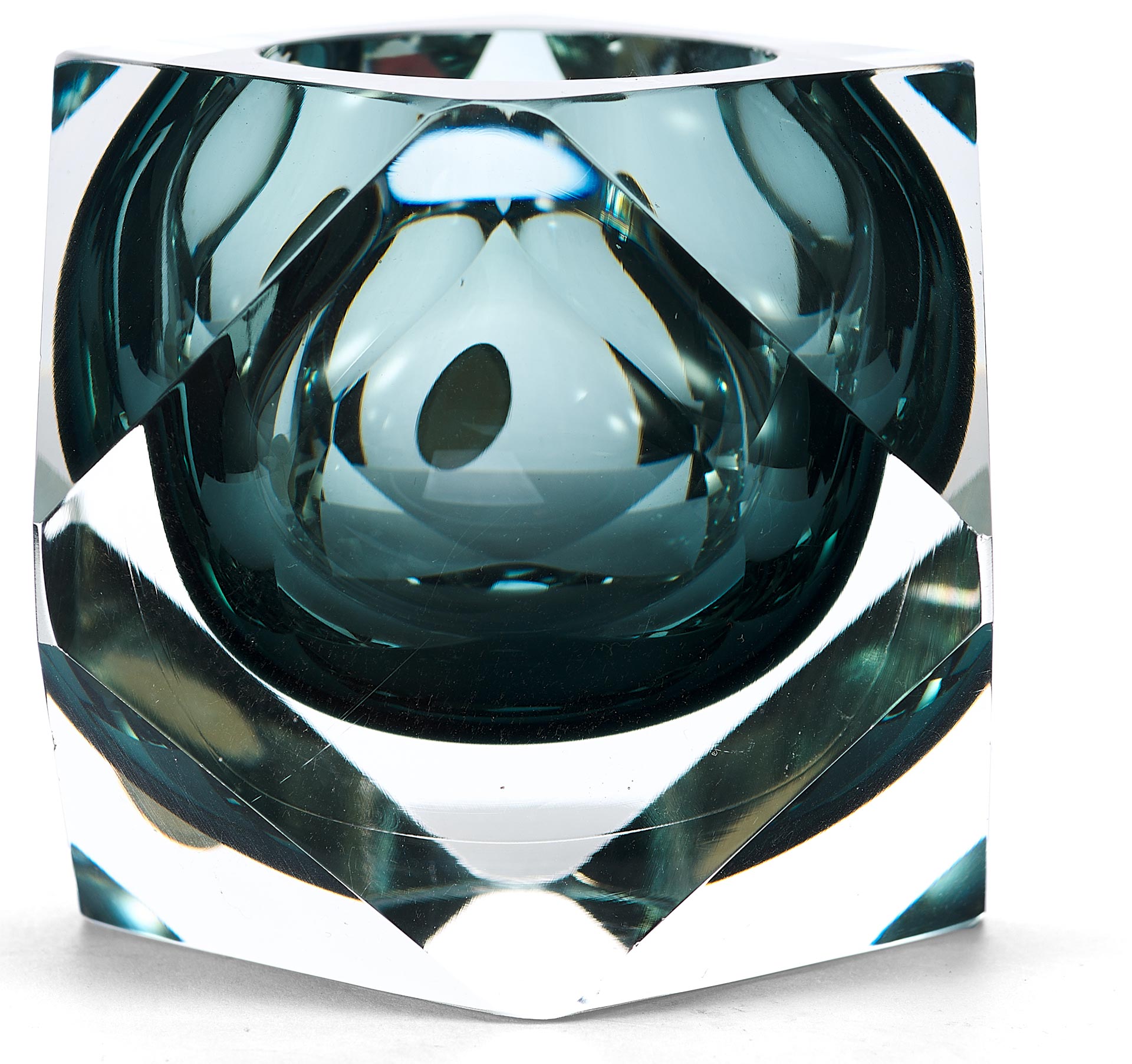 Эта ваза, созданная в 1960-е годы на острове Мурано, представляет собой выдающийся образец муранского стеклоделия. Она изготовлена из сочетания бесцветного и цветного стекла, а её поверхность подвергнута огранке, что придаёт ей исключительный блеск и игру света. Благодаря этому обработка стекла напоминает огранку драгоценных камней, создавая эффект глубины и сияния.