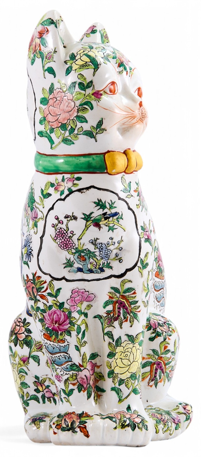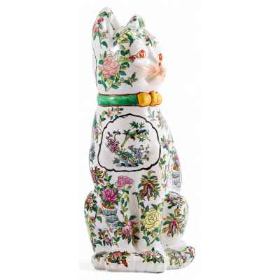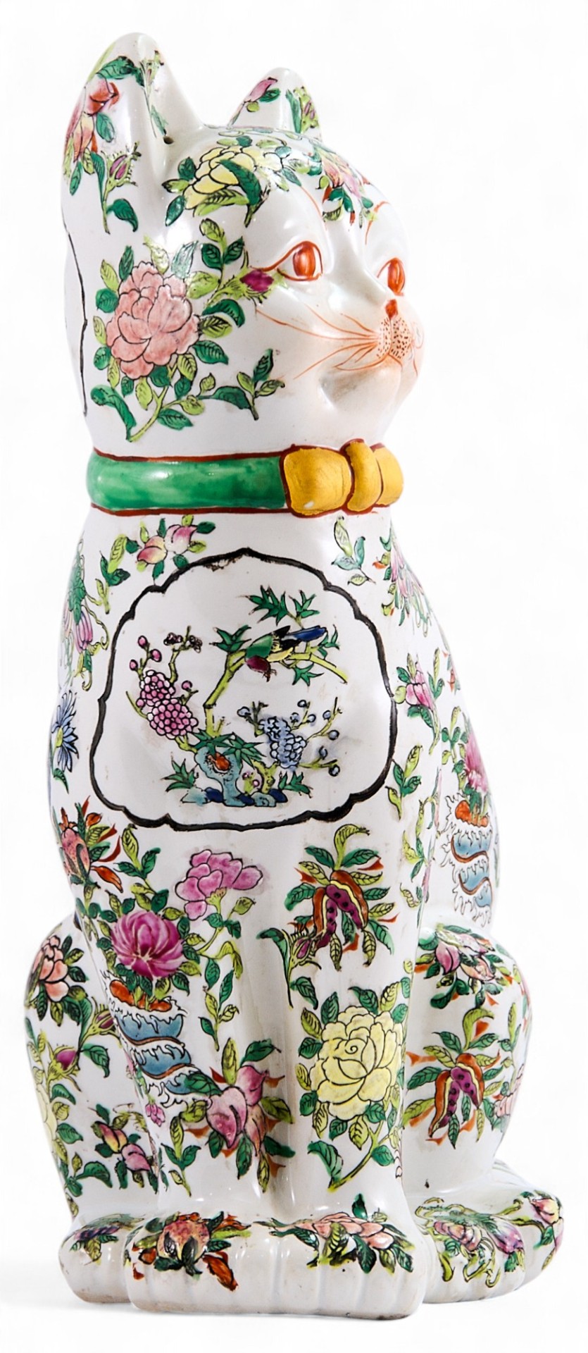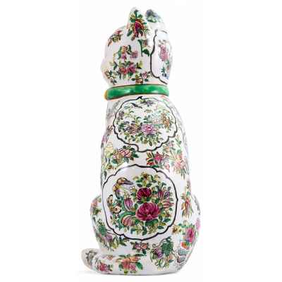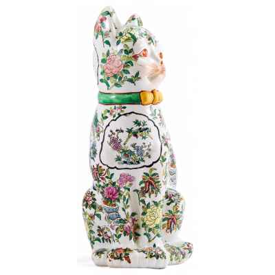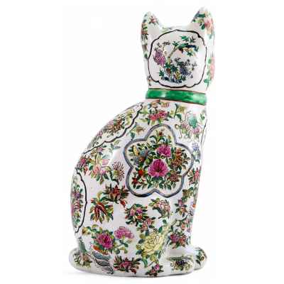 Скульптура сидящей кошки. Данная фигура принадлежит к общераспространенной теме китайских кошек, расписанных третями и шипами, изготавливавшихся в Китае на протяжении всего XX в. Подобные фигуры часто попадают на европейские и американские рынки. У китайцев кошка, будучи ночным животным, относится к принципу инь (женского начала, тьмы, луны и т.д.). Он обладает злыми силами и способностью к трансформации. Кроме того, в Китае верили в то, что кот способен изгонять злых духов. Считается также, что кошка является ещё и символом долголетия, поэтому подаренная статуэтка будет не только оберегать его обитателей, но и дарить здоровье и долголетие.