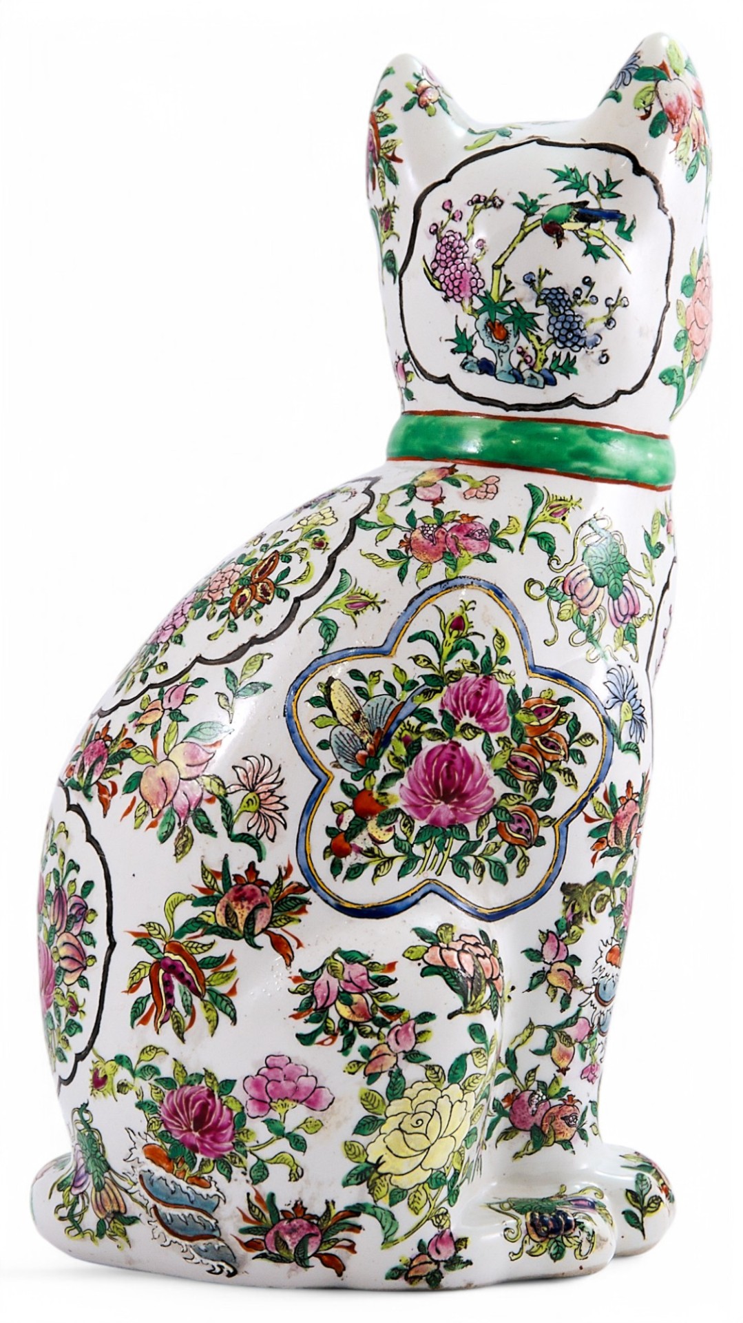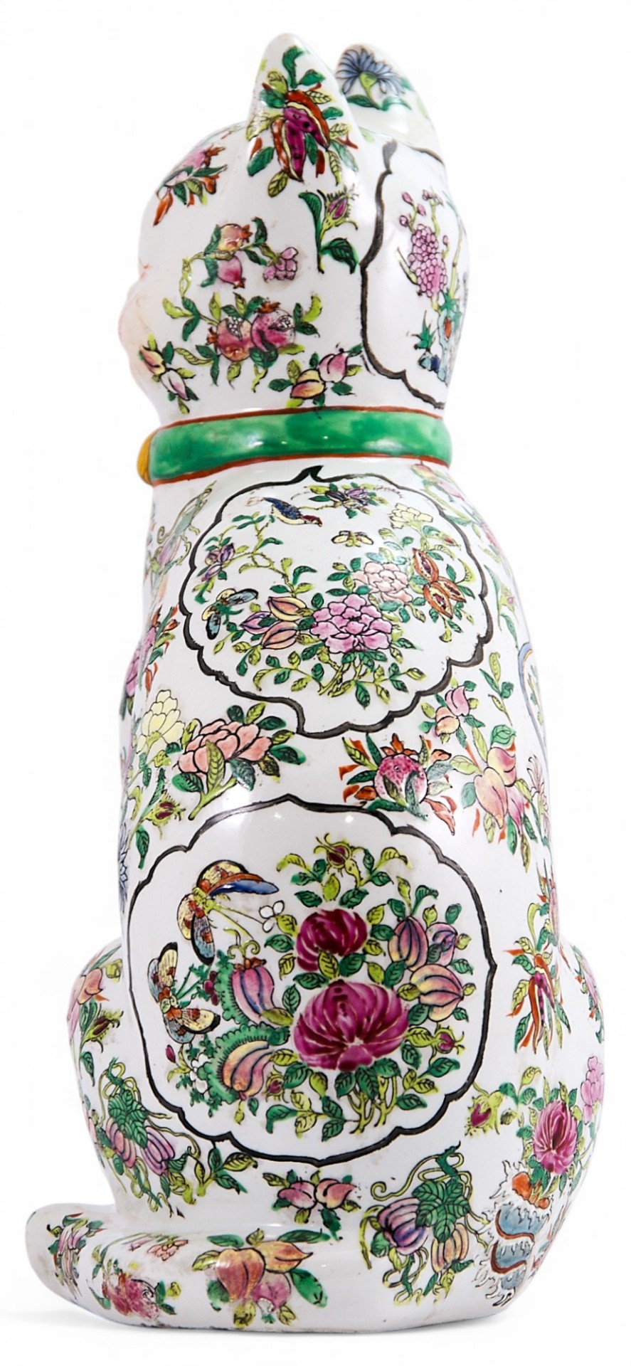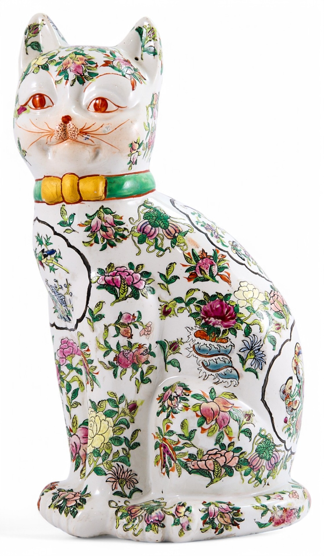 Скульптура сидящей кошки. Данная фигура принадлежит к общераспространенной теме китайских кошек, расписанных третями и шипами, изготавливавшихся в Китае на протяжении всего XX в. Подобные фигуры часто попадают на европейские и американские рынки. У китайцев кошка, будучи ночным животным, относится к принципу инь (женского начала, тьмы, луны и т.д.). Он обладает злыми силами и способностью к трансформации. Кроме того, в Китае верили в то, что кот способен изгонять злых духов. Считается также, что кошка является ещё и символом долголетия, поэтому подаренная статуэтка будет не только оберегать его обитателей, но и дарить здоровье и долголетие.