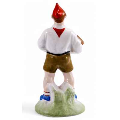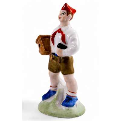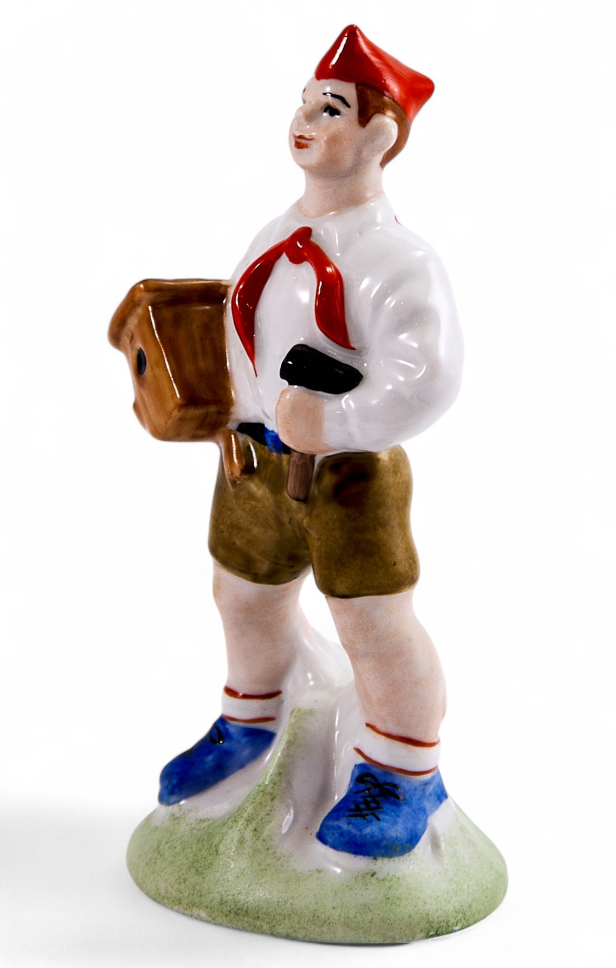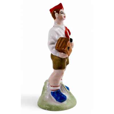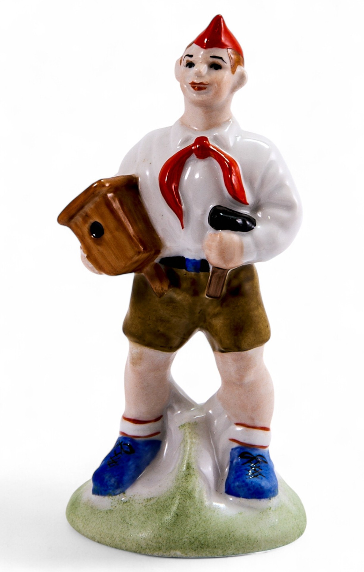 Современная авторская скульптура мальчика в пионерской форме, который держит в руках скворечник и молоток. На основании имеется клеймо Коростенского фарфорового завода 1970-х годов. Коростенский фарфоровый завод. История завода начинается с 1909 года. Предприпмчивый поляк А. К. Пржибыльский основывает завод по выпуску фаянса и фарфора. В первое время на фабрике производили только «бельё» — белую, не раскрашенную посуду. Расписывали в Польше. Предприятие специализируется на выпуске столовой посуды — дорогие сервизы, тарелки. В 1917 году фабрика была национализирована, в 1918 году закрыта. Во время войны завод был разрушен. Первую продукцию восстановленный из руин