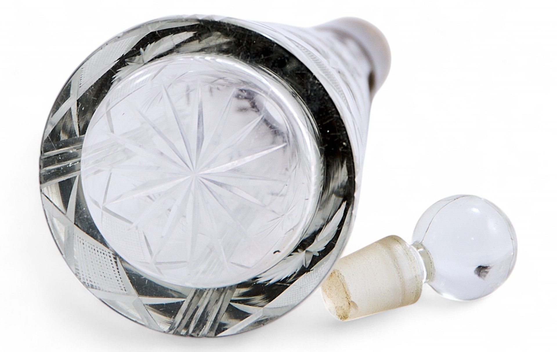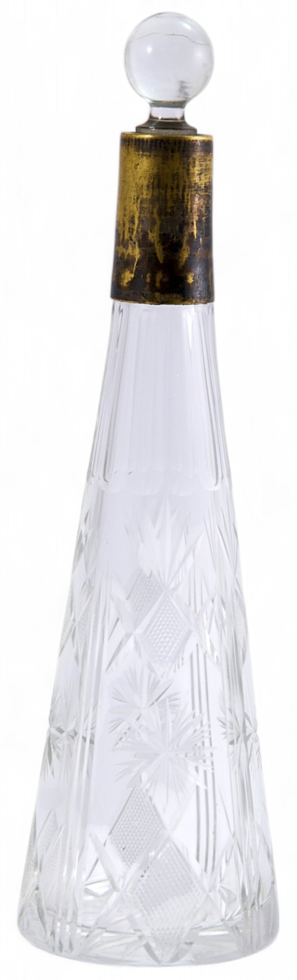 Тулово графина имеет конусовидную форму с плоским дном, украшенным многолучевыми гранеными розетками. Основной материал изделия – хрусталь с гранением, что придает ему особую игру света. Вертикальные шлифованные грани и розеточные мотивы, нанесенные на стекло, создают декоративный эффект, характерный для европейского стекольного искусства начала XX века.