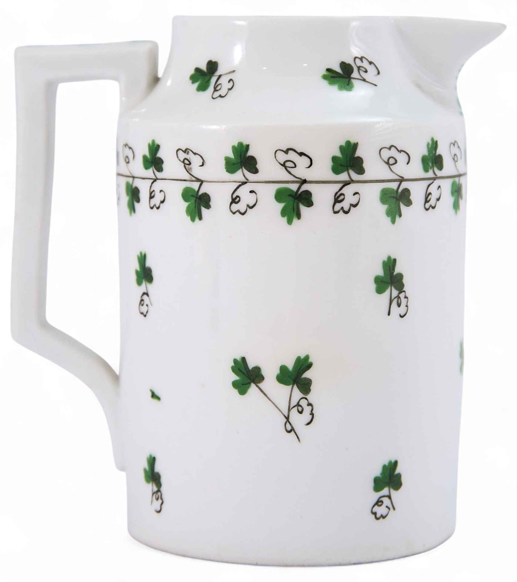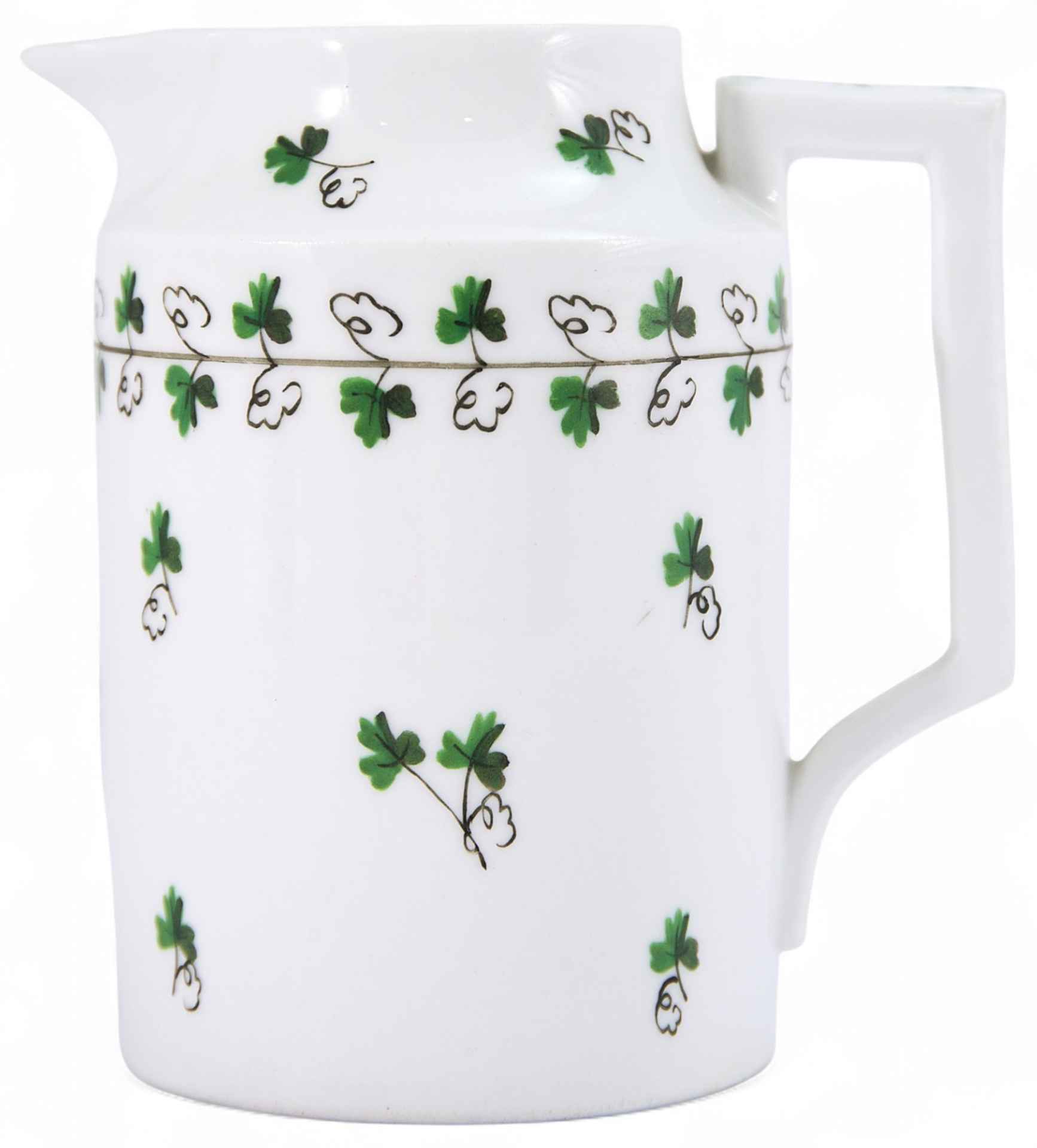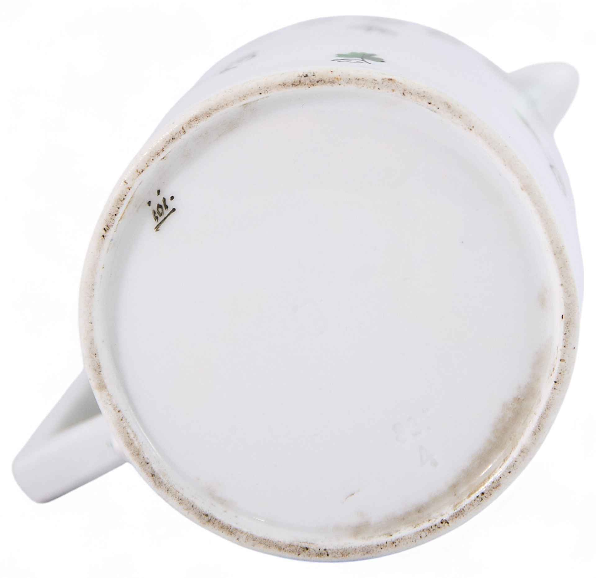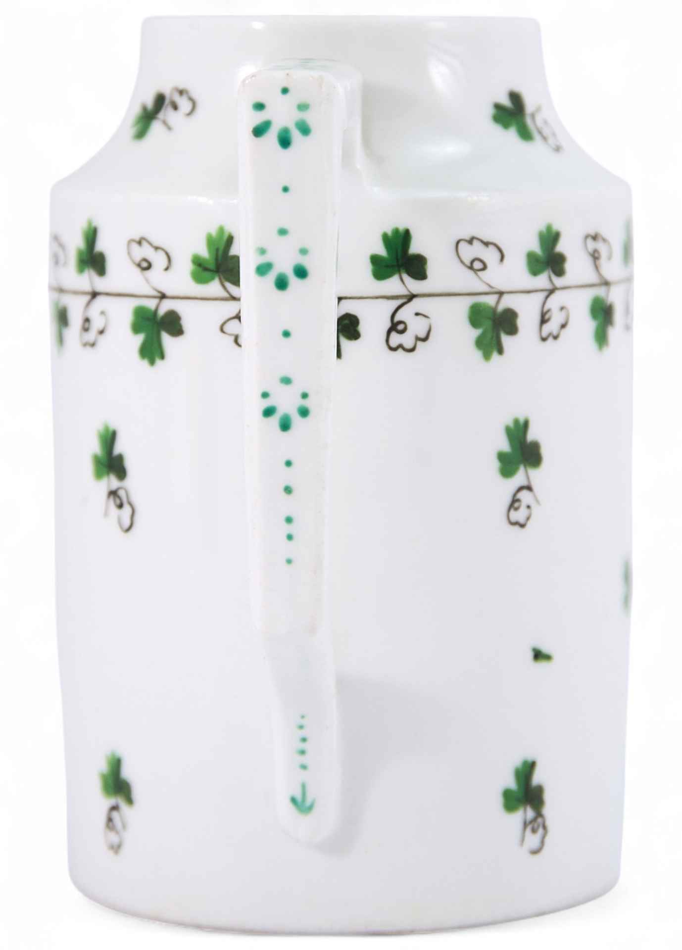 Представлен молочник, поверхность которого расписана клеверной россыпью - характерный мотив для оформления посуды Венской фарфоровой мануфактуры. Однако характер расположения лепестков на кувшине и уровень росписи, позволяет