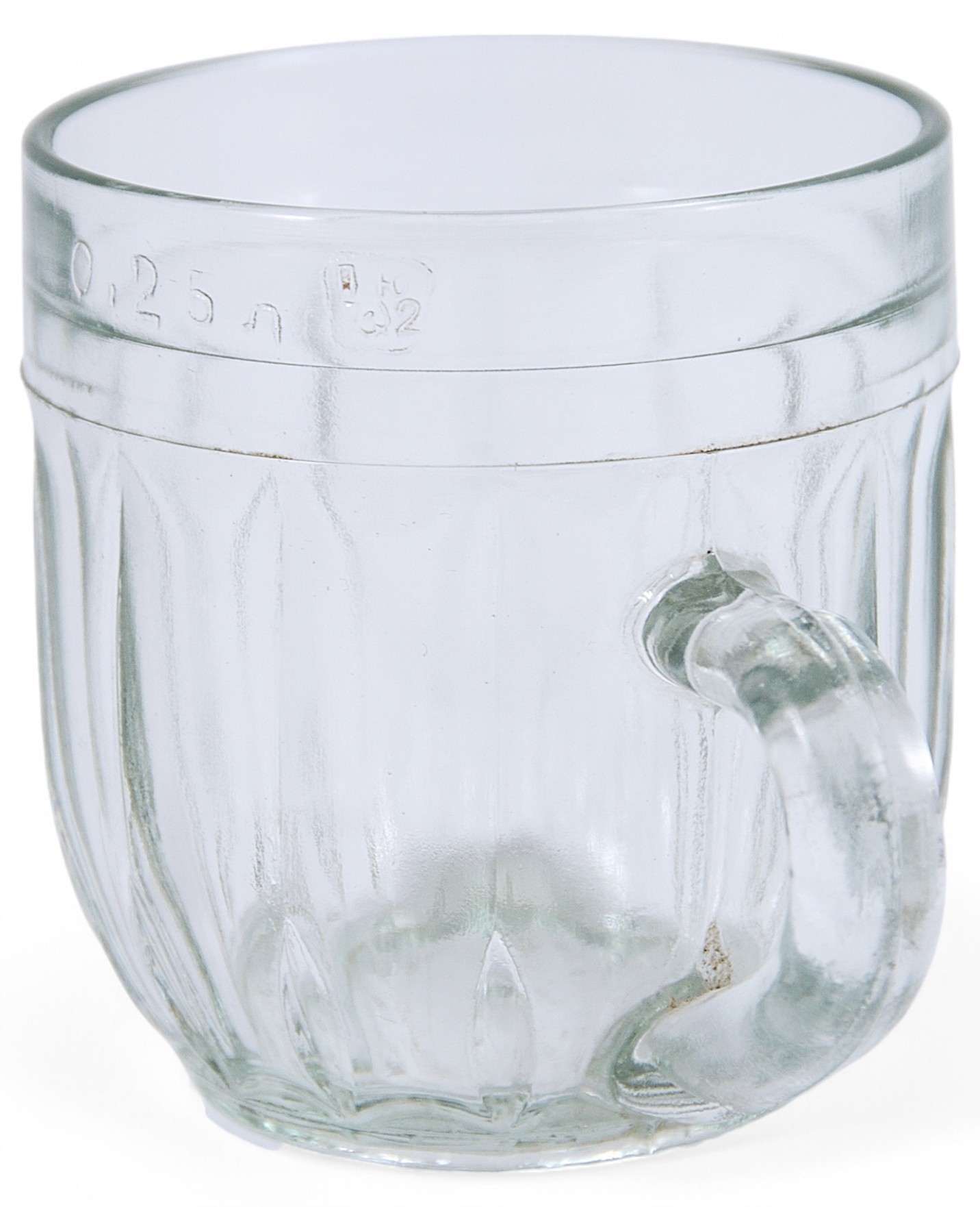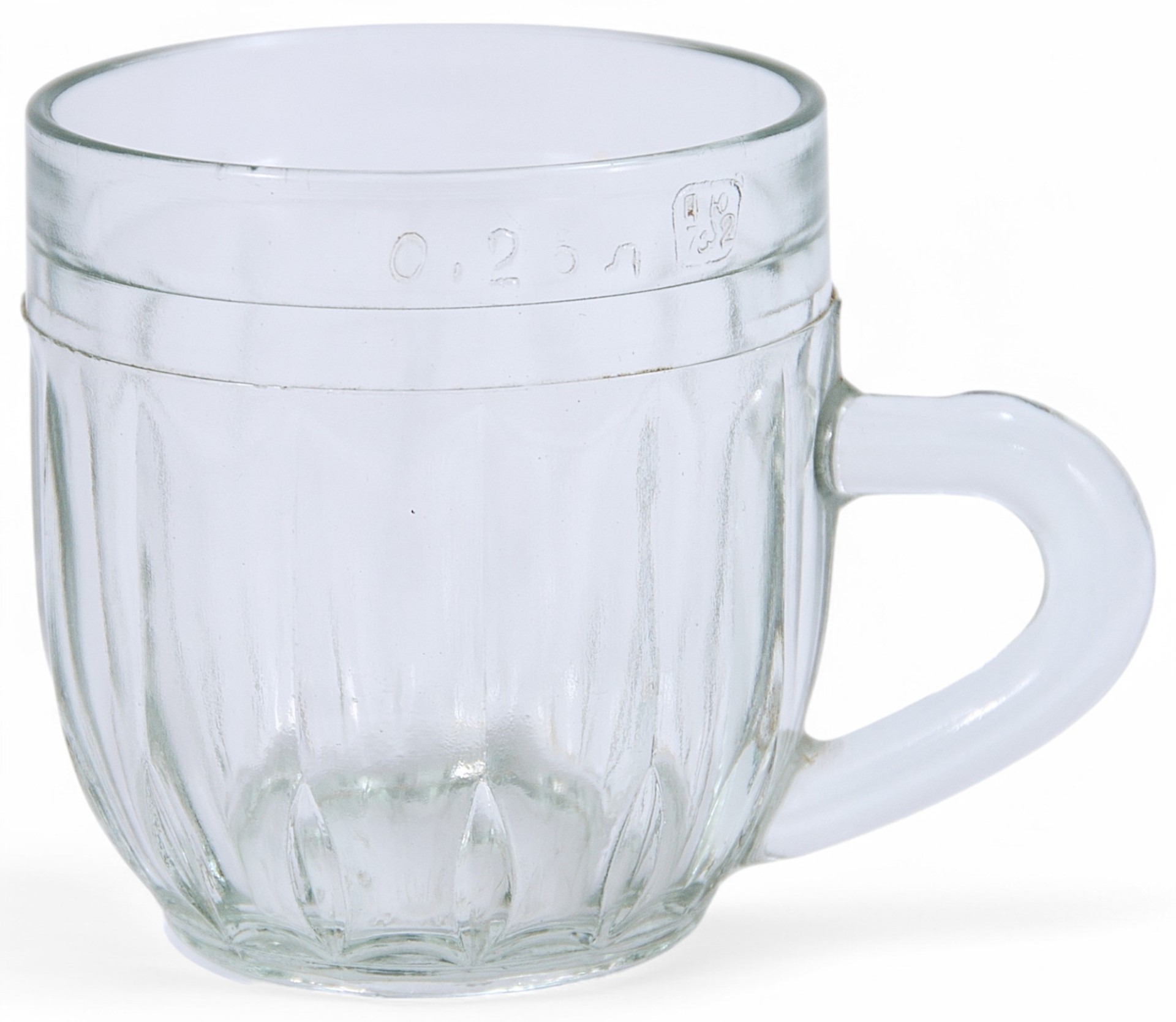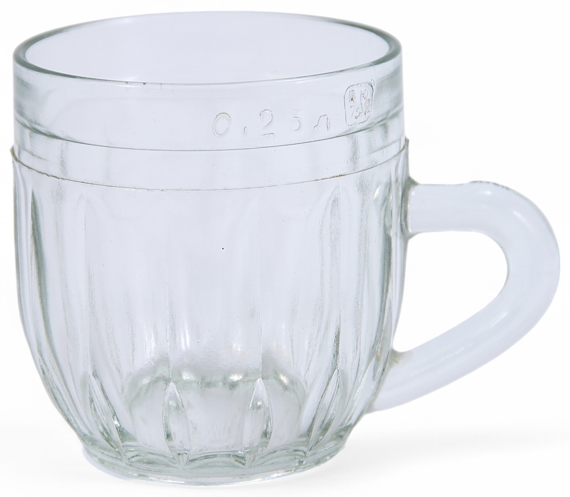 Стеклянная пивная кружка емкостью 0,25 л. На дне клейма: САЗ (Стекольный Артемовский завод), РТУ, 694 62 ц 29 к. На бортике кружки: 0,25 л, между цифрами 6 и 8 изображение серпа и молота, ниже - ПЮ. В царской России вместимость пивных кружек не регламентировалась.