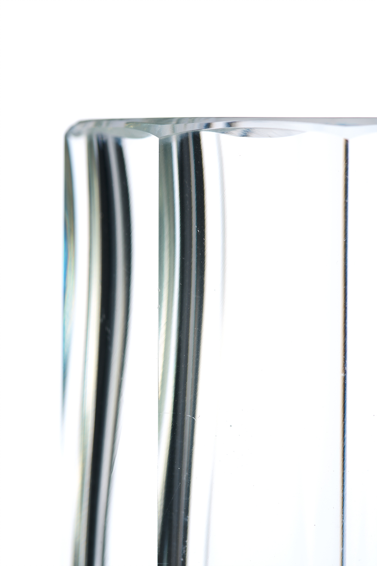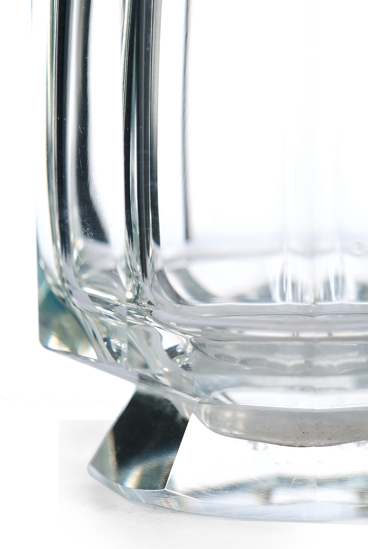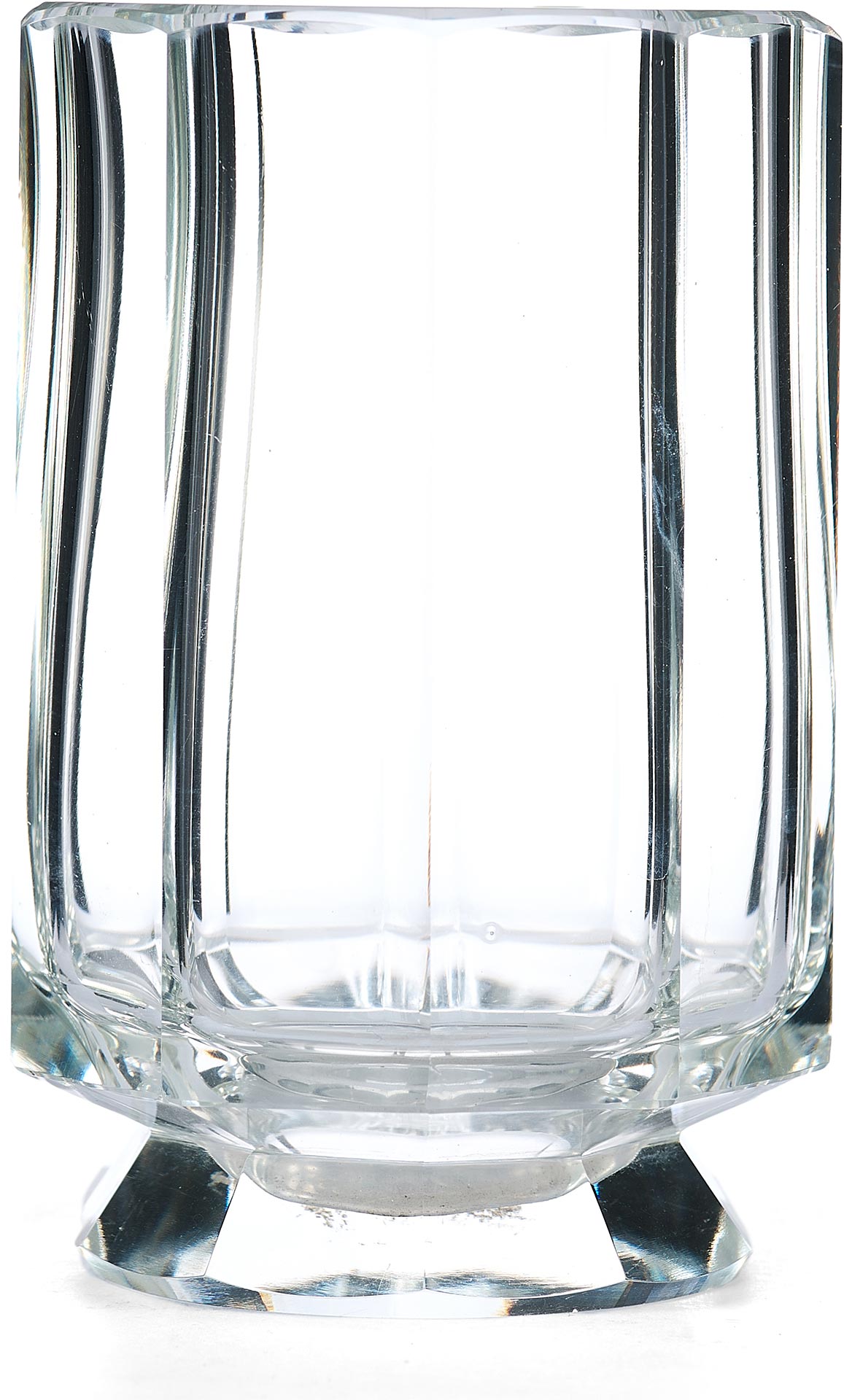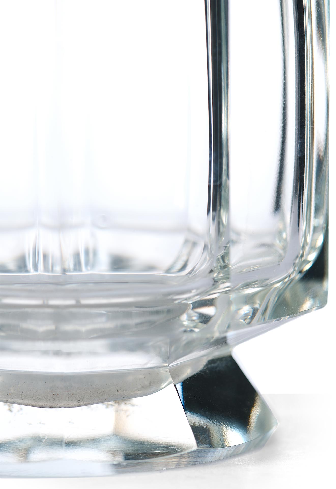 Эта ваза представляет собой образец европейского стекольного искусства XX века, отличающийся строгой геометрией и изысканной прозрачностью. Выполненная из толстостенного стекла, она имеет гранёные стенки и массивное основание, что придаёт ей ощущение устойчивости и монументальности.