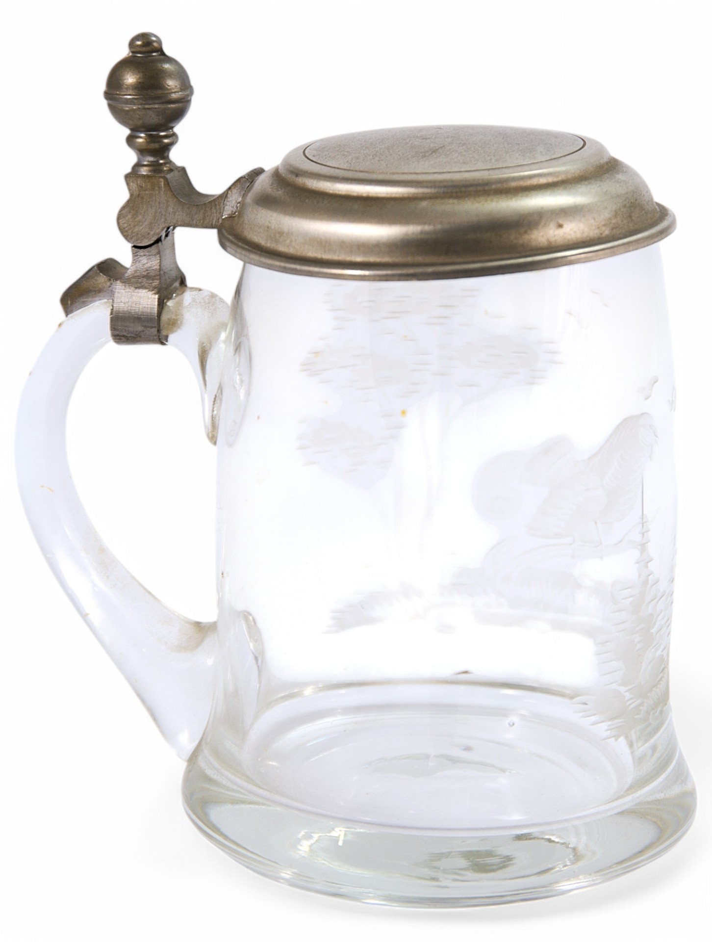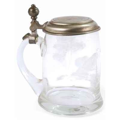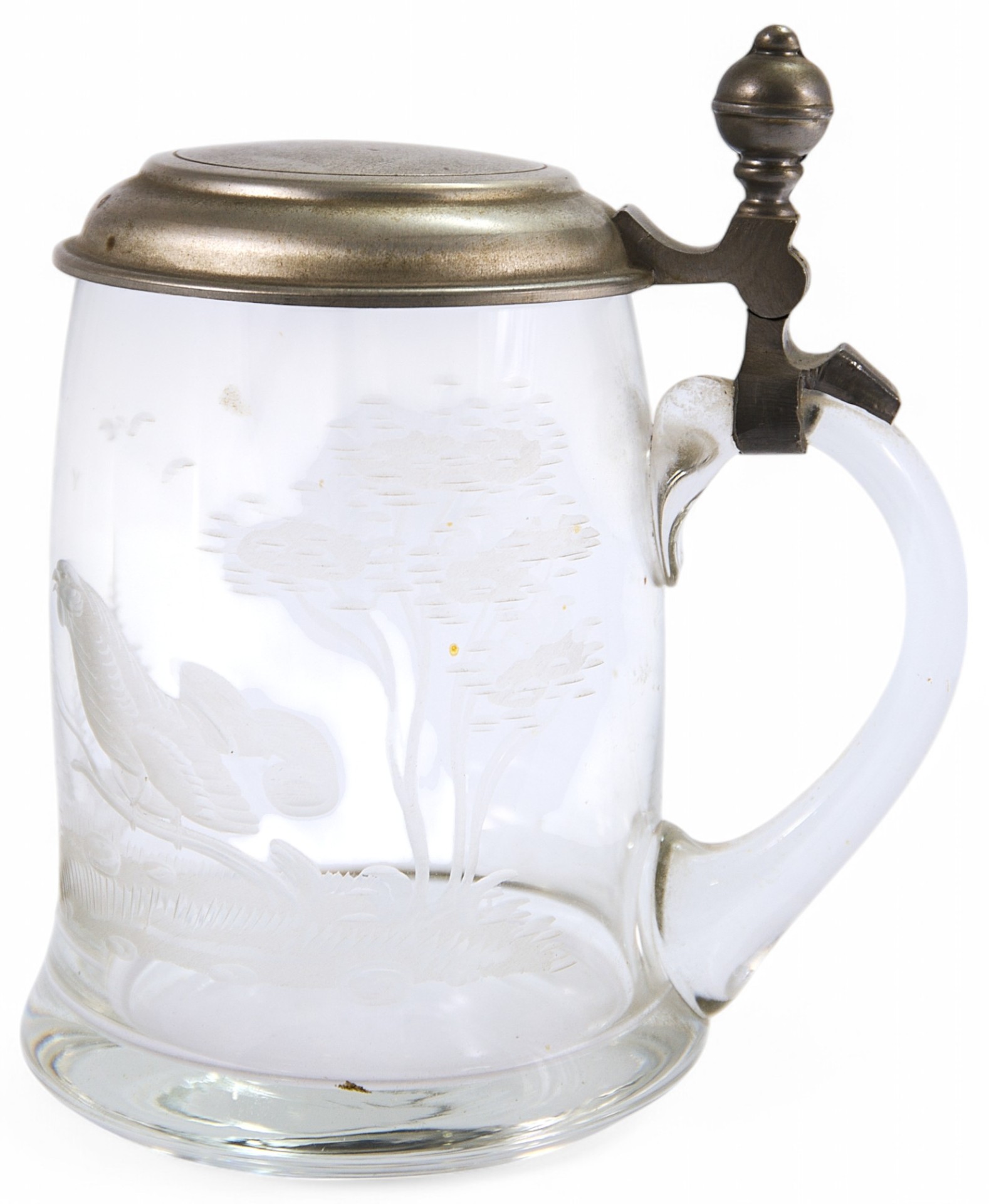 Пивная кружка выполнена из прозрачного стекла и украшена тонкой гравировкой с изображением глухаря, сидящего на ветке, среди растительности. Её конструкция включает массивную стеклянную ручку, соединённую с металлической крышкой, снабжённой удобным рычажком для открывания большим пальцем.