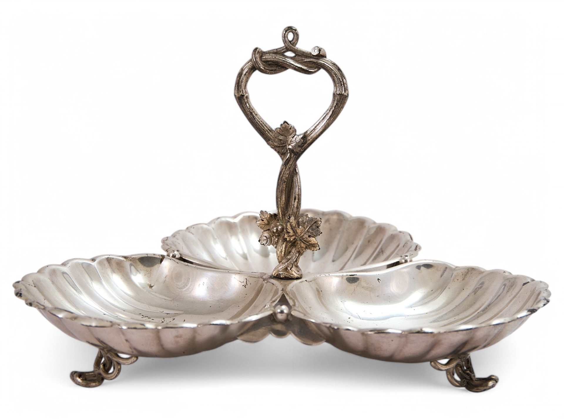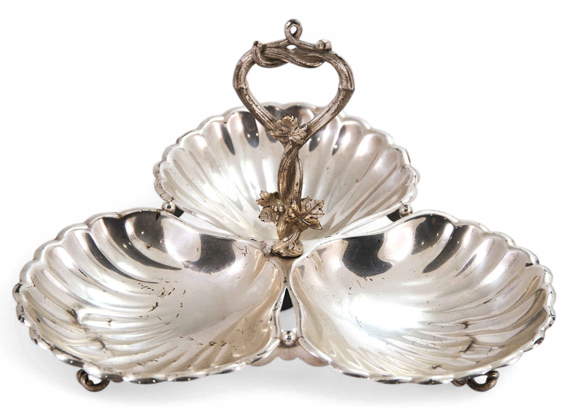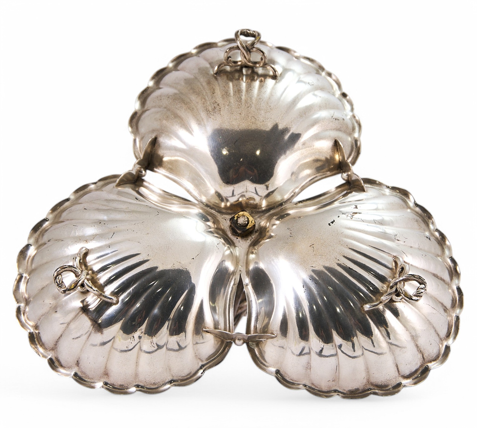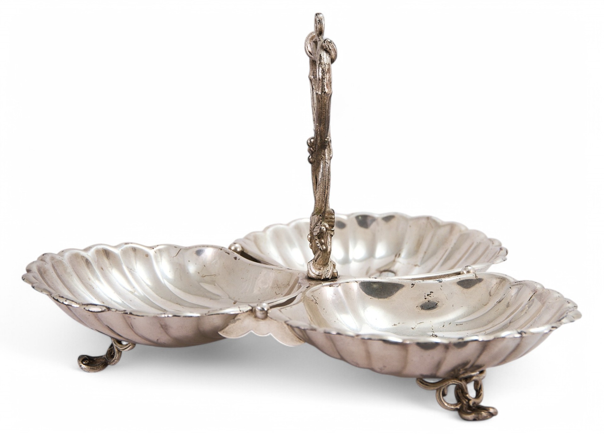 Посеребренная столовая передача в виде композиции из 3 чаш в форме плоскойморской раковины, соединенных по