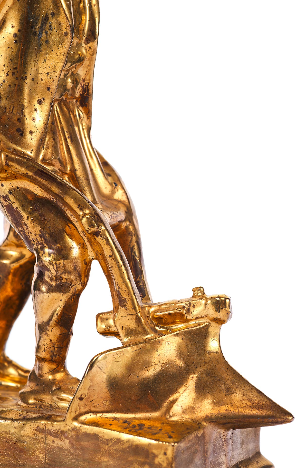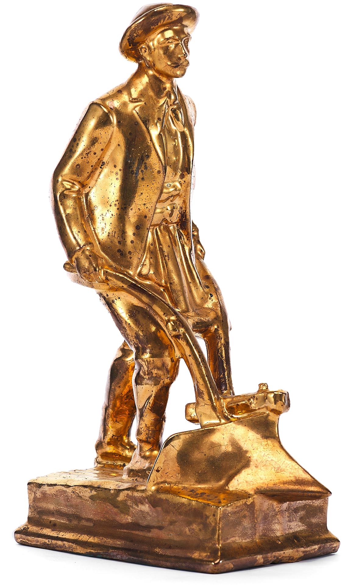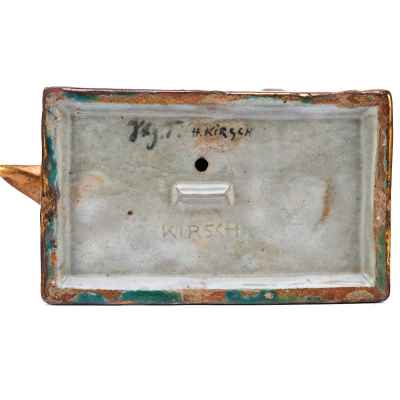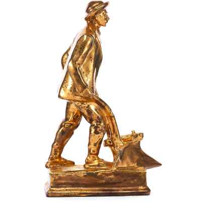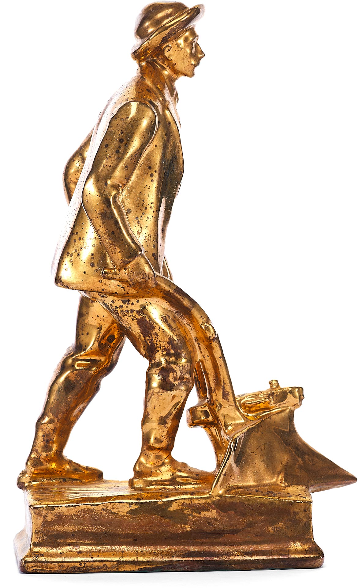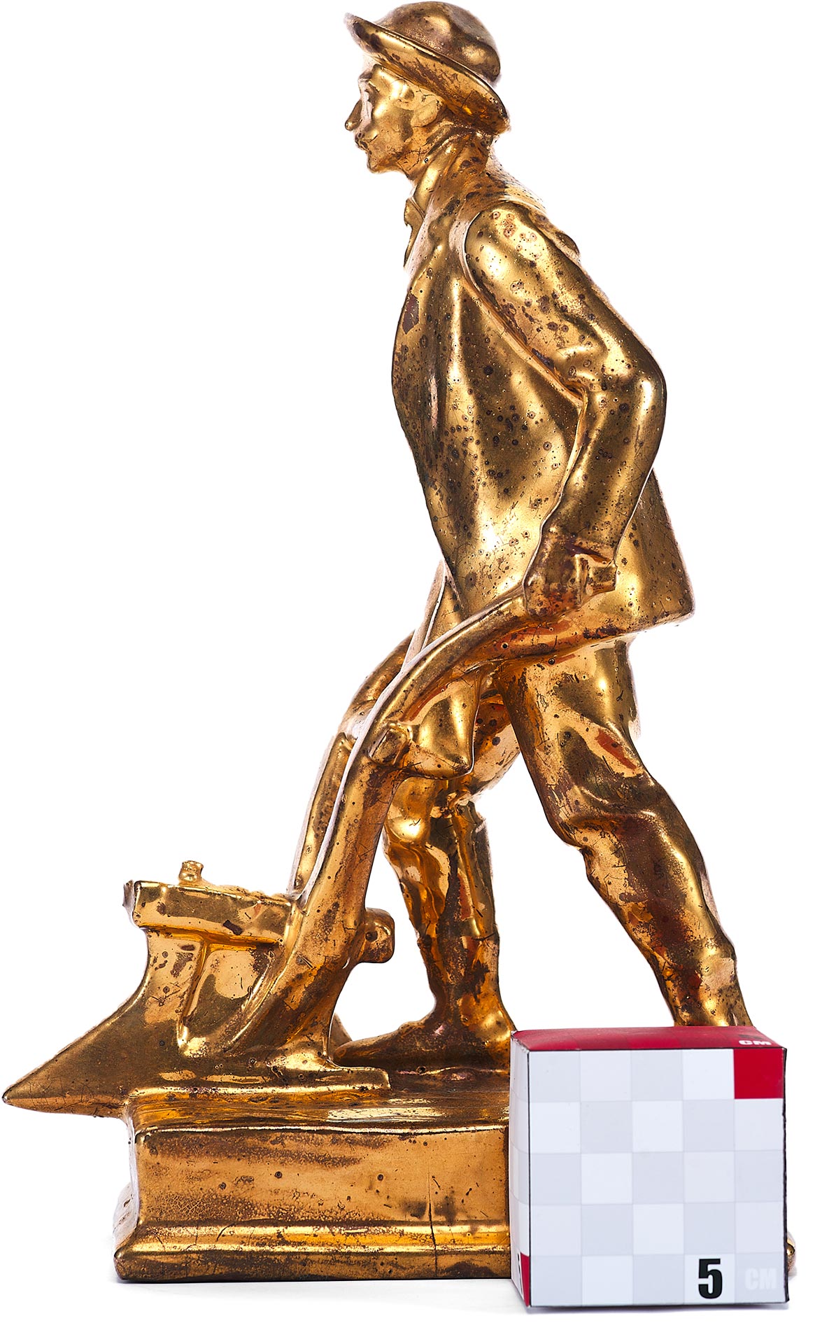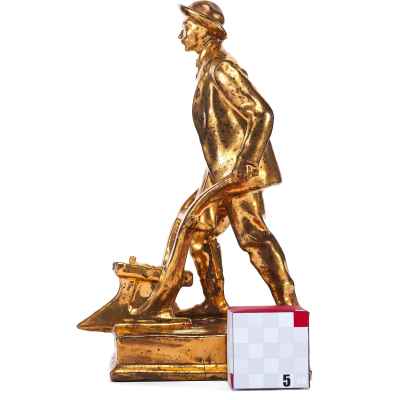 Скульптура европейского пахаря с плугом. Скульптура позолочена. На основании рельефное клеймо: «KIRSCH». Выше подпись: «H.Kirsch». Керамические скульптуры австрийского скульптора Хьюго Кирша изготавливались в Австрии.