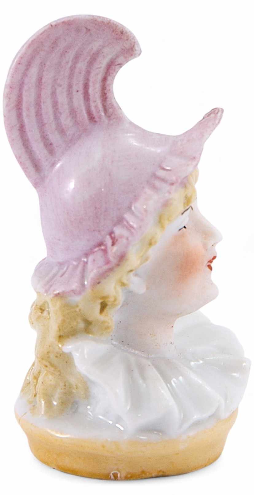 Навершие для пробки в виде головы Пьеро в розовом колпаке. Украшение наверший пробок фигурками людей было популярно. Ещё во второй четверти XIX в. по всей Европе в изобразительном искусстве, вместо прежних героических персонажей или мифологических и библейских образов возникают жанровые сюжеты, посвященные народной теме. Таким образом, элитное общество начинает проявлять интерес к тематике маленького человека, обывателя. Это предмет быта, забытый в наши дни. В приличных домах было не принято закупоривать уже открытую бутылку просто деревянной пробкой.