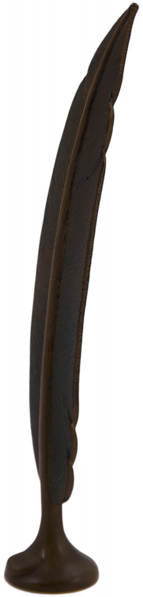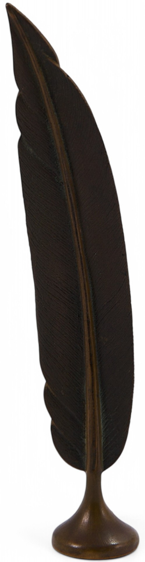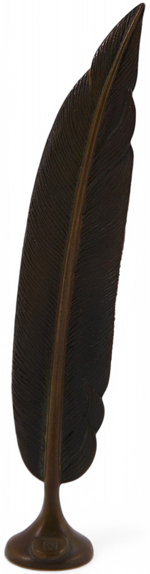 Бронзовая печать, ручка которой выполнена в форме пишущего пера. На основании клеймо производителя. Печать представляет собой типичный пример кабинетной бронзовой пластики первой трети XX в. довольно популярной в Европе.