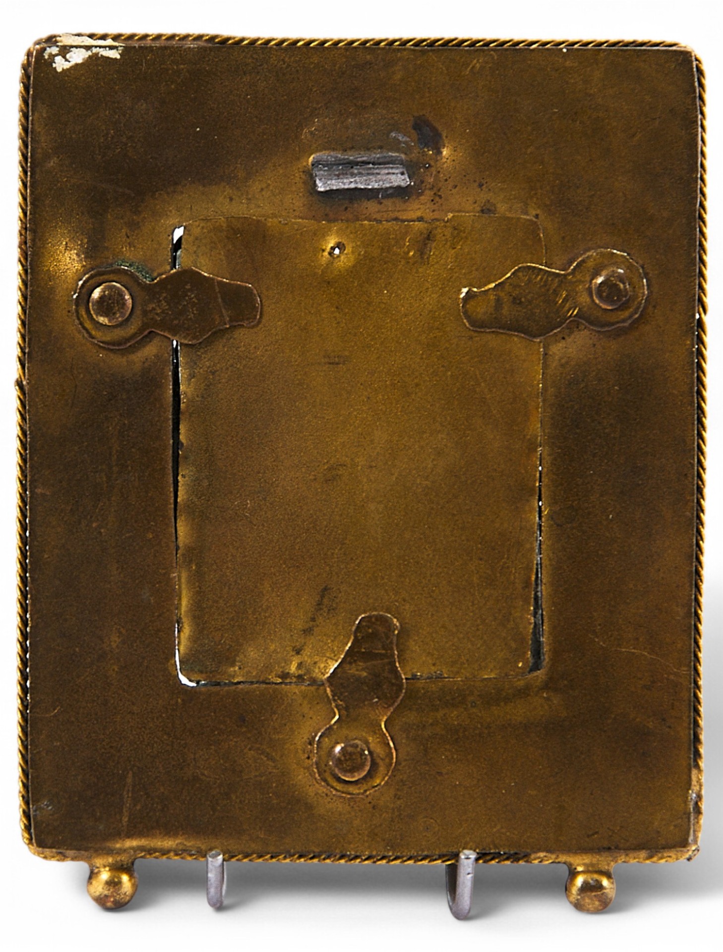 Прямоугольная рамка с внутренним овалом, украшенным металлическим ободком. Рамка выложена цветной мозаикой из смальты: в уголках яркие цветочки, чередующиеся с зелеными листьями. На обратной стороне — опора на витой ножке.