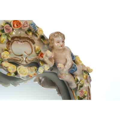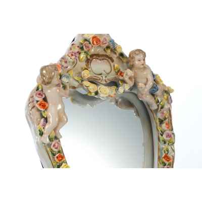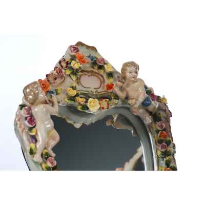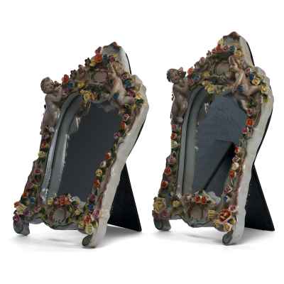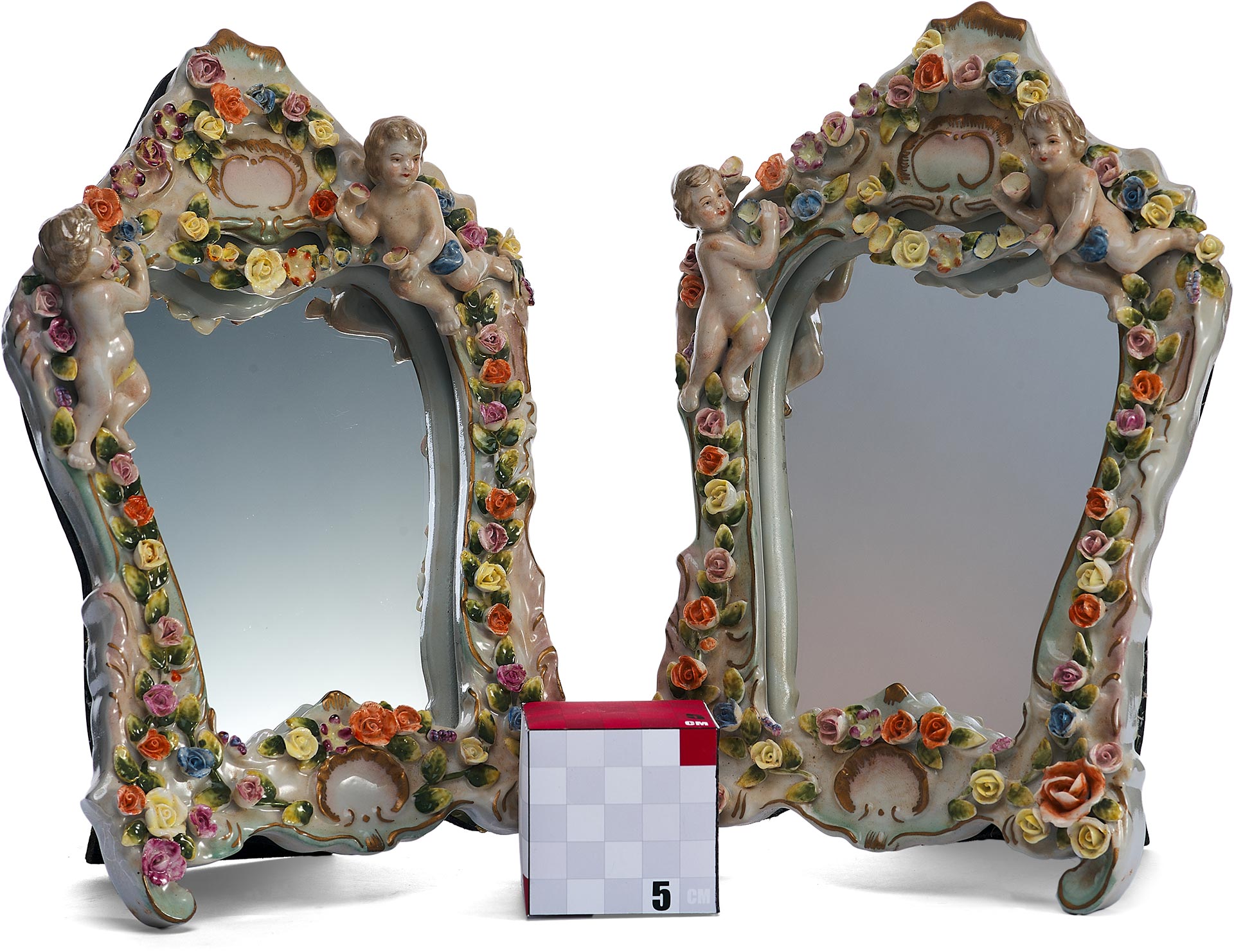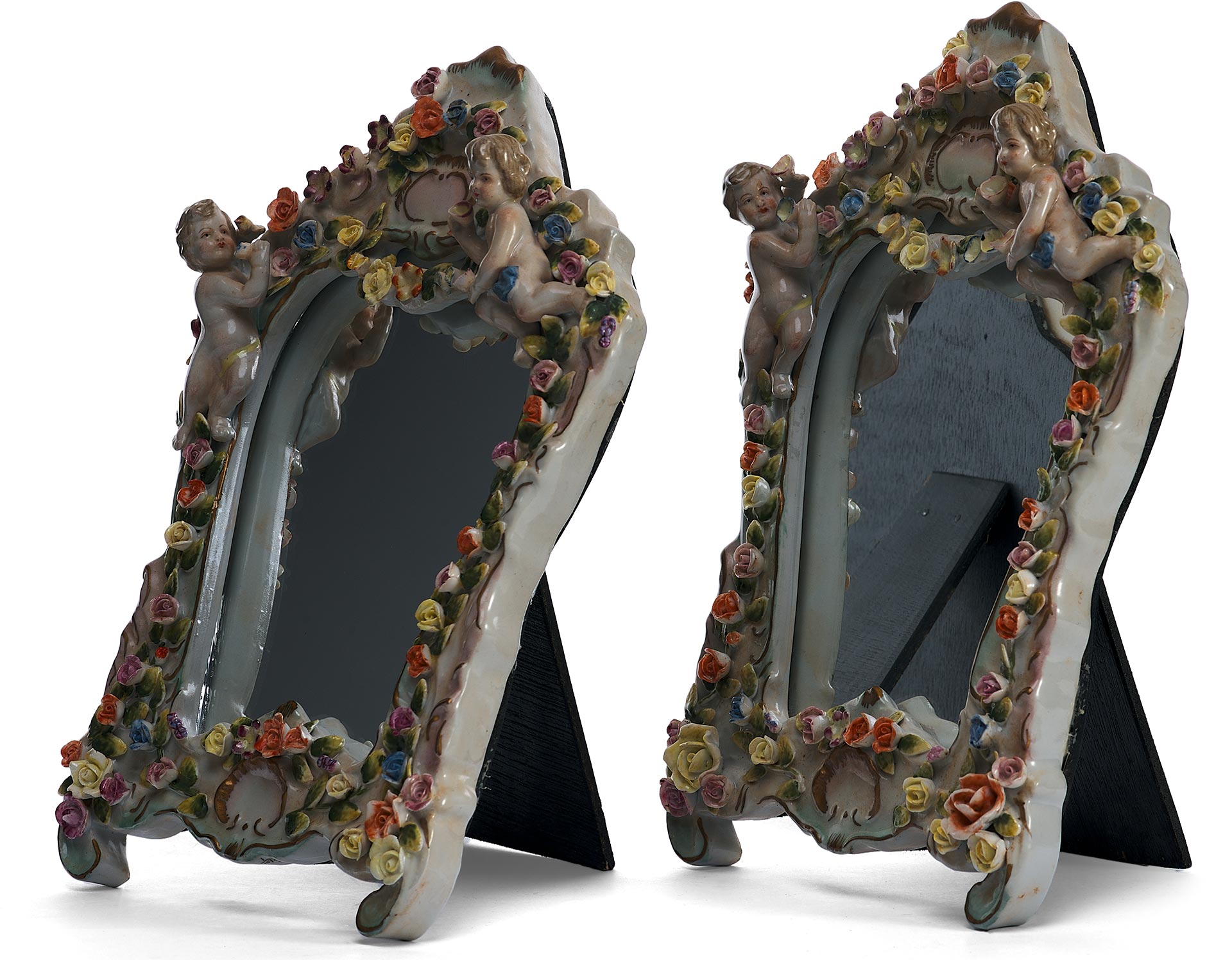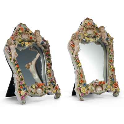 Парные зеркала в фарфоровых рамках украшенные цветочными гирляндами и фигурками путти. Такую продукцию изготовляла Мейсенская фарфоровая мануфактура в последней четверти XX по сегодняшний день. Мейсенская фарфоровая мануфактура - марка немецкого фарфора. Название произошло от места, где впервые в Европе стал производиться фарфор, саксонском городке Мейсен. Твердый фарфор, изготавливается на заводе Meissen с 1710 года до настоящего времени. Это был первый настоящий фарфор, успешно произведенный в Европе, приблизительно до 1756 года он доминировал среди европейского фарфора. Позднее лидерство окончательно перешло к французскому севрскому фарфору (Sěvres). Тем не менее, мейсенский фарфор не теряет своей ценности для коллекционеров и в наши дни.