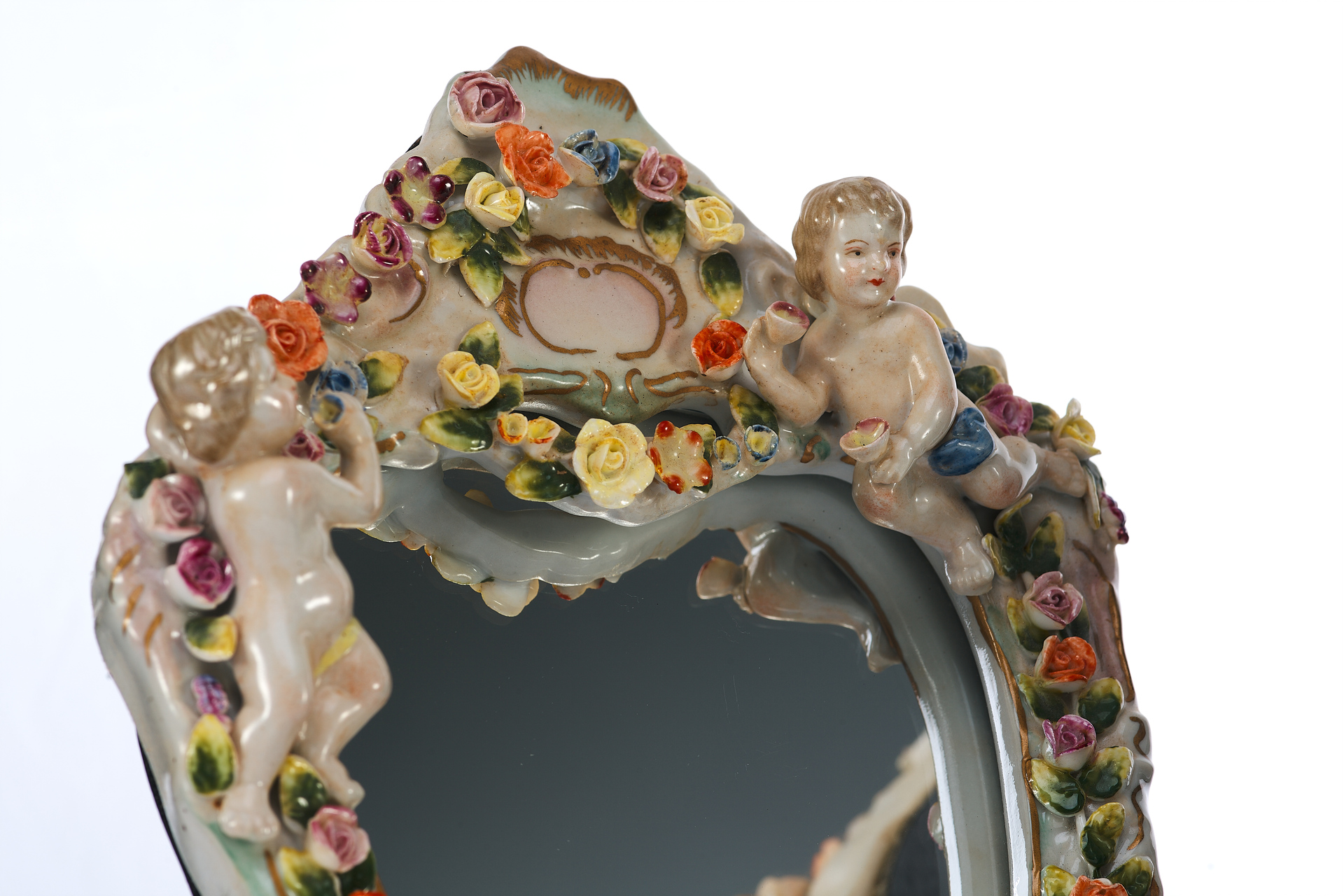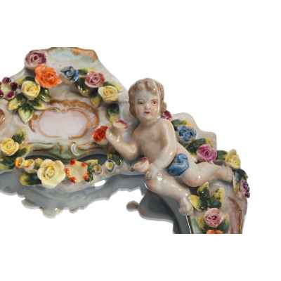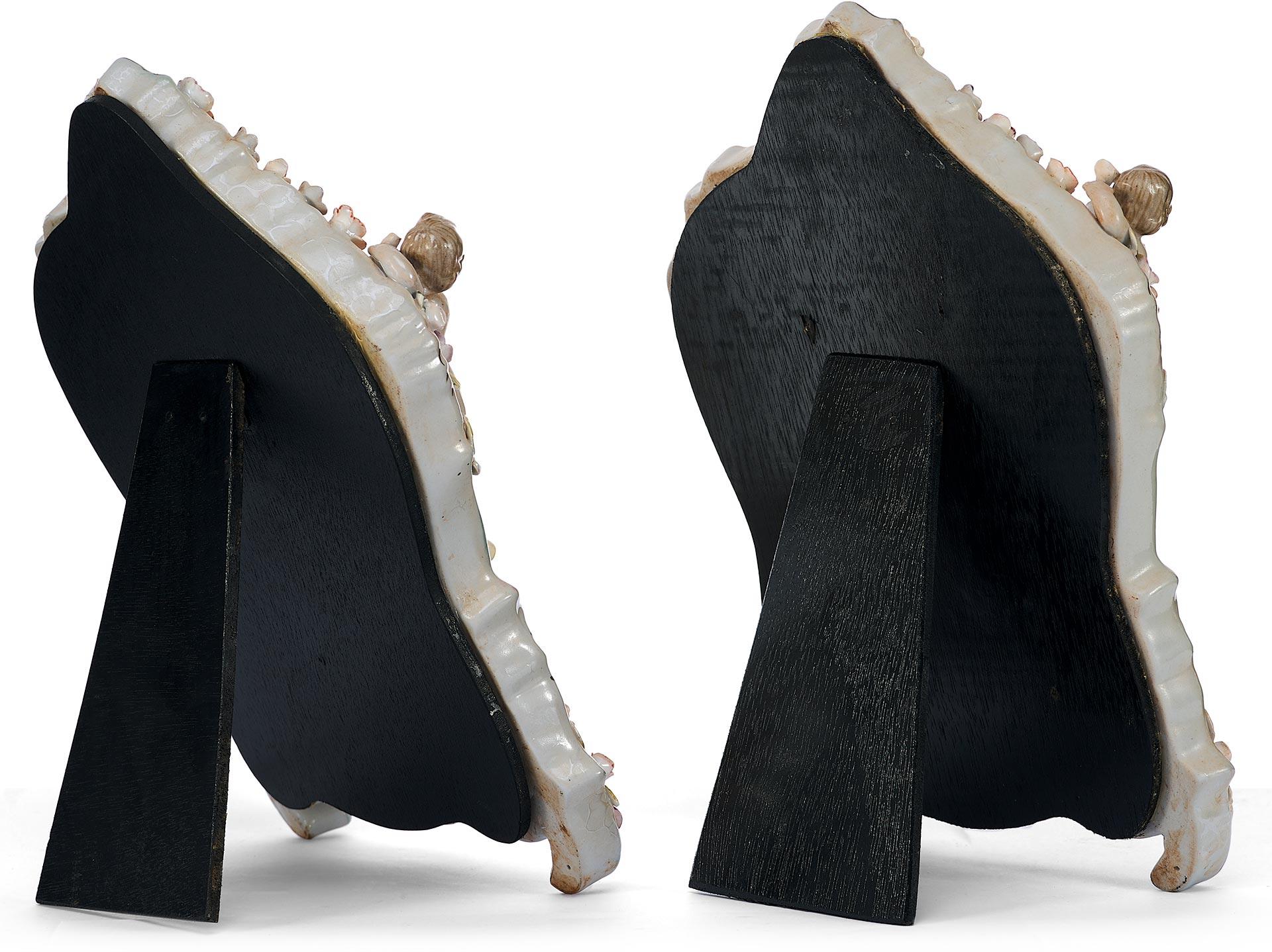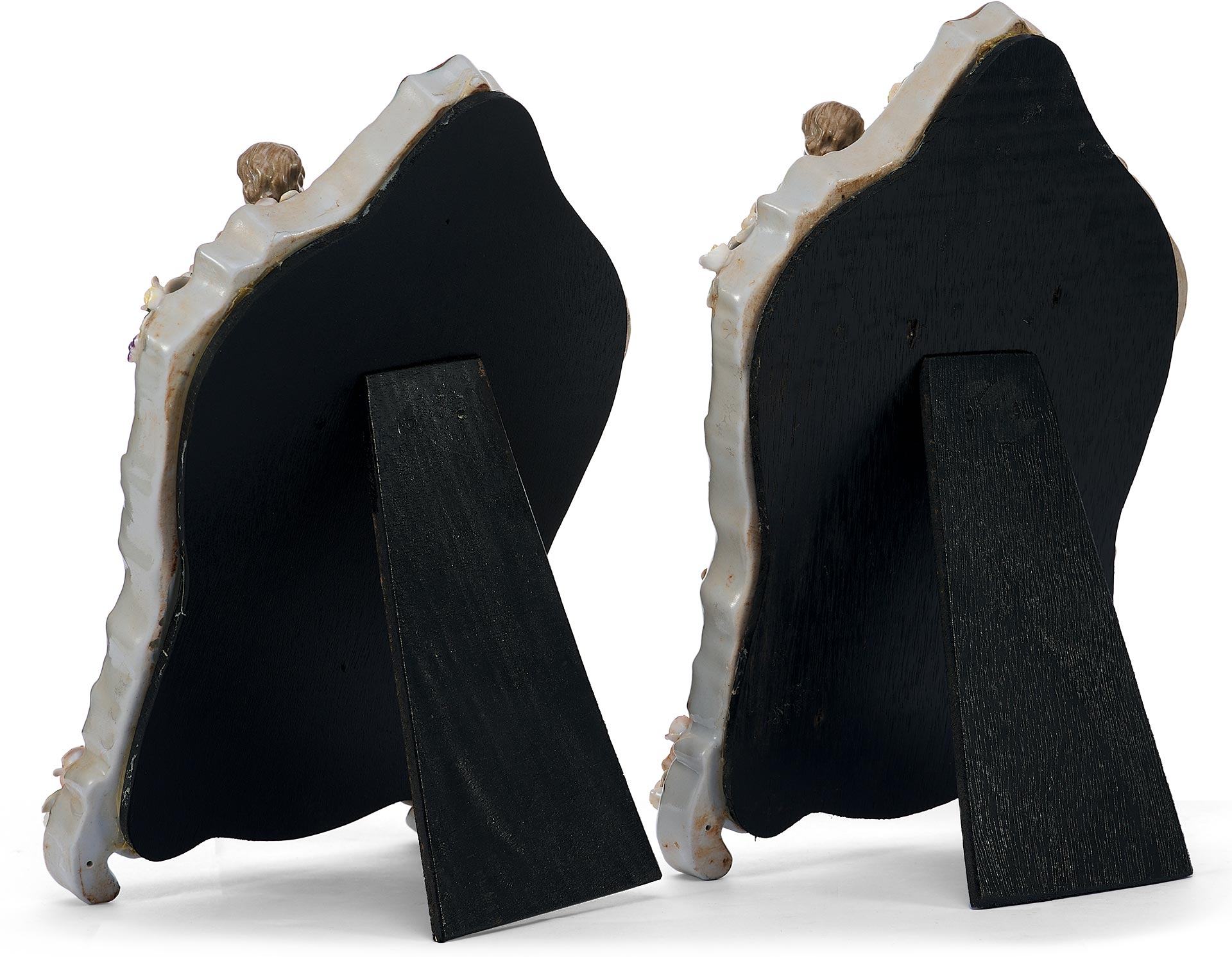 Парные зеркала в фарфоровых рамках украшенные цветочными гирляндами и фигурками путти. Такую продукцию изготовляла Мейсенская фарфоровая мануфактура в последней четверти XX по сегодняшний день. Мейсенская фарфоровая мануфактура - марка немецкого фарфора. Название произошло от места, где впервые в Европе стал производиться фарфор, саксонском городке Мейсен. Твердый фарфор, изготавливается на заводе Meissen с 1710 года до настоящего времени. Это был первый настоящий фарфор, успешно произведенный в Европе, приблизительно до 1756 года он доминировал среди европейского фарфора. Позднее лидерство окончательно перешло к французскому севрскому фарфору (Sěvres). Тем не менее, мейсенский фарфор не теряет своей ценности для коллекционеров и в наши дни.
