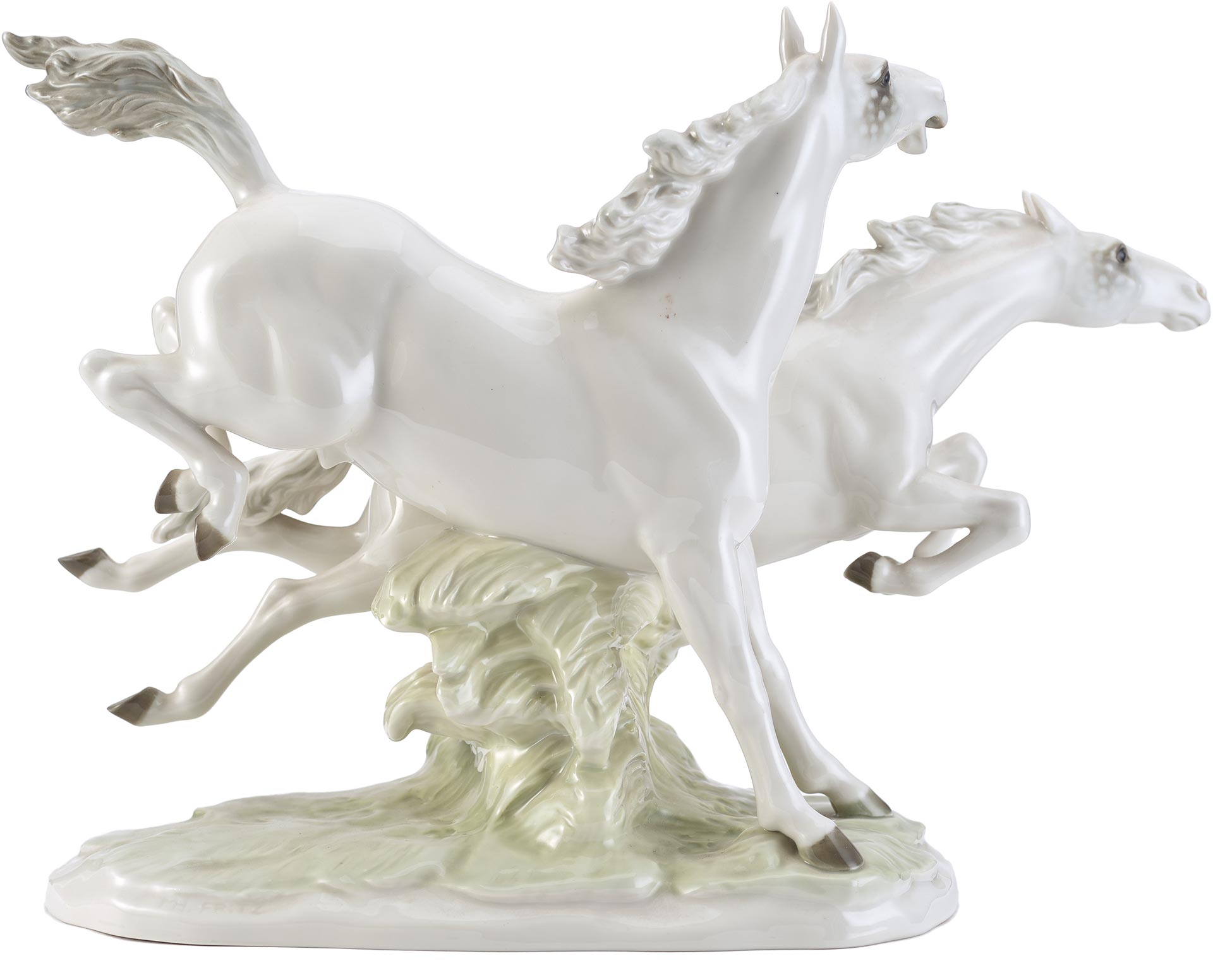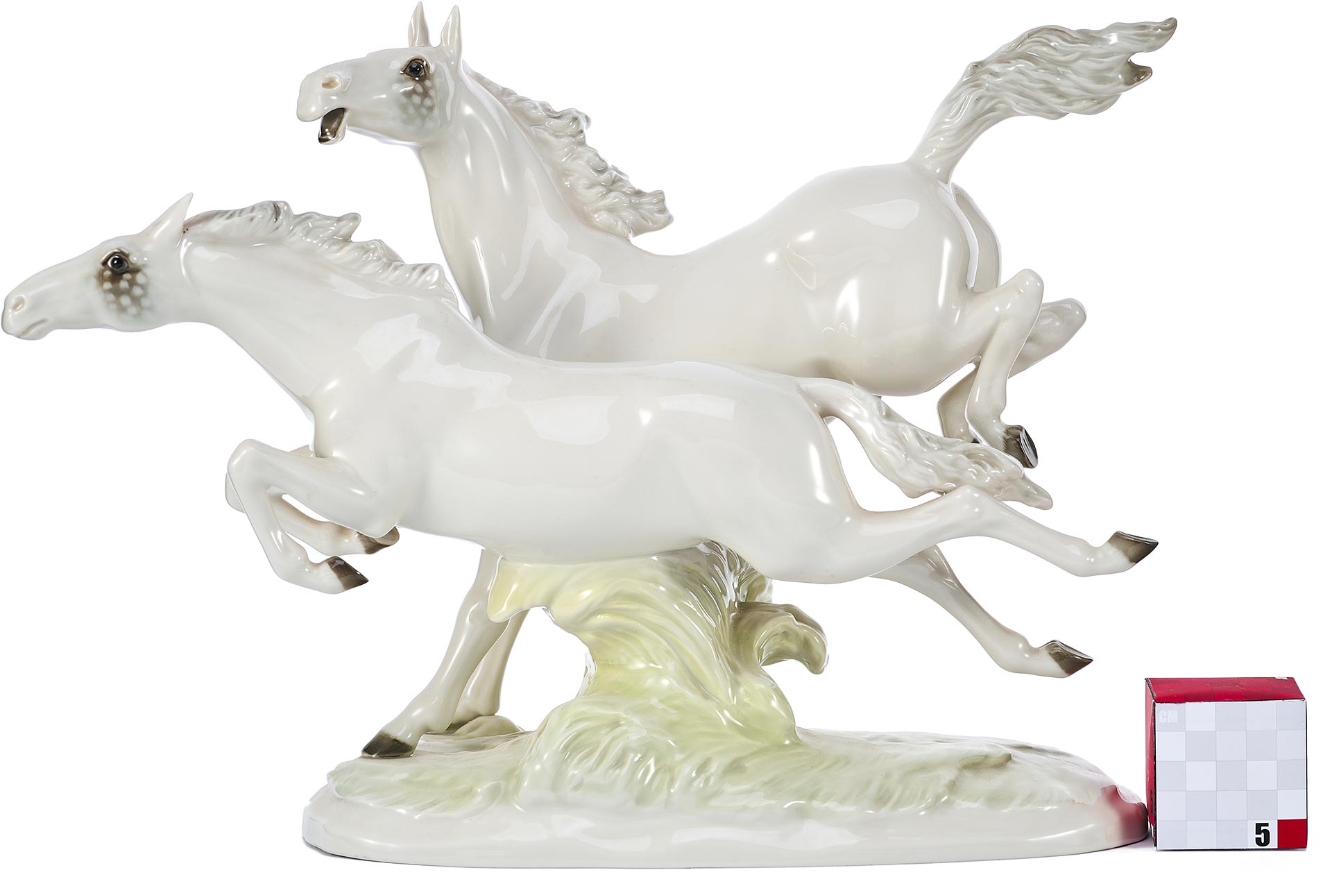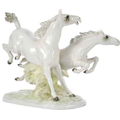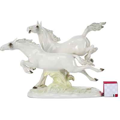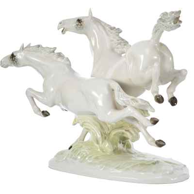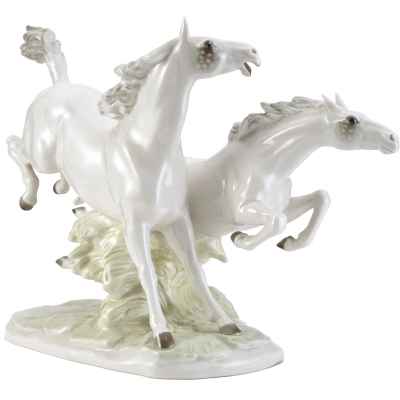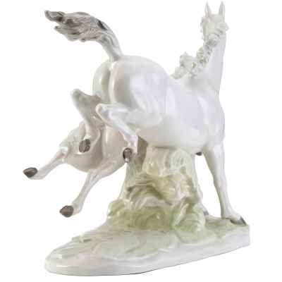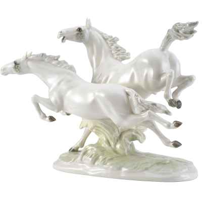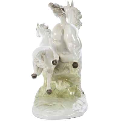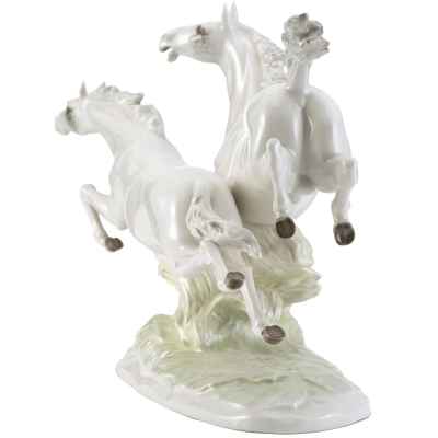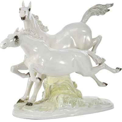 Фарфоровая композиция «Летящие кони» является коллекционным произведением, отражающим традиции немецкого фарфорового искусства и мастерство скульпторов фабрики Hutschenreuther. Подобные работы востребованы среди любителей анималистической пластики и антикварного фарфора.