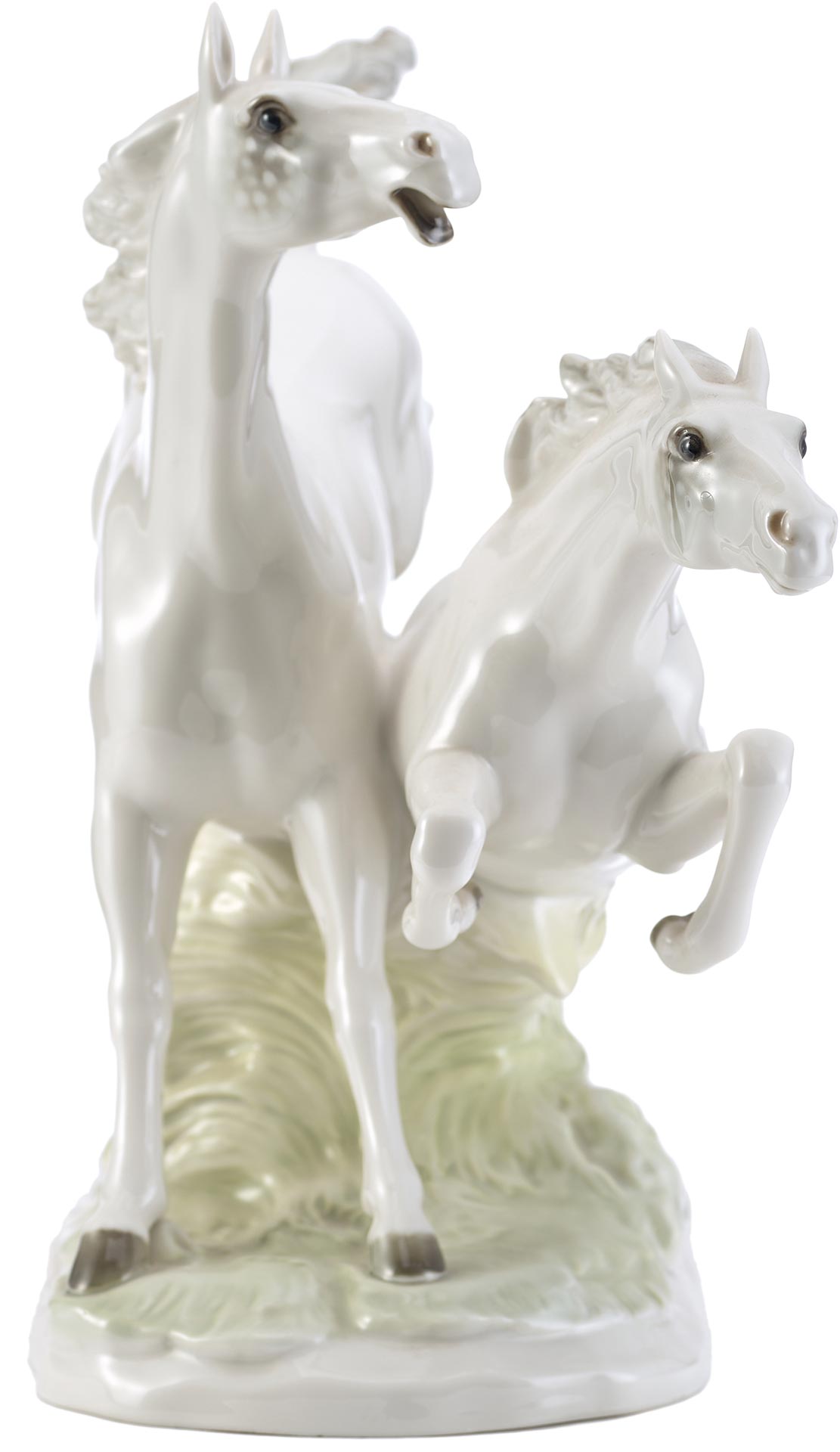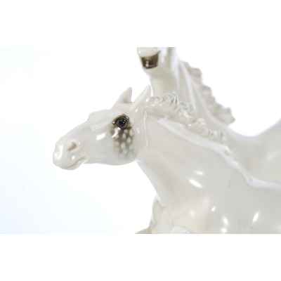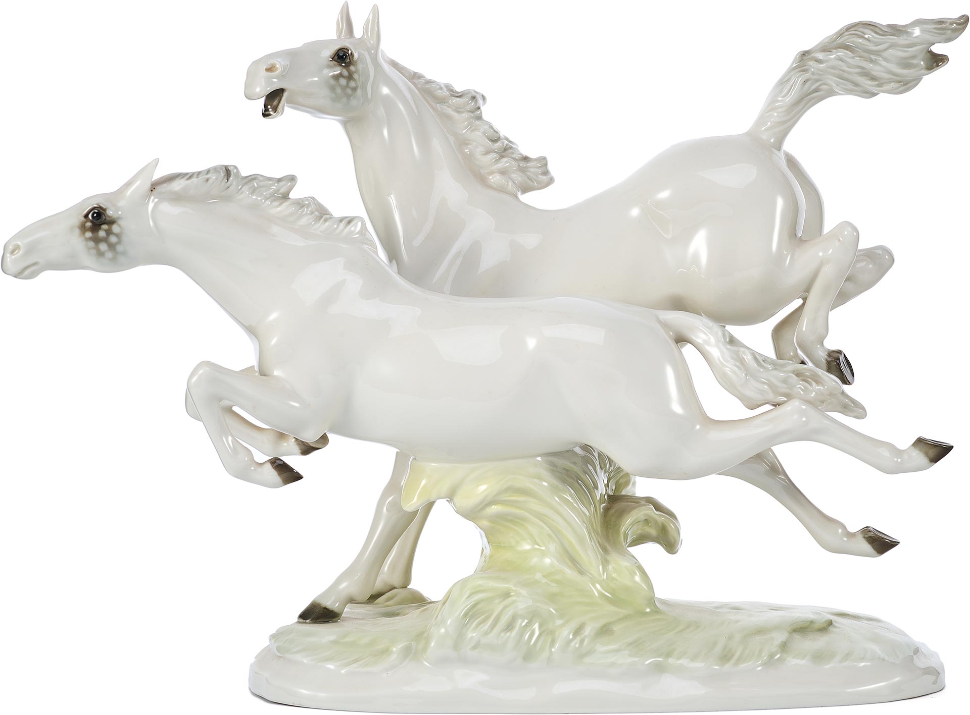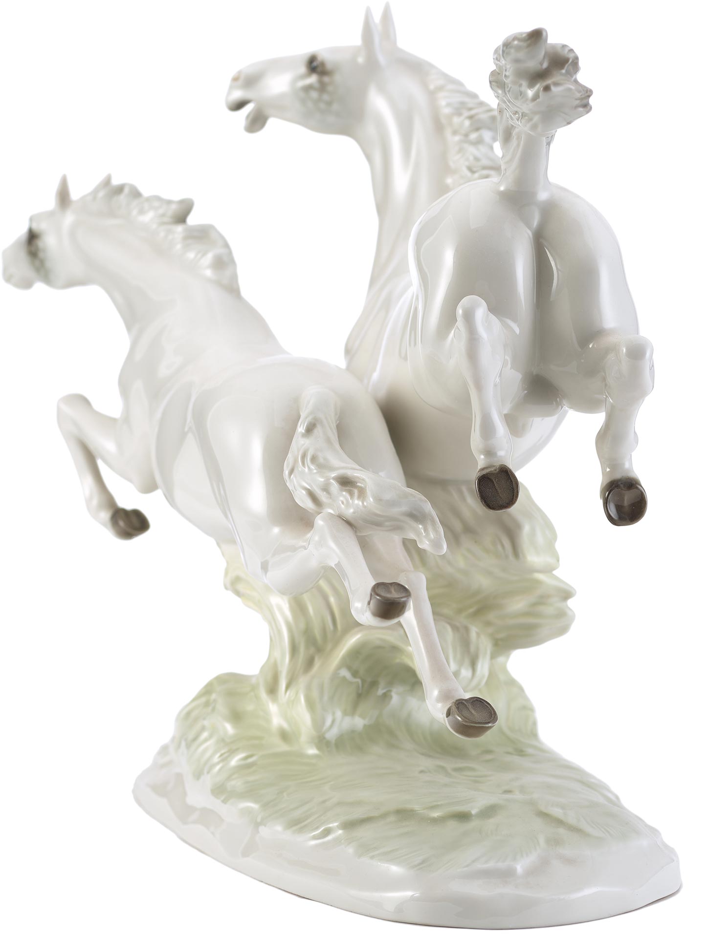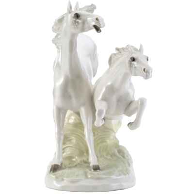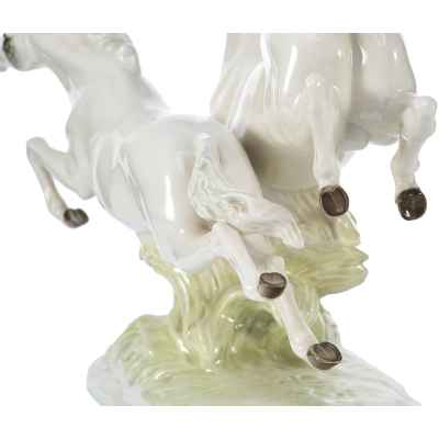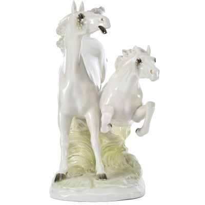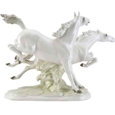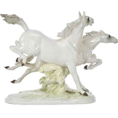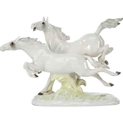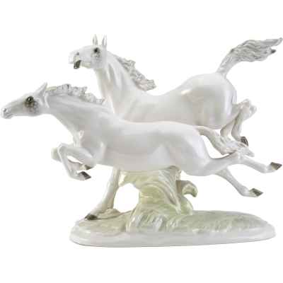 Фарфоровая скульптура «Летящие кони» изображает двух белых коней в стремительном движении по лугу. Композиция отличается динамичностью и выразительностью, передавая грацию и мощь животных.