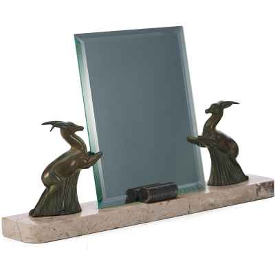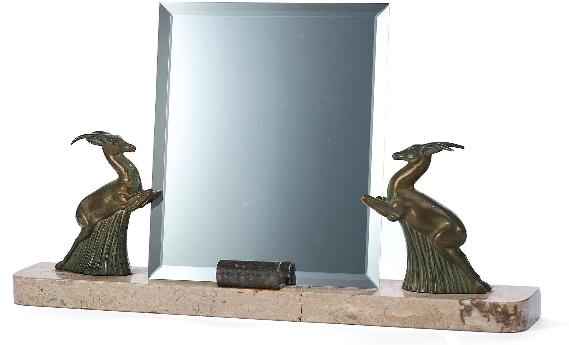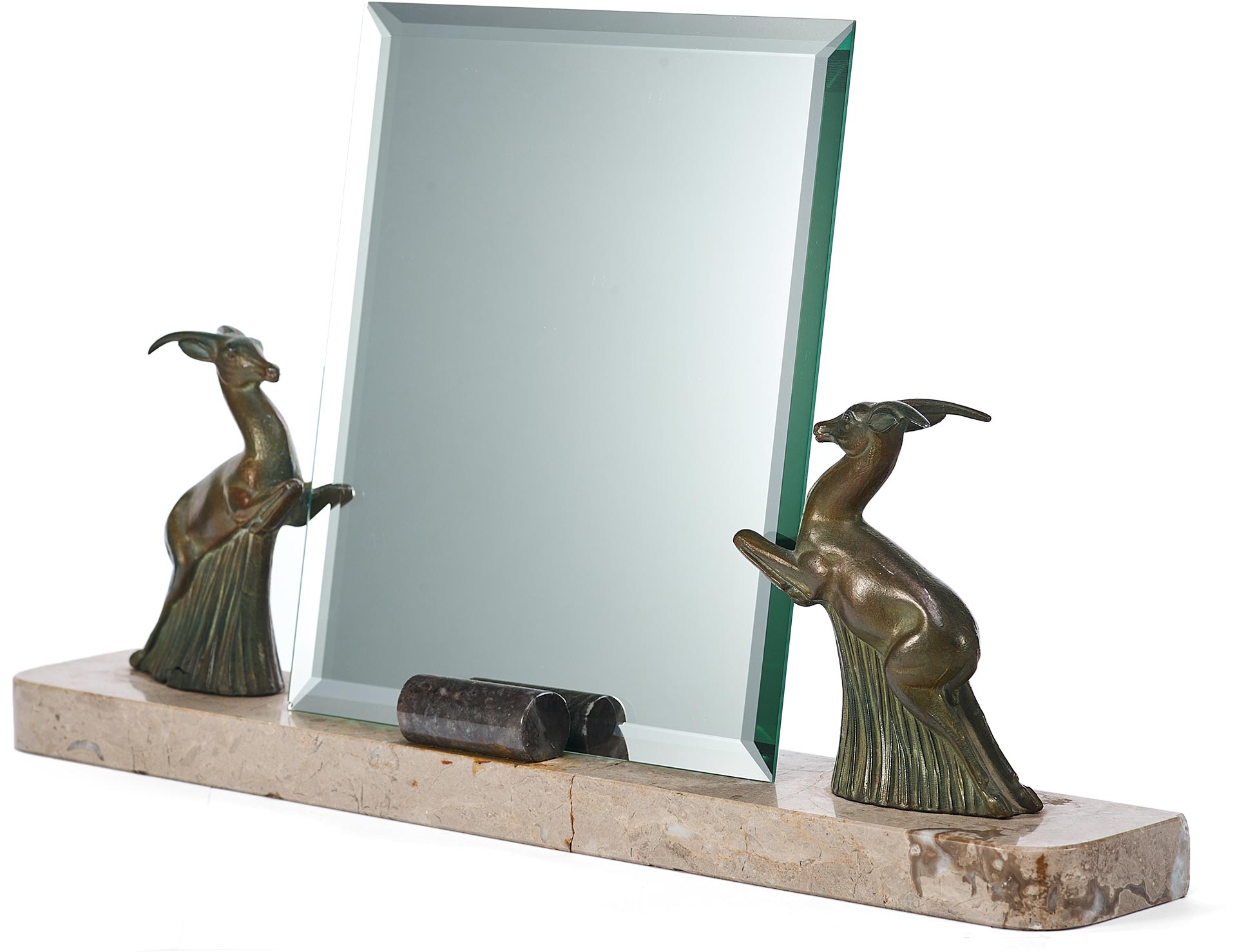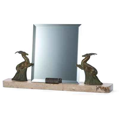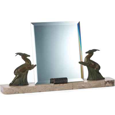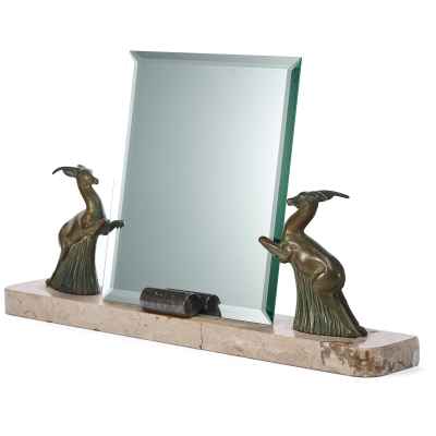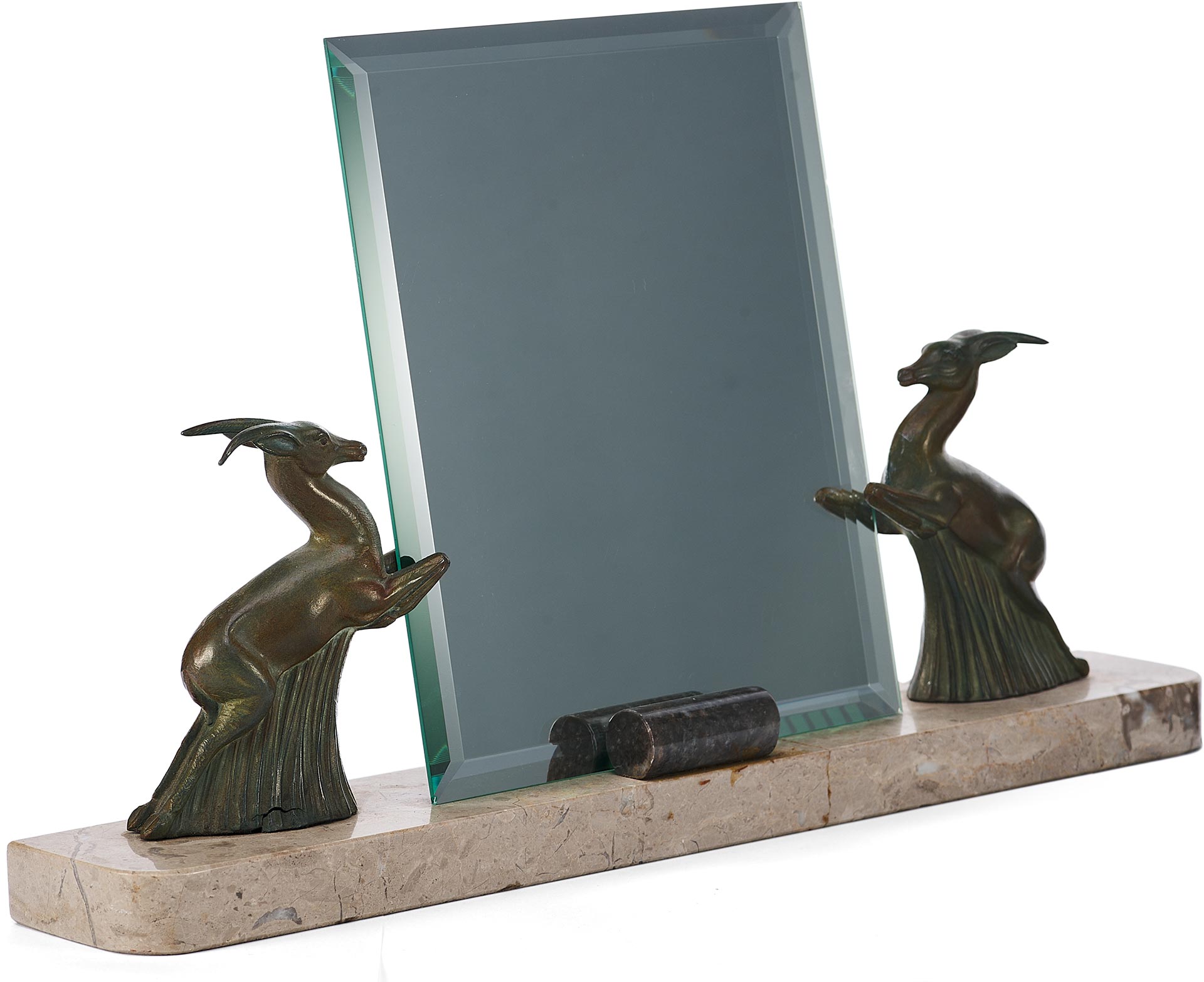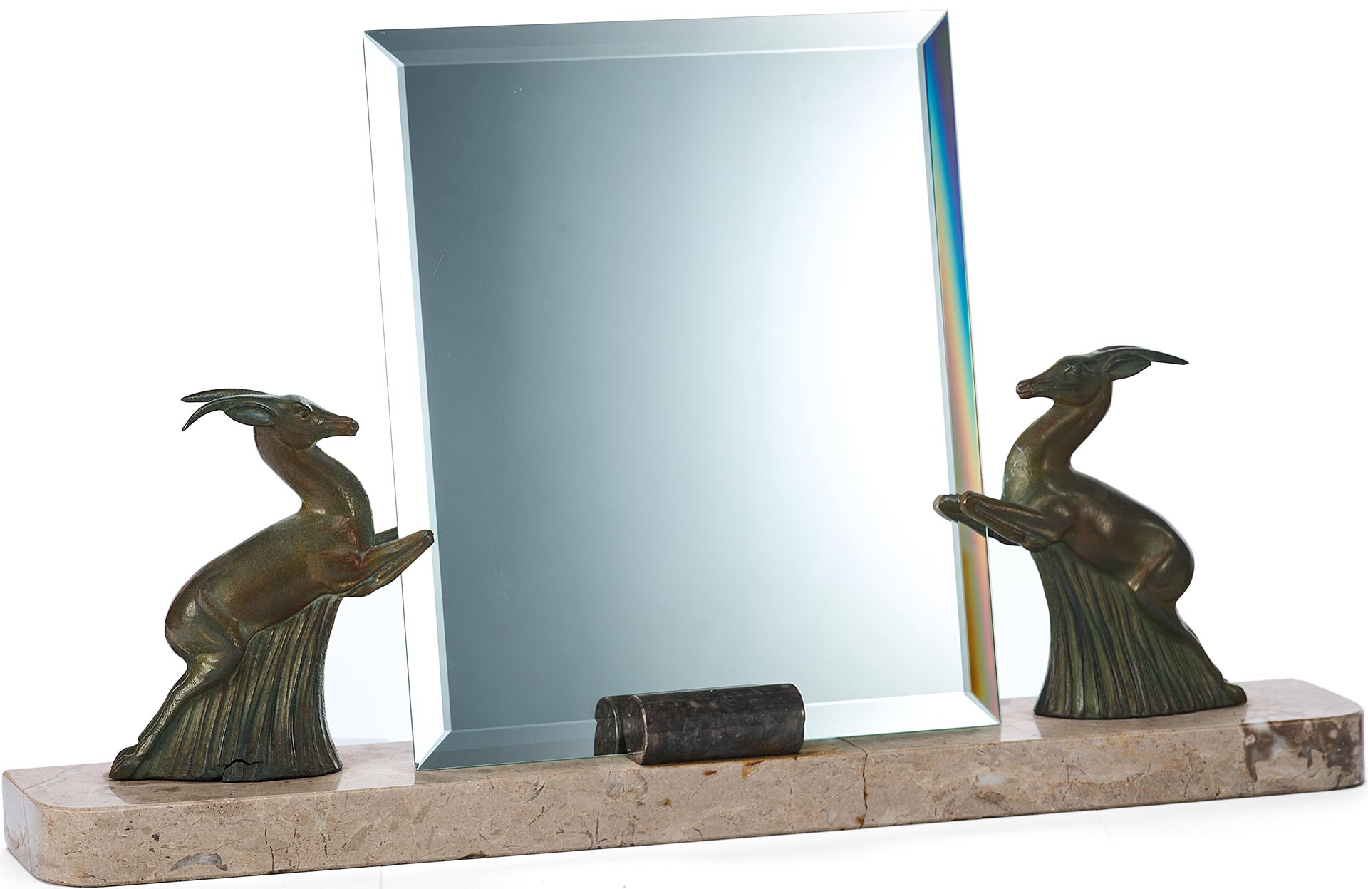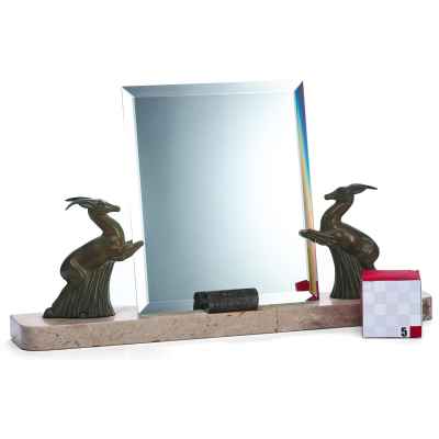 Особое внимание привлекают декоративные фигурки антилоп, расположенные по обе стороны зеркала. Их стилизованные, обтекаемые формы — характерный мотив ар-деко, подчёркивающий динамизм, грацию и природные начала, интерпретированные в геометризованной, но всё ещё живой пластике. Фигуры опираются передними ногами на раму зеркала, будто удерживая его — приём, типичный для предметов с интегрированным художественным декором.