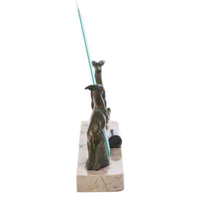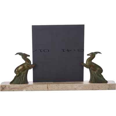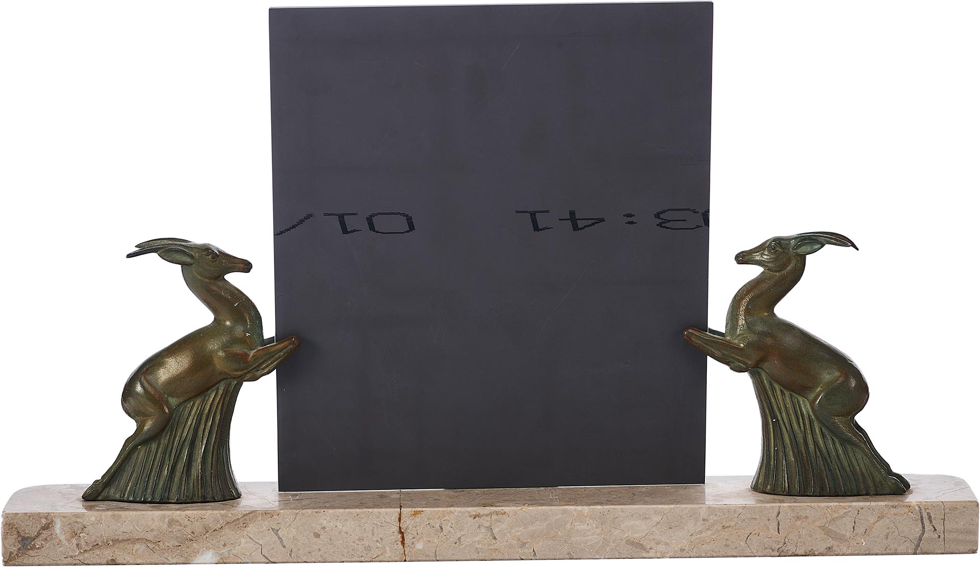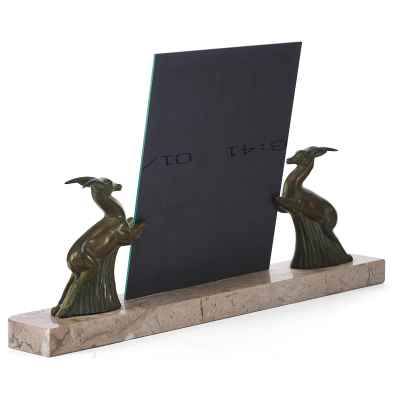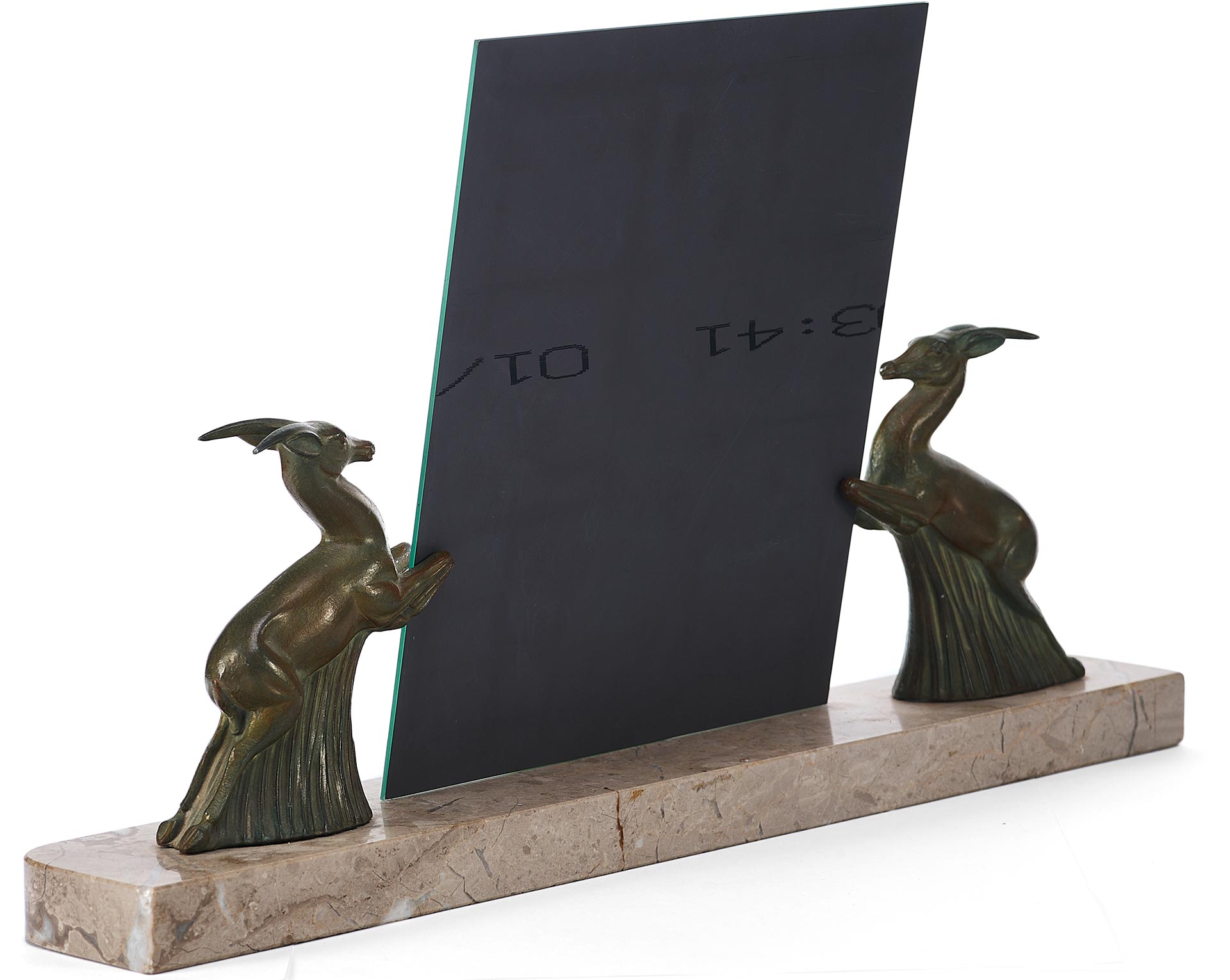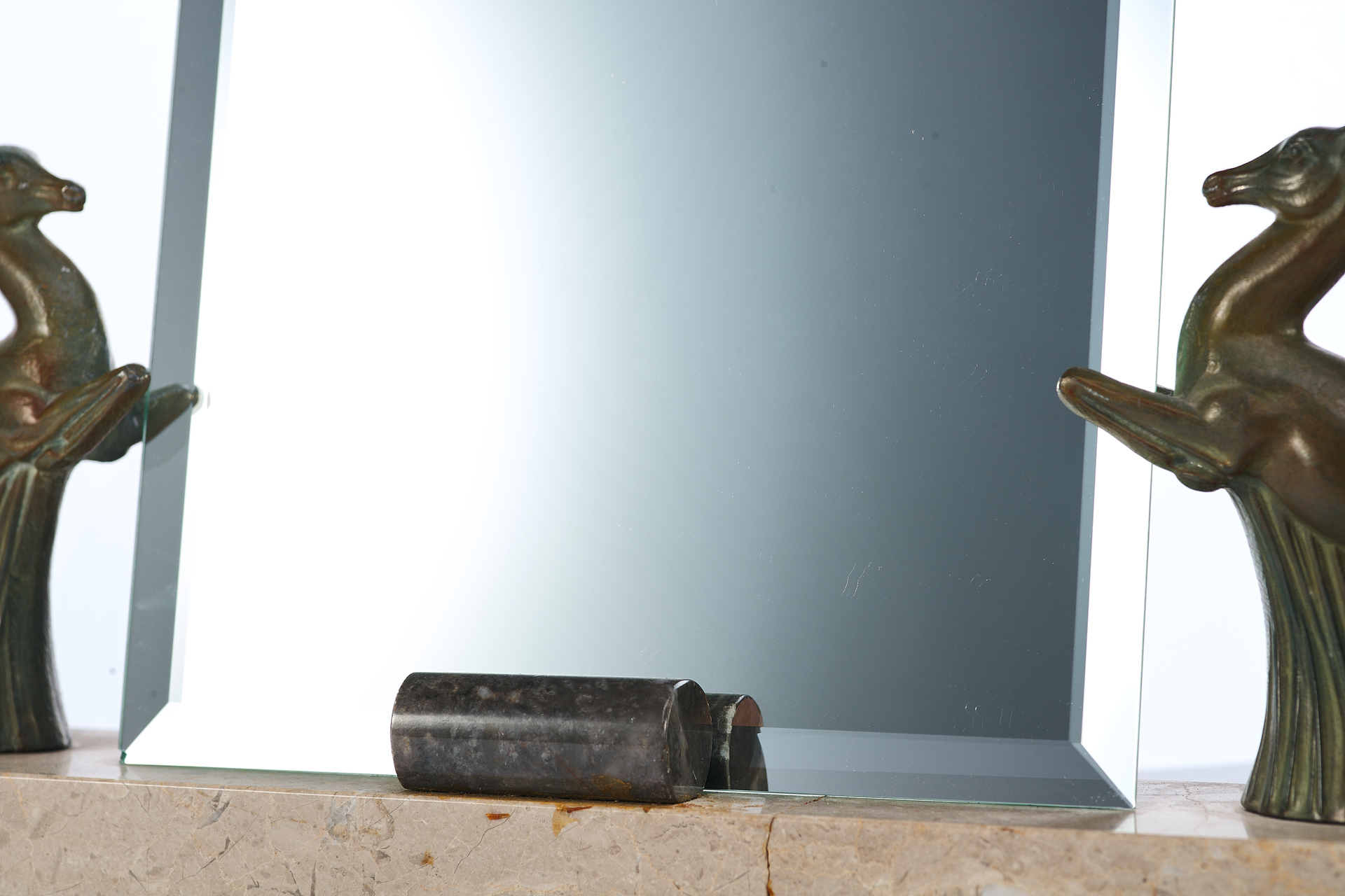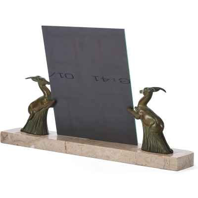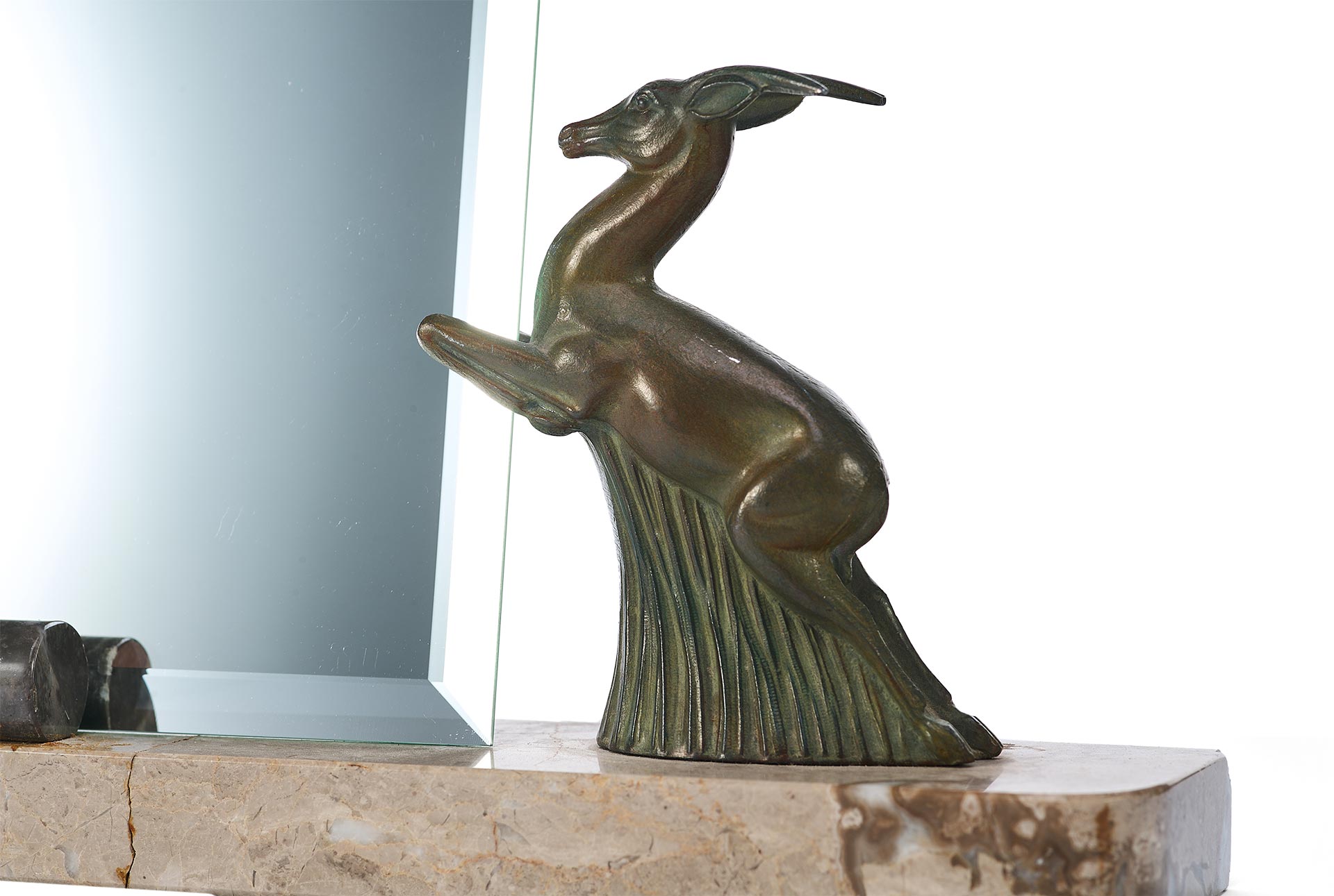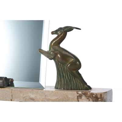 Особое внимание привлекают декоративные фигурки антилоп, расположенные по обе стороны зеркала. Их стилизованные, обтекаемые формы — характерный мотив ар-деко, подчёркивающий динамизм, грацию и природные начала, интерпретированные в геометризованной, но всё ещё живой пластике. Фигуры опираются передними ногами на раму зеркала, будто удерживая его — приём, типичный для предметов с интегрированным художественным декором.