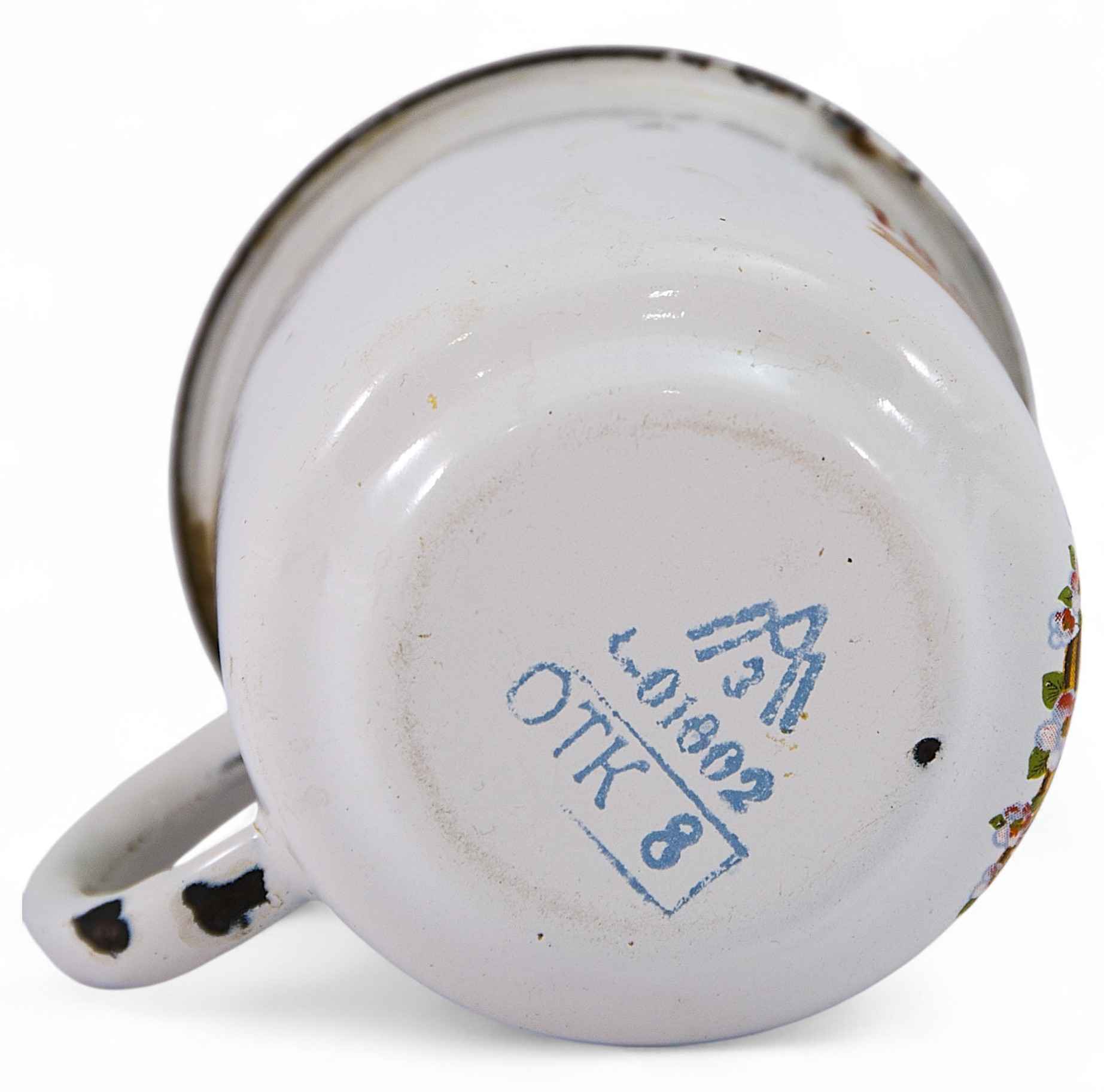 На донце кружки штампЛысьвенского металлургического завода: ЛМЗ Предмет изготовлен из утлероднстой стали с эмалированным покрытием.