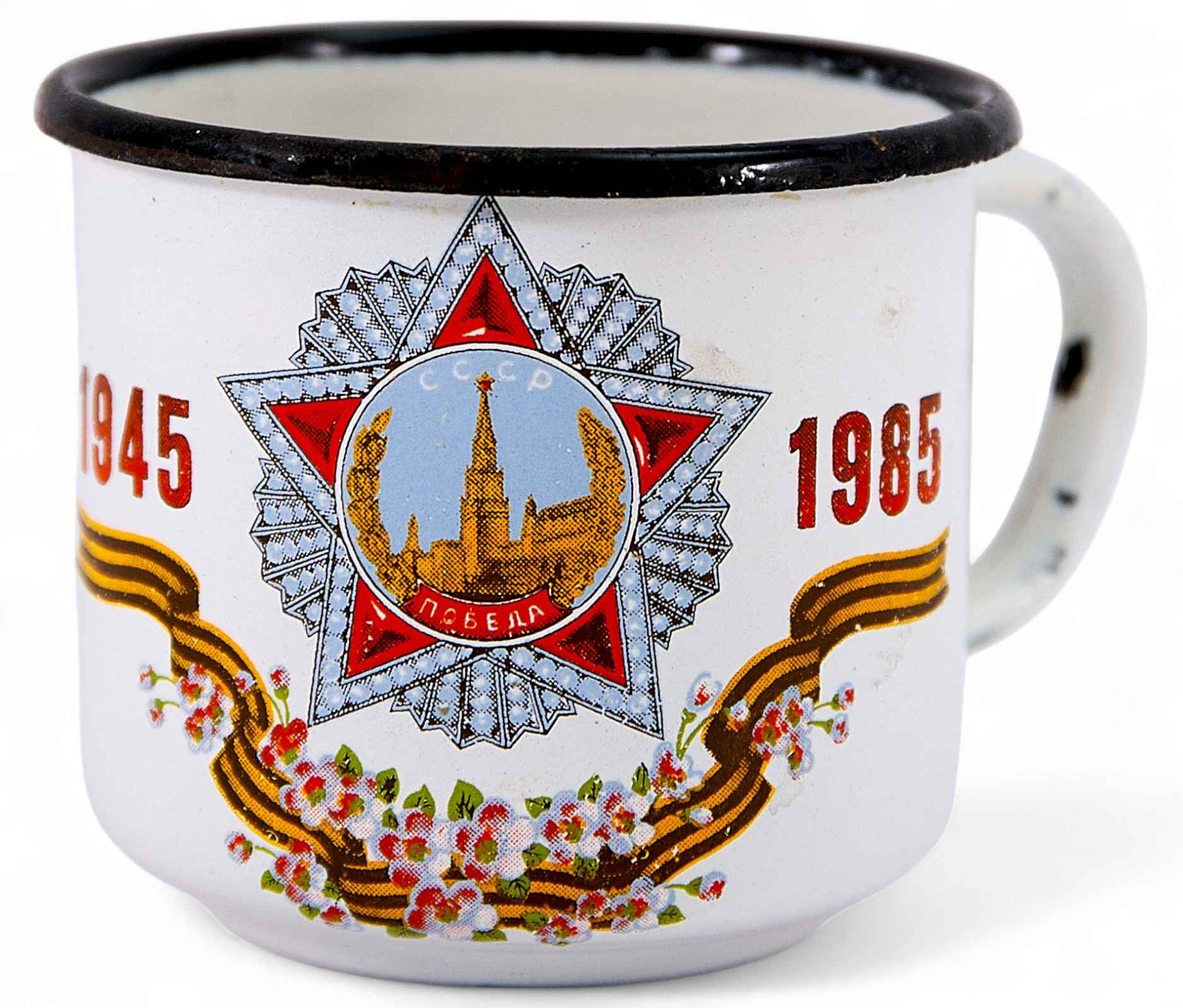 Эмалированная кружка с изображением ордена “Победы'5 — высшего военного ордена СССР. Обрамляет орден георгиевская лента, увитая цветами.