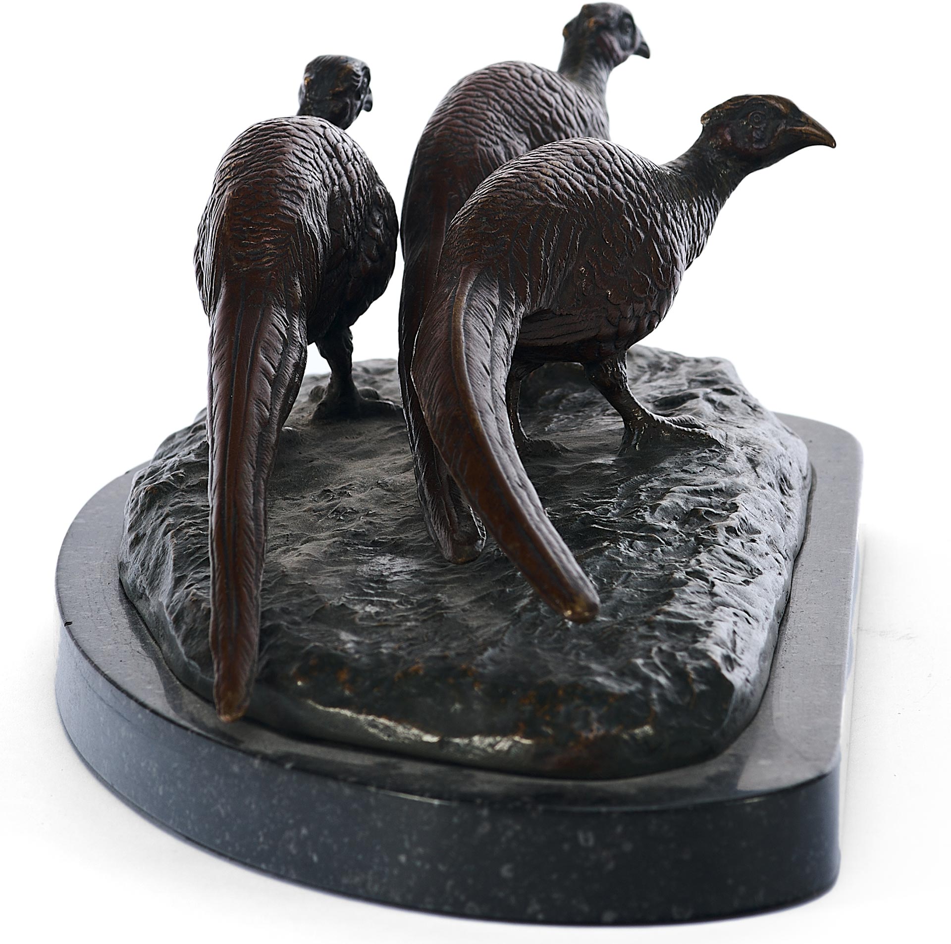 Скульптурная композиция изображает трех павлинов, расположенных на текстурированном основании, имитирующем природный ландшафт. На предмете присутствует подпись автора «Sildler», что подтверждает его оригинальность и принадлежность к профессиональному художественному производству. Анималистическая тематика пользовалась популярностью в европейской художественной бронзе того времени, особенно среди коллекционеров и знатоков охотничьей и природной эстетики.