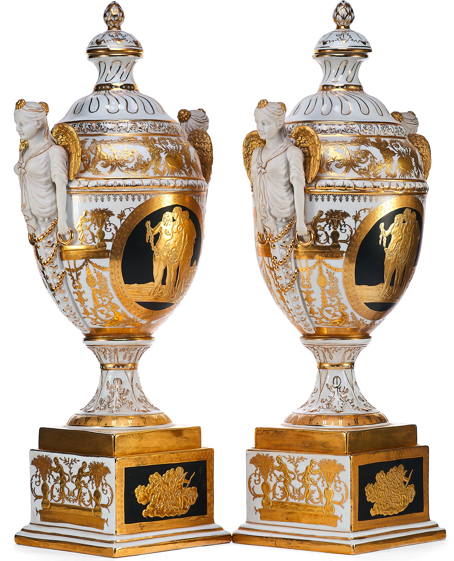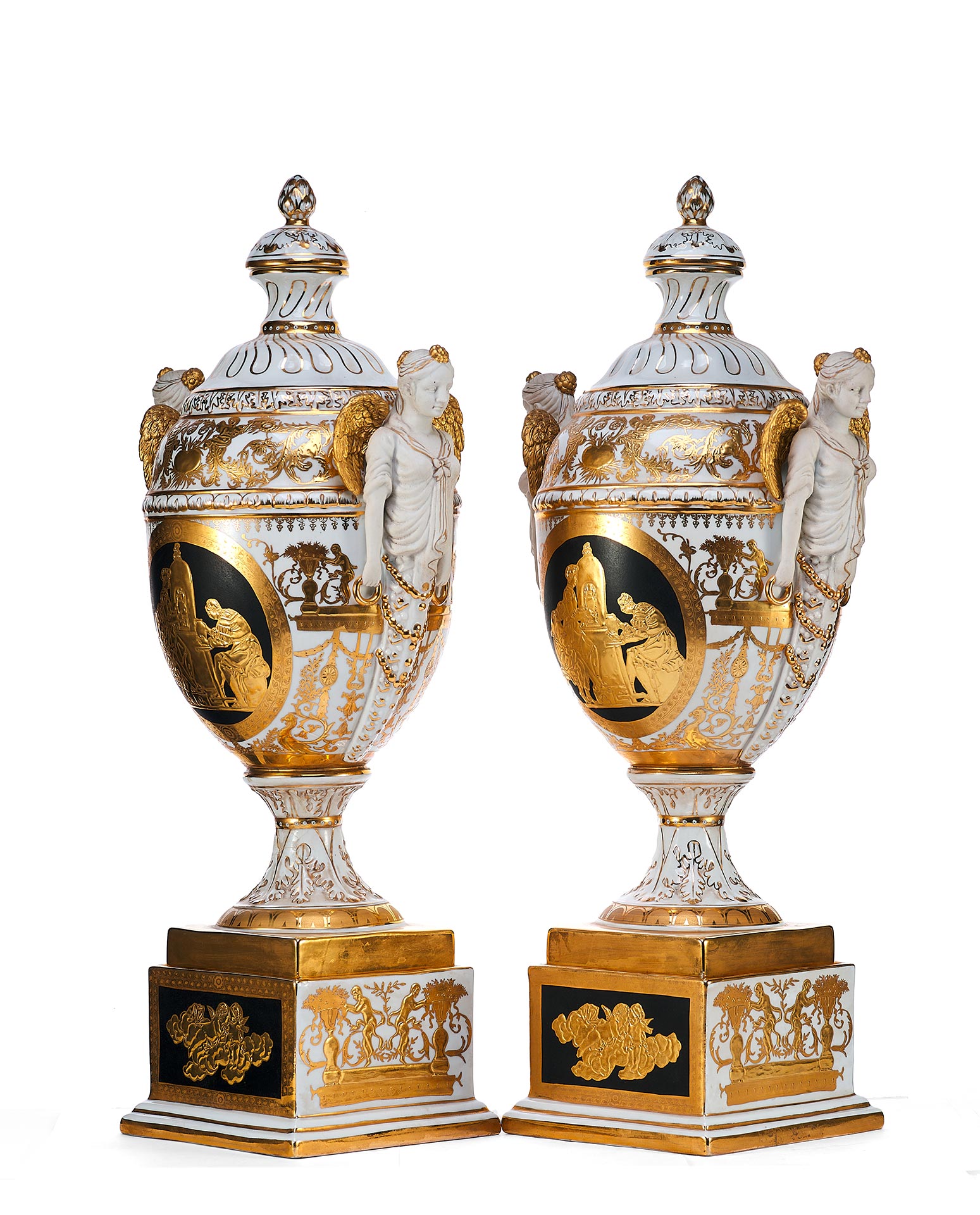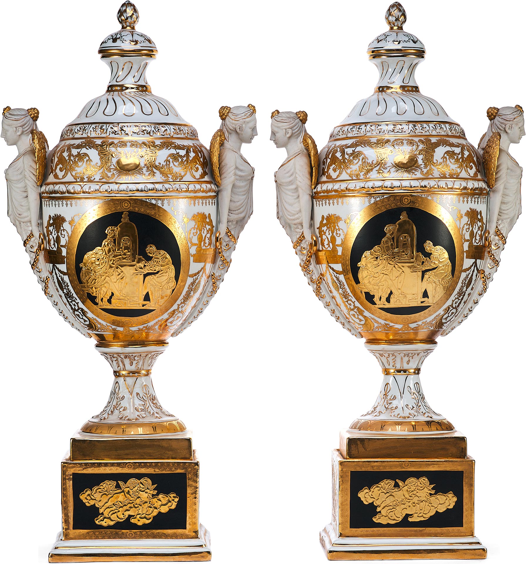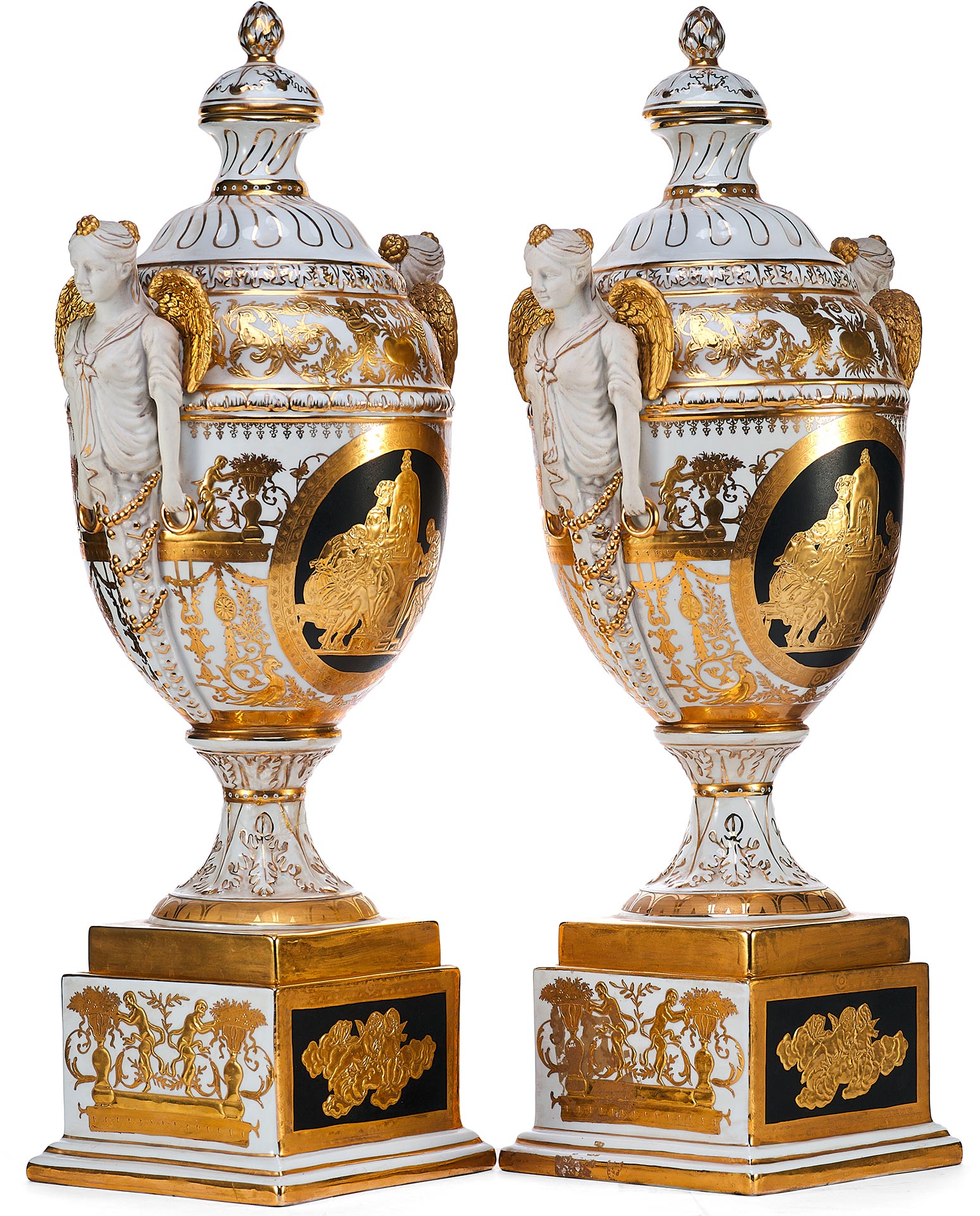 Парные вазы декорированные в стиле ампир. На вазах изображены античные грации, путти украшающие цветами садовые вазоны, изображения трех граций на улове вазы. По своему художественному оформлению ваза соответствует стилю ампир.