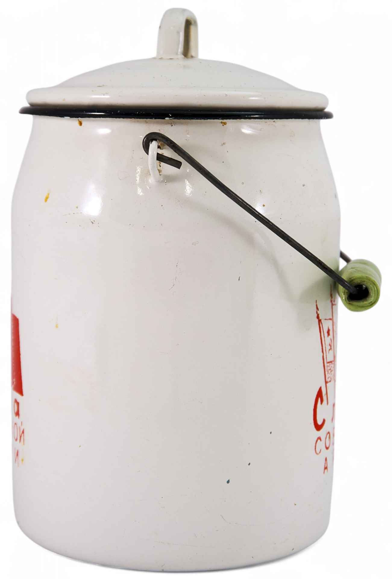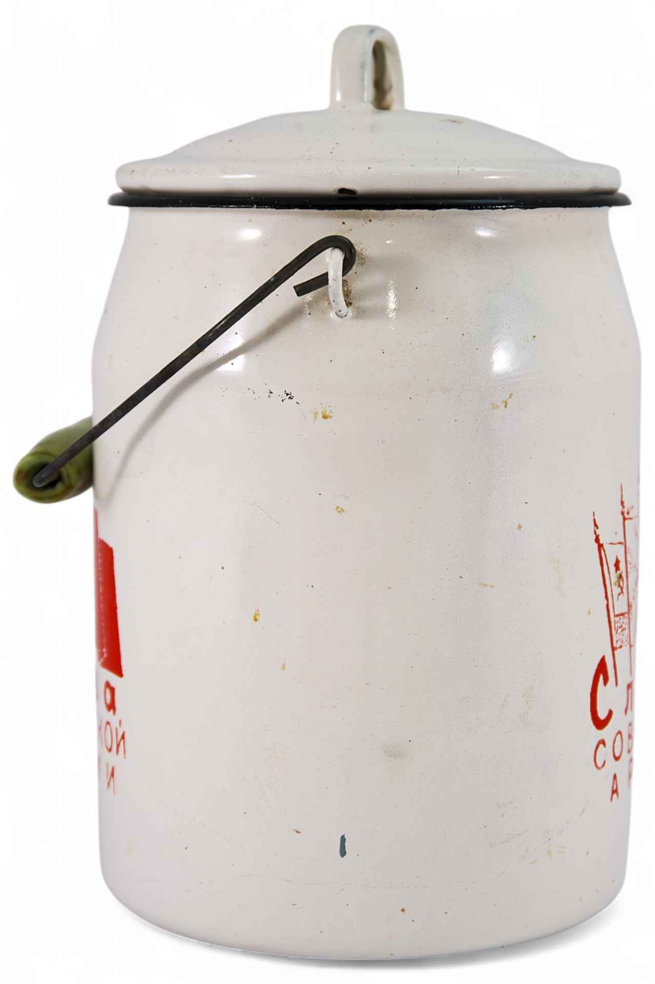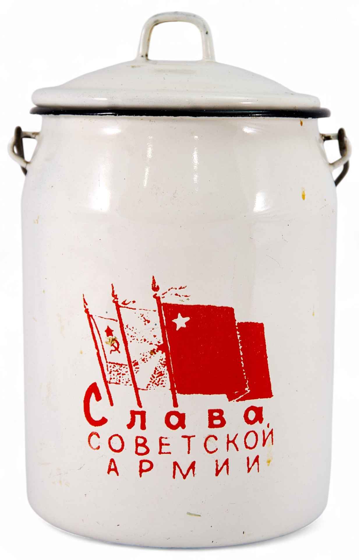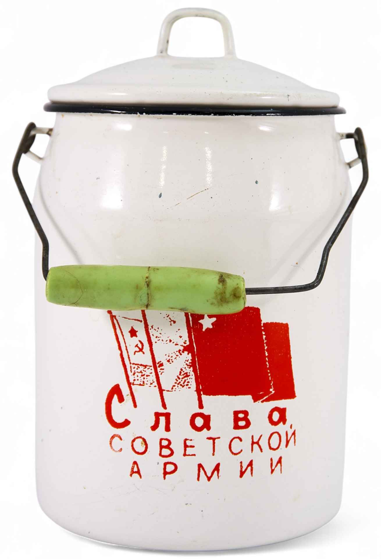 Бидон цилиндрической формы с крышкой и ручкой. На тулове изображены три флага родов войск СССР и надпись “Слава Советской Армии”. Бидон вагкостью три литра предназначен для хранения воды, кваса, молока и других пищевых жидкостей.